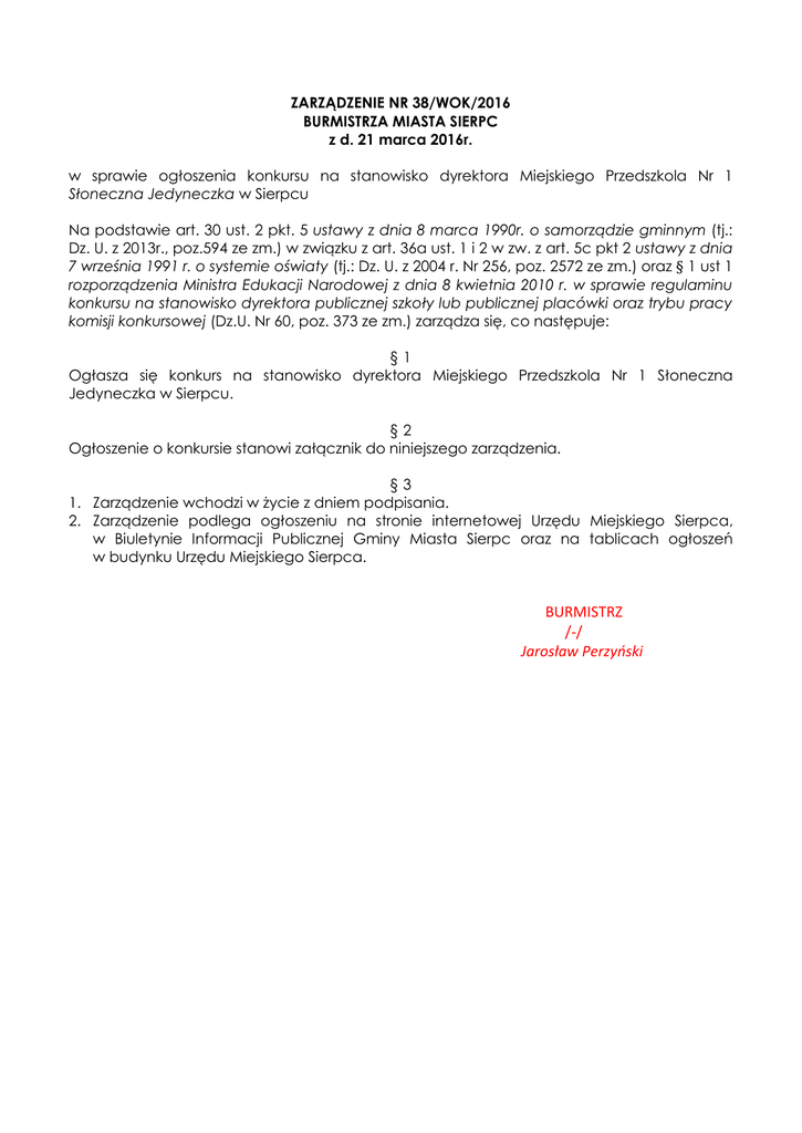 ZARZĄDZENIE NR 38/WOK/2016 BURMISTRZA MIASTA SIERPC z d. 21 marca 2016r. w sprawie ogłoszenia konkursu na stanowisko dyrektora Miejskiego Przedszkola Nr 1 Słoneczna Jedyneczka w Sierpcu Na podstawie art. 30 ust. 2 pkt. 5 ustawy z dnia 8 marca 1990r. o samorządzie gminnym (tj.: Dz. U. z 2013r., poz.594 ze zm.) w związku z art. 36a ust. 1 i 2 w zw. z art. 5c pkt 2 ustawy z dnia 7 września 1991 r. o systemie oświaty (tj.: Dz. U. z 2004 r. Nr 256, poz. 2572 ze zm.) oraz § 1 ust 1 rozporządzenia Ministra Edukacji Narodowej z dnia 8 kwietnia 2010 r. w sprawie regulaminu konkursu na stanowisko dyrektora publicznej szkoły lub publicznej placówki oraz trybu pracy komisji konkursowej (Dz.U. Nr 60, poz. 373 ze zm.) zarządza się, co następuje: §1 Ogłasza się konkurs na stanowisko dyrektora Miejskiego Przedszkola Nr 1 Słoneczna Jedyneczka w Sierpcu. §2 Ogłoszenie o konkursie stanowi załącznik do niniejszego zarządzenia. §3 1. Zarządzenie wchodzi w życie z dniem podpisania. 2. Zarządzenie podlega ogłoszeniu na stronie internetowej Urzędu Miejskiego Sierpca, w Biuletynie Informacji Publicznej Gminy Miasta Sierpc oraz na tablicach ogłoszeń w budynku Urzędu Miejskiego Sierpca. BURMISTRZ /-/ Jarosław Perzyński Załącznik do Zarządzenia Nr 38/WOK/2016 BMS z d. 21 marca 2016 r. BURMISTRZ MIASTA SIERPC I. II. ogłasza konkurs na stanowisko Dyrektora Miejskiego Przedszkola Nr 1 Słoneczna Jedyneczka w Sierpcu ul. Kwiatowa 4 09-200 Sierpc Do konkursu może przystąpić osoba, która spełnia wymagania określone w rozporządzeniu Ministra Edukacji Narodowej z dnia 27 października 2009r. w sprawie wymagań, jakim powinna odpowiadać osoba zajmująca stanowisko dyrektora oraz inne stanowiska kierownicze w poszczególnych typach publicznych szkół i rodzajach publicznych placówek (Dz.U. Nr 184, poz.1436 ze zm.). Oferta osoby przystępującej do konkursu powinna zawierać następujące dokumenty: a) uzasadnienie przystąpienia do konkursu oraz koncepcję funkcjonowania i rozwoju przedszkola, b) poświadczoną przez kandydata za zgodność z oryginałem kopię dowodu osobistego lub innego dokumentu potwierdzającego tożsamość oraz poświadczającego obywatelstwo kandydata, c) życiorys z opisem przebiegu pracy zawodowej, zawierający w szczególności informację o stażu pracy pedagogicznej - w przypadku nauczyciela lub stażu pracy dydaktycznej - w przypadku nauczyciela akademickiego, albo stażu pracy, w tym stażu pracy na stanowisku kierowniczym – w przypadku osoby niebędącej nauczycielem, d) oryginały lub poświadczone przez kandydata za zgodność z oryginałem kopie dokumentów potwierdzających posiadanie wymaganego stażu pracy, o którym mowa w lit. c, e) oryginały lub poświadczone przez kandydata za zgodność z oryginałem kopie dokumentów potwierdzających posiadanie wymaganego wykształcenia, w tym dyplomu ukończenia studiów wyższych lub świadectwa ukończenia studiów podyplomowych z zakresu zarządzania albo świadectwa ukończenia kursu kwalifikacyjnego z zakresu zarządzania oświatą, f) zaświadczenie lekarskie o braku przeciwwskazań zdrowotnych do wykonywania pracy na stanowisku kierowniczym, g) oświadczenie, że przeciwko kandydatowi nie toczy się postępowanie o przestępstwo ścigane z oskarżenia publicznego lub postępowanie dyscyplinarne, h) oświadczenie, że kandydat nie był skazany prawomocnym wyrokiem za umyślne przestępstwo lub umyślne przestępstwo skarbowe, i) oświadczenie, że kandydat nie był karany zakazem pełnienia funkcji związanych z dysponowaniem środkami publicznymi, o którym mowa w art. 31 ust. 1 pkt 4 ustawy z dnia 17 grudnia 2004r. o odpowiedzialności za naruszenie dyscypliny finansów publicznych (Dz U z 2005r. Nr 14, poz. 114 ze zm.), j) oryginał lub poświadczoną przez kandydata za zgodność z oryginałem kopię aktu nadania stopnia nauczyciela mianowanego lub dyplomowanego – w przypadku nauczyciela, k) oryginał lub poświadczoną przez kandydata za zgodność z oryginałem kopię karty oceny pracy lub oceny dorobku zawodowego – w przypadku nauczyciela i nauczyciela akademickiego, l) oświadczenie, że kandydat nie był karany karą dyscyplinarną, o której mowa w art. 76 ust. 1 ustawy z dnia 26 stycznia 1982 r. - Karta Nauczyciela (jt.:Dz.U. z 2006 r. Nr 97, poz. 674 ze zmianami) lub w art. 140 ust. 1 ustawy z dnia 27 lipca 2005r. – Prawo o szkolnictwie wyższym (Dz. U. Nr 164, poz. 1365 ze zm.) – w przypadku nauczyciela i nauczyciela akademickiego, m) oświadczenie, że kandydat ma pełną zdolność do czynności prawnych i korzysta z pełni praw publicznych – w przypadku osoby nie będącej nauczycielem, n) oświadczenie, że kandydat wyraża zgodę na przetwarzanie swoich danych osobowych zgodnie z ustawą z dnia 29 sierpnia 1997 r. o ochronie danych osobowych (Dz.U. z 2002 r. Nr 101, poz. 926 ze zm.) w celach przeprowadzenia konkursu na stanowisko dyrektora. III. Oferty należy dostarczyć osobiście lub drogą pocztową w zamkniętych kopertach z podanym adresem do korespondencji, telefonem kontaktowym i dopiskiem „Konkurs na stanowisko Dyrektora Miejskiego Przedszkola Nr 1 Słoneczna Jedyneczka w Sierpcu” w terminie do 7 kwietnia 2016r. roku do godz.1530 (decyduje data i godzina wpływu do adresata) pod adres: URZĄD MIEJSKI W SIERPCU ul. Piastowska 11a 09-200 SIERPC sekretariat (pok. nr 12) IV. O terminie oraz miejscu przeprowadzenia postępowania konkursowego kandydaci zostaną powiadomieni indywidualnie w formie pisemnej nie później niż 7 dni przed posiedzeniem komisji.
