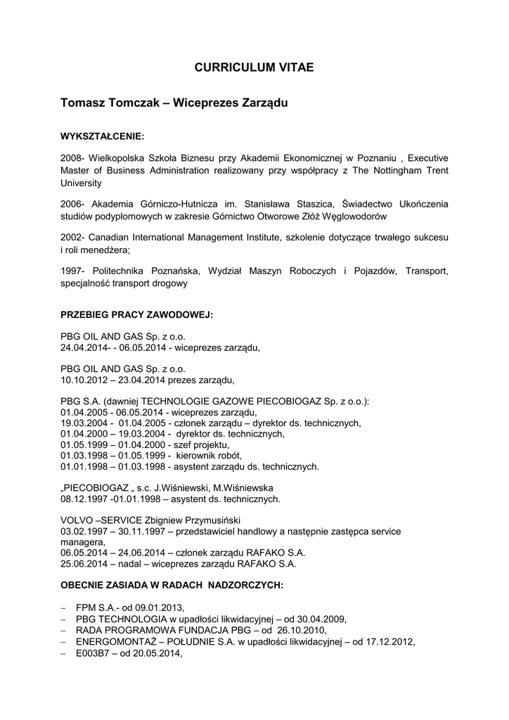 CURRICULUM VITAE Tomasz Tomczak – Wiceprezes Zarządu WYKSZTAŁCENIE: 2008- Wielkopolska Szkoła Biznesu przy Akademii Ekonomicznej w Poznaniu , Executive Master of Business Administration realizowany przy współpracy z The Nottingham Trent University 2006- Akademia Górniczo-Hutnicza im. Stanisława Staszica, Świadectwo Ukończenia studiów podyplomowych w zakresie Górnictwo Otworowe Złóż Węglowodorów 2002- Canadian International Management Institute, szkolenie dotyczące trwałego sukcesu i roli menedżera; 1997- Politechnika Poznańska, Wydział Maszyn Roboczych i Pojazdów, Transport, specjalność transport drogowy PRZEBIEG PRACY ZAWODOWEJ: PBG OIL AND GAS Sp. z o.o. 24.04.2014- - 06.05.2014 - wiceprezes zarządu, PBG OIL AND GAS Sp. z o.o. 10.10.2012 – 23.04.2014 prezes zarządu, PBG S.A. (dawniej TECHNOLOGIE GAZOWE PIECOBIOGAZ Sp. z o.o.): 01.04.2005 - 06.05.2014 - wiceprezes zarządu, 19.03.2004 - 01.04.2005 - członek zarządu – dyrektor ds. technicznych, 01.04.2000 – 19.03.2004 - dyrektor ds. technicznych, 01.05.1999 – 01.04.2000 - szef projektu, 01.03.1998 – 01.05.1999 - kierownik robót, 01.01.1998 – 01.03.1998 - asystent zarządu ds. technicznych. „PIECOBIOGAZ „ s.c. J.Wiśniewski, M.Wiśniewska 08.12.1997 -01.01.1998 – asystent ds. technicznych. VOLVO –SERVICE Zbigniew Przymusiński 03.02.1997 – 30.11.1997 – przedstawiciel handlowy a następnie zastępca service managera, 06.05.2014 – 24.06.2014 – członek zarządu RAFAKO S.A. 25.06.2014 – nadal – wiceprezes zarządu RAFAKO S.A. OBECNIE ZASIADA W RADACH NADZORCZYCH: − − − − − FPM S.A.- od 09.01.2013, PBG TECHNOLOGIA w upadłości likwidacyjnej – od 30.04.2009, RADA PROGRAMOWA FUNDACJA PBG – od 26.10.2010, ENERGOMONTAŻ – POŁUDNIE S.A. w upadłości likwidacyjnej – od 17.12.2012, E003B7 – od 20.05.2014, − Rafako Engineering Sp. z o.o. - od 26.06.2014, ZAŚWIADCZENIA: 2004 – Dyrektor Okręgowego Urzędu Górniczego w Poznaniu, Świadectwo do zatrudnienia na stanowisku osoby średniego dozoru technicznego ruchu o specjalności technicznej mechanicznej w zakładach górniczych wydobywających otworami wiertniczymi ropę naftową i gaz ziemny, 2004 – Armsystem, zaświadczenie nr 2436/2004 uczestnictwa w szkoleniu „ Integracja systemów Wymagania normy PN-EN ISO 14001:1998. Aspekty środowiskowe . Wymagania normy PN-N-18001:2004. Ryzyko zawodowe”, 2004 – Gdańska Fundacja Kształcenia Menedżerów – Świadectwo uczestnictwa w szkoleniu Finansowa logika podejmowania decyzji biznesowych, 2004 – SITPNiG Komisja Kwalifikacyjna nr 204, Świadectwo Kwalifikacyjne nr 134/04/204 uprawniające do zajmowania się eksploatacją urządzeń, instalacji i sieci na stanowisku DOZORU w zakresie obsługi, konserwacji, montażu, prac kontrolno-pomiarowych dla urządzeń GRUPY 3, 2004 – SITPNiG Komisja Kwalifikacyjna nr 204, Świadectwo Kwalifikacyjne nr 133/04/204 uprawniające do zajmowania się eksploatacją urządzeń, instalacji i sieci na stanowisku DOZORU w zakresie obsługi, konserwacji, montażu, prac kontrolno-pomiarowych dla urządzeń GRUPY 2, 2002 – Negocjator. Agencja Usług Szkoleniowych i Doradztwa Personalnego, ukończenie szkolenia: Sztuka prowadzenia profesjonalnej prezentacji, 2001 – BVQI – warsztaty uzupełniające dla auditorów.