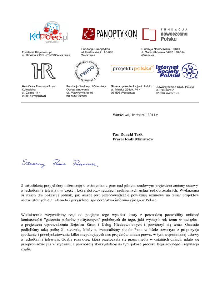 Fundacja Kidprotect.pl ul. Dzielna 21/83 · 01-029 Warszawa Helsińska Fundacja Praw Człowieka ul. Zgoda 11 · 00-018 Warszawa Fundacja Panoptykon ul. Królewska 2 · 00-065 Warszawa Fundacja Wolnego i Otwartego Oprogramowania ul. Wawrzyniaka 10 · 60-505 Poznań Fundacja Nowoczesna Polska ul. Marszałkowska 84/92 · 00-514 Warszawa Stowarzyszenie Projekt: Polska ul. Mińska 25 lok. 74 · 03-808 Warszawa Stowarzyszenie ISOC Polska ul. Pasteura 7 02-093 Warszawa Warszawa, 16 marca 2011 r. Pan Donald Tusk Prezes Rady Ministrów Z satysfakcją przyjęliśmy informację o wstrzymaniu prac nad pilnym rządowym projektem zmiany ustawy o radiofonii i telewizji w części, która dotyczy regulacji nielinernych usług audiowizualnych. Wydarzenia ostatnich dni pokazują jednak, jak ważne jest przeprowadzenie poważnej rozmowy na temat projektów ustaw istotnych dla Internetu i przyszłości społeczeństwa informacyjnego w Polsce. Wielokrotnie wzywaliśmy rząd do podjęcia tego wysiłku, który z pewnością pozwoliłby uniknąć konieczności "gaszenia pożarów politycznych" podobnych do tego, jaki wystąpił rok temu w związku z projektem wprowadzenia Rejestru Stron i Usług Niedozwolonych i powtórzył się teraz. Ostatnio podjęliśmy taką próbę 21 stycznia, kiedy to zwracaliśmy się do Pana w liście otwartym z propozycją spotkania i przedyskutowania kilku niepokojących nas projektów zmian prawa, w tym wspomnianej ustawy o radiofonii i telewizji. Gdyby rozmowę, która przetoczyła się przez media w ostatnich dniach, udało się przeprowadzić już w styczniu, z pewnością skorzystałaby na tym jakość procesu legislacyjnego i reputacja rządu. Minął już ponad rok od Pańskiego spotkania z blogerami oraz przedstawicielami organizacji pozarządowych, które odbyło się 5 lutego 2010 r. Wszyscy pamiętamy efekt "okrągłego stołu Internetu", jaki wówczas osiągnięto - doszło do otwartego, publicznego spotkania dwóch stron i partnerskiej wymiany poglądów, nie tylko na temat konieczności zagwarantowania praw podstawowych w Internecie. Rozmawialiśmy wówczas także o postulacie konsultowania ze społeczeństwem obywatelskim wszystkich projektów zmian prawa istotnych dla przyszłości społeczeństwa informacyjnego. Na spotkaniu 5 lutego obiecał Pan wdrożenie realnych procedur konsultacji społecznych. Rozmawialiśmy o przedstawieniu stronie społecznej wyczerpującej listy projektów aktów prawnych, które mają wpływ na przyszłość społeczeństwa informacyjnego i zamrożeniu prac nad nimi do czasu przeprowadzenia realnych konsultacji. Obiecał Pan także doprowadzenie do kolejnego spotkania w przeciągu miesiąca, powiedział Pan, że to kwestia raczej "dni niż tygodni". Po tym spotkaniu mieliśmy nadzieję, że jest to początek rozmowy na temat zagwarantowania praw podstawowych w przestrzeni komunikacyjnej, jaką wyznaczają nowe technologie. Jednak nie wszystkie obietnice zostały zrealizowane. Panie Premierze - po raz kolejny pragniemy zwrócić Pańską uwagę na to, że poruszane rok temu tematy nadal są aktualne. Najlepszym tego przykładem jest wspomniany projekt uregulowania nielinearnych usług audiowizualnych w Internecie w ustawie o radiofonii i telewizji. Ale to nie koniec. Pod hasłem blokowania dostępu do stron internetowych zawierających obrazy seksualnego wykorzystywania dzieci wrócił pomysł cenzurowania sieci, tym razem w formie propozycji unijnej dyrektywy, którą polski Rząd oficjalnie popiera. Coraz większe kontrowersje społeczne budzi fakt rutynowego zbierania, przechowywania i udostępniania służbom danych telekomunikacyjnych bez kontroli sądu, co budzi zdziwienie nawet urzędników odpowiedzialnych za wdrożenie retencji danych w Unii Europejskiej oraz poważne zaniepokojenie Rzecznik Praw Obywatelskich (wyrażone w skierowanym do Pana wystąpieniu z 17 stycznia). Kolejne tematy, które wymagają uwagi, to planowane zmiany w Prawie Telekomunikacyjnym oraz nowe założenia do ustawy o powtórnym wykorzystaniu informacji z sektora publicznego. W tym kontekście ucieszyło nas Pańskie zapewnienie, złożone dziś podczas rozmowy z mediami, że rząd jest gotów do poważnej rozmowy na temat uregulowania mediów internetowych ze środowiskami, które reprezentują społeczności internetowe oraz z przedstawicielami Komisji Europejskiej. Chcemy jednak podkreślić, iż konieczne jest poszerzenie spektrum dyskusji - a tym samym biorących w niej udział ekspertów po stronie rządu - o wymienione powyżej obszary. Prawa podstawowe w Internecie muszą być zagwarantowane nie tylko w sferze wolności wypowiedzi, ale także prawa do informacji, niedyskryminacji, dostępu do dóbr kultury, prywatności i tajemnicy korespondencji. 2 Tym samym powracamy do propozycji zorganizowania kolejnego spotkania - z Pana osobistym udziałem lub z ministrami zaangażowanymi we wspomniane projekty, t.j. z min. Michałem Bonim i min. Magdaleną Gaj, a także z przedstawicielami Ministerstwa Infrastruktury, Ministerstwa Sprawiedliwości, Ministerstwa Kultury i Dziedzictwa Narodowego, RCL i Zespołu Doradców Strategicznych Premiera. Takie spotkanie to szansa nacoś więcej, niż kolejną ogólną dyskusję przy okrągłym stole. Liczymy na rzetelną i szczegółową rozmowę o aktualnych problemach i wyzwaniach regulacyjnych w sferze komunikacji elektronicznej. Jakub Śpiewak Prezes Fundacji Kidprotect.pl Katarzyna Szymielewicz Prezes Zarządu Fundacji Panoptykon Jarosław Lipszyc Prezes Fundacji Nowoczesna Polska dr Adam Bodnar Sekretarz Zarządu Helsińskiej Fundacji Praw Człowieka 3 Rafał Brzychcy Prezes Fundacji Wolnego i Otwartego Oprogramowania Adam Szłapka Sekretarz Generalny Stowarzyszenia Projekt: Polska Marcin Cieślak Prezes Zarządu Internet Society Poland ISOC-PL