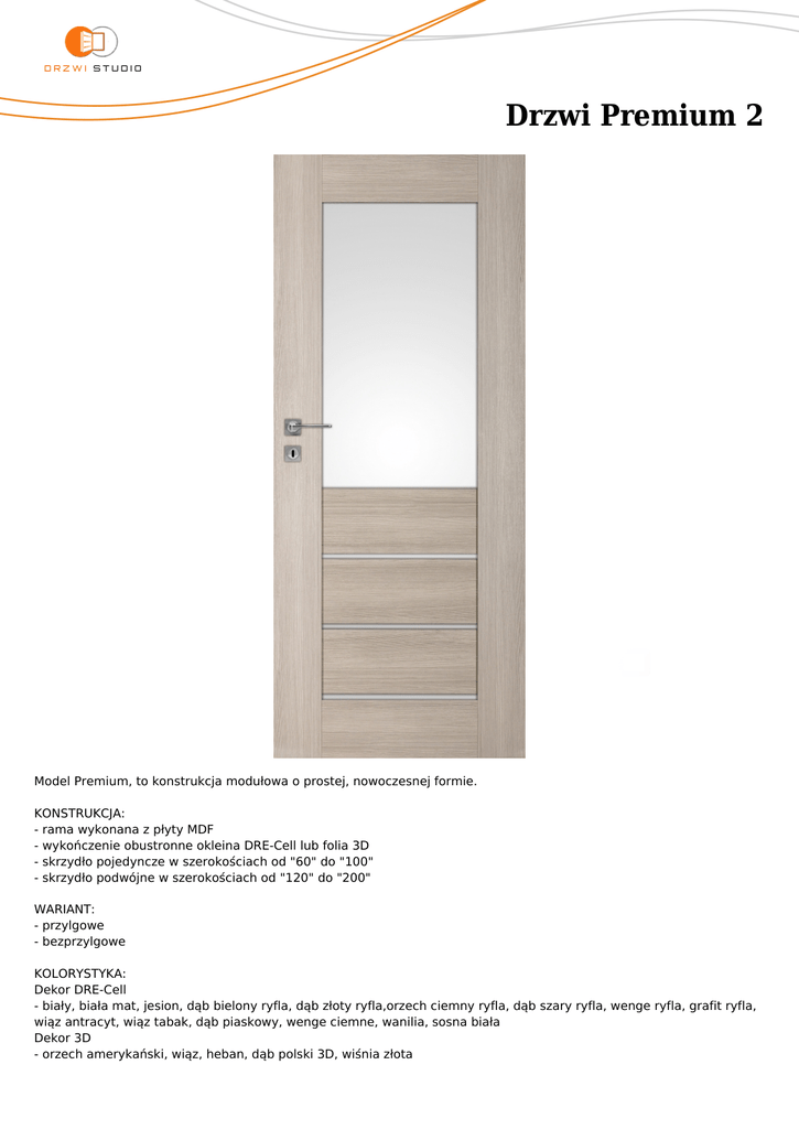 Drzwi Premium 2 Model Premium, to konstrukcja modułowa o prostej, nowoczesnej formie. KONSTRUKCJA: - rama wykonana z płyty MDF - wykończenie obustronne okleina DRE-Cell lub folia 3D - skrzydło pojedyncze w szerokościach od "60" do "100" - skrzydło podwójne w szerokościach od "120" do "200" WARIANT: - przylgowe - bezprzylgowe KOLORYSTYKA: Dekor DRE-Cell - biały, biała mat, jesion, dąb bielony ryfla, dąb złoty ryfla,orzech ciemny ryfla, dąb szary ryfla, wenge ryfla, grafit ryfla, wiąz antracyt, wiąz tabak, dąb piaskowy, wenge ciemne, wanilia, sosna biała Dekor 3D - orzech amerykański, wiąz, heban, dąb polski 3D, wiśnia złota SZYBY: - Decormat, Decormat Brąz, Decormat Grafit, Przeźroczysta.