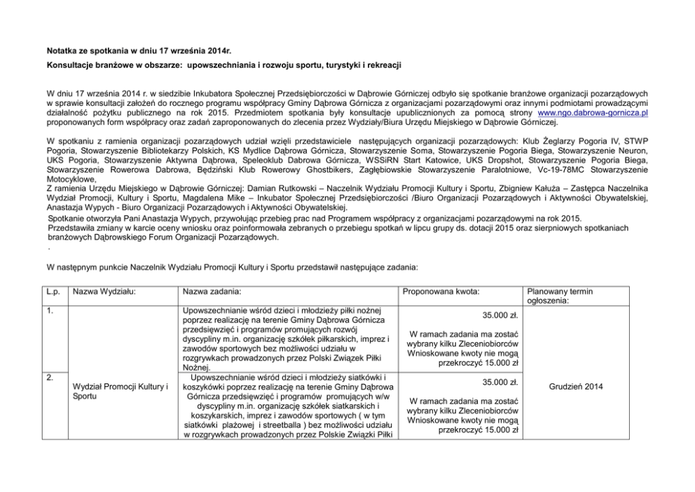 Notatka ze spotkania w dniu 17 września 2014r. Konsultacje branżowe w obszarze: upowszechniania i rozwoju sportu, turystyki i rekreacji W dniu 17 września 2014 r. w siedzibie Inkubatora Społecznej Przedsiębiorczości w Dąbrowie Górniczej odbyło się spotkanie branżowe organizacji pozarządowych w sprawie konsultacji założeń do rocznego programu współpracy Gminy Dąbrowa Górnicza z organizacjami pozarządowymi oraz innymi podmiotami prowadzącymi działalność pożytku publicznego na rok 2015. Przedmiotem spotkania były konsultacje upublicznionych za pomocą strony www.ngo.dabrowa-gornicza.pl proponowanych form współpracy oraz zadań zaproponowanych do zlecenia przez Wydziały/Biura Urzędu Miejskiego w Dąbrowie Górniczej. W spotkaniu z ramienia organizacji pozarządowych udział wzięli przedstawiciele następujących organizacji pozarządowych: Klub Żeglarzy Pogoria IV, STWP Pogoria, Stowarzyszenie Bibliotekarzy Polskich, KS Mydlice Dąbrowa Górnicza, Stowarzyszenie Soma, Stowarzyszenie Pogoria Biega, Stowarzyszenie Neuron, UKS Pogoria, Stowarzyszenie Aktywna Dąbrowa, Speleoklub Dabrowa Górnicza, WSSiRN Start Katowice, UKS Dropshot, Stowarzyszenie Pogoria Biega, Stowarzyszenie Rowerowa Dabrowa, Będziński Klub Rowerowy Ghostbikers, Zagłębiowskie Stowarzyszenie Paralotniowe, Vc-19-78MC Stowarzyszenie Motocyklowe, Z ramienia Urzędu Miejskiego w Dąbrowie Górniczej: Damian Rutkowski – Naczelnik Wydziału Promocji Kultury i Sportu, Zbigniew Kałuża – Zastępca Naczelnika Wydział Promocji, Kultury i Sportu, Magdalena Mike – Inkubator Społecznej Przedsiębiorczości /Biuro Organizacji Pozarządowych i Aktywności Obywatelskiej, Anastazja Wypych - Biuro Organizacji Pozarządowych i Aktywności Obywatelskiej. Spotkanie otworzyła Pani Anastazja Wypych, przywołując przebieg prac nad Programem współpracy z organizacjami pozarządowymi na rok 2015. Przedstawiła zmiany w karcie oceny wniosku oraz poinformowała zebranych o przebiegu spotkań w lipcu grupy ds. dotacji 2015 oraz sierpniowych spotkaniach branżowych Dąbrowskiego Forum Organizacji Pozarządowych. . W następnym punkcie Naczelnik Wydziału Promocji Kultury i Sportu przedstawił następujące zadania: L.p. Nazwa Wydziału: 1. 2. Wydział Promocji Kultury i Sportu Nazwa zadania: Upowszechnianie wśród dzieci i młodzieży piłki nożnej poprzez realizację na terenie Gminy Dąbrowa Górnicza przedsięwzięć i programów promujących rozwój dyscypliny m.in. organizację szkółek piłkarskich, imprez i zawodów sportowych bez możliwości udziału w rozgrywkach prowadzonych przez Polski Związek Piłki Nożnej. Upowszechnianie wśród dzieci i młodzieży siatkówki i koszykówki poprzez realizację na terenie Gminy Dąbrowa Górnicza przedsięwzięć i programów promujących w/w dyscypliny m.in. organizację szkółek siatkarskich i koszykarskich, imprez i zawodów sportowych ( w tym siatkówki plażowej i streetballa ) bez możliwości udziału w rozgrywkach prowadzonych przez Polskie Związki Piłki Proponowana kwota: Planowany termin ogłoszenia: 35.000 zł. W ramach zadania ma zostać wybrany kilku Zleceniobiorców Wnioskowane kwoty nie mogą przekroczyć 15.000 zł 35.000 zł. W ramach zadania ma zostać wybrany kilku Zleceniobiorców Wnioskowane kwoty nie mogą przekroczyć 15.000 zł Grudzień 2014 Siatkowej oraz Koszykówki. 3. Organizacja na terenie Gminy Dąbrowa Górnicza imprez i zawodów sportowych o zasięgu lokalnym, regionalnym, ogólnopolskim i międzynarodowym w zakresie dyscyplin: biegi, kolarstwo, nordic walking, rolkarstwo. Organizacja na terenie Gminy Dąbrowa Górnicza imprez i zawodów sportowych o zasięgu lokalnym, regionalnym, ogólnopolskim i międzynarodowym w zakresie: żeglarstwa, windsurfingu, wędkarstwa sportowego, nart wodnych, triathlonu 4. 5. Organizacja na terenie Gminy w ramach Dębowego Maj Festiwalu 2015 imprez, zawodów i pokazów sportoworekreacyjnych. 6. Wydział Promocji Kultury i Sportu Organizacja na terenie Gminy Dąbrowa Górnicza imprez i zawodów sportowych o zasięgu lokalnym, regionalnym, ogólnopolskim i międzynarodowym w sportach walki: boks, kick-boxing, wschodnie sztuki walki. 7. Organizacja dla dzieci i młodzieży imprez sportoworekreacyjnych i turystycznych w ramach dąbrowskiej akcji „Lato” i „Zima” w mieście. 8. Organizacja dla mieszkańców miasta, na terenie Gminy Dąbrowa Górnicza, jak również poza jej granicami imprez sportowo-rekreacyjnych i turystycznych. 9. Organizacja na terenie Gminy Dąbrowa Górnicza dla młodzieży i mieszkańców miasta przedsięwzięć i programów usportowienia w zakresie różnych dyscyplin sportu bez możliwości udziału w zawodach, imprezach, rozgrywkach itp. prowadzonych przez polskie związki sportowe. 35.000 zł. W ramach zadania ma zostać wybrany kilku Zleceniobiorców Wnioskowane kwoty nie mogą przekroczyć 10.000 zł 50.000 zł. W ramach zadania ma zostać wybrany kilku Zleceniobiorców Wnioskowane kwoty nie mogą przekroczyć 10.000 zł 30.000 zł. W ramach zadania ma zostać wybrany kilku Zleceniobiorców Wnioskowane kwoty nie mogą przekroczyć 10.000 zł 30.000 zł. W ramach zadania ma zostać wybrany kilku Zleceniobiorców Wnioskowane kwoty nie mogą przekroczyć 10.000 zł 50.000 zł. W ramach zadania ma zostać wybrany kilku Zleceniobiorców Wnioskowane kwoty nie mogą przekroczyć 10.000 zł 20.000 zł. W ramach zadania ma zostać wybrany kilku Zleceniobiorców Wnioskowane kwoty nie mogą przekroczyć 10.000 zł 35.000 zł. W ramach zadania ma zostać wybrany kilku Zleceniobiorców Wnioskowane kwoty nie mogą przekroczyć 10.000 zł Grudzień 2014 10. Organizacja w dąbrowskich placówkach oświatowych pozalekcyjnych zajęć sportowo-rekreacyjnych dla młodzieży szkolnej uczestniczącej w międzyszkolnej rywalizacji sportowej. 120.000 zł. W ramach zadania ma zostać wybrany jeden Zleceniobiorca. W związku z propozycją organizacji pozarządowych podczas spotkania