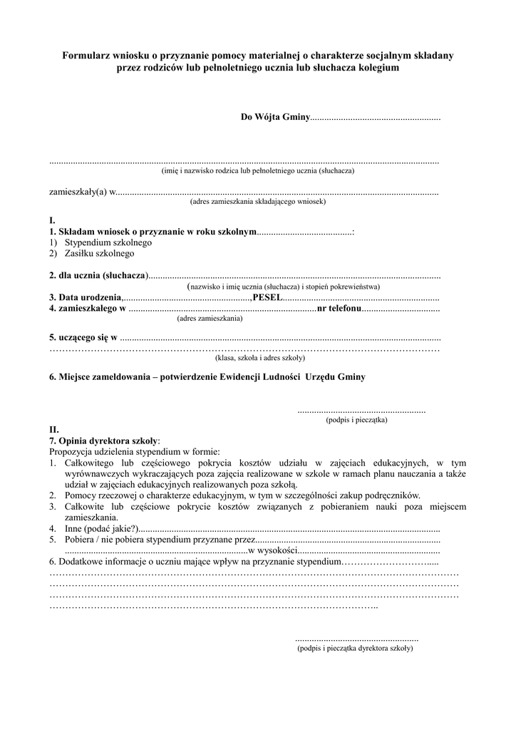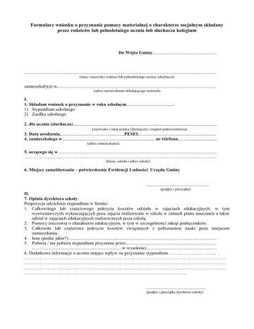 Formularz wniosku o przyznanie pomocy materialnej o charakterze socjalnym składany przez rodziców lub pełnoletniego ucznia lub słuchacza kolegium Do Wójta Gminy....................................................... .................................................................................................................................................................... (imię i nazwisko rodzica lub pełnoletniego ucznia (słuchacza) zamieszkały(a) w........................................................................................................................................ (adres zamieszkania składającego wniosek) I. 1. Składam wniosek o przyznanie w roku szkolnym........................................: 1) Stypendium szkolnego 2) Zasiłku szkolnego 2. dla ucznia (słuchacza)........................................................................................................................... ( nazwisko i imię ucznia (słuchacza) i stopień pokrewieństwa) 3. Data urodzenia,.....................................................,PESEL.................................................................. 4. zamieszkałego w ...............................................................................nr telefonu................................. (adres zamieszkania) 5. uczącego się w ....................................................................................................................................... …………………………………………………………………………………………………………… (klasa, szkoła i adres szkoły) 6. Miejsce zameldowania – potwierdzenie Ewidencji Ludności Urzędu Gminy ...................................................... (podpis i pieczątka) II. 7. Opinia dyrektora szkoły: Propozycja udzielenia stypendium w formie: 1. Całkowitego lub częściowego pokrycia kosztów udziału w zajęciach edukacyjnych, w tym wyrównawczych wykraczających poza zajęcia realizowane w szkole w ramach planu nauczania a także udział w zajęciach edukacyjnych realizowanych poza szkołą. 2. Pomocy rzeczowej o charakterze edukacyjnym, w tym w szczególności zakup podręczników. 3. Całkowite lub częściowe pokrycie kosztów związanych z pobieraniem nauki poza miejscem zamieszkania. 4. Inne (podać jakie?)............................................................................................................................... 5. Pobiera / nie pobiera stypendium przyznane przez.............................................................................. .............................................................................w wysokości............................................................ 6. Dodatkowe informacje o uczniu mające wpływ na przyznanie stypendium………………………..... ………………………………………………………………………………………………………………… ………………………………………………………………………………………………………………… ………………………………………………………………………………………………………………… ………………………………………………………………………………………….. .................................................... (podpis i pieczątka dyrektora szkoły) 8. Pobieram / nie pobieram stypendium...............................w wysokości............................................. przyznane przez........................................................................................................................................ …………………………………………………………………………………………………………… III. 9. Dane uzasadniające przyznanie stypendium szkolnego. Należy zakreślić występujące w rodzinie dysfunkcje: - bezrobocie - niepełnosprawność - ciężka lub długotrwała choroba - trudności opiek. – wychow. - alkoholizm, narkomania - zdarzenie losowe jakie, opis:................................................................................................................................................... - inne opis:.............................................................................................................................................. IV. 10. Proszę o przyznanie stypendium szkolnego w formie: - pieniężnej - rzeczowej (określić jaka?)............................................................................................................................................ .................................................................................................................................................................... .................................................... (podpis rodzica lub opiekuna) V. 11. Dane o stanie rodziny i o dochodach. Świadomy(a) odpowiedzialności za podanie nieprawdziwych danych oświadczam, że 1) moja rodzina składa się z .............niżej wymienionych osób pozostających we wspólnym gospodarstwie domowym, Lp Imię i nazwisko Data urodzenia PESEL Miejsce pracy - nauki Stopień pokrewieństw a 3) członkowie mojej rodziny: - posiadają / nie posiadają gospodarstwo rolne o pow................ha przeliczeniowego – potwierdzone przez odpowiedni Urząd Gminy:......................................................................................................... ................................................................................................................................................................... ................................................................................................................................................................... ………………………………. Podpis i pieczątka prowadzą / nie prowadzą pozarolniczą działalność gospodarczą 4) łączne miesięczne