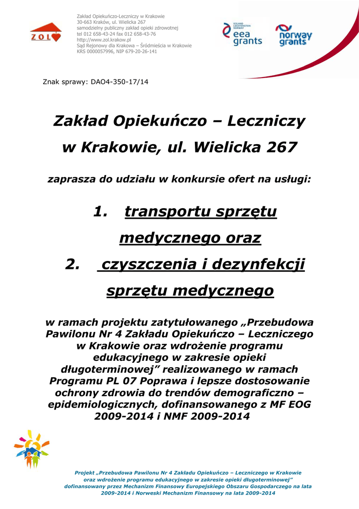 Zakład Opiekuńczo-Leczniczy w Krakowie 30-663 Kraków, ul. Wielicka 267 samodzielny publiczny zakład opieki zdrowotnej tel 012 658-43-24 fax 012 658-43-76 http://www.zol.krakow.pl Sąd Rejonowy dla Krakowa – Śródmieścia w Krakowie KRS 0000057996, NIP 679-20-26-141 Znak sprawy: DAO4-350-17/14 Zakład Opiekuńczo – Leczniczy w Krakowie, ul. Wielicka 267 zaprasza do udziału w konkursie ofert na usługi: 1. transportu sprzętu medycznego oraz 2. czyszczenia i dezynfekcji sprzętu medycznego w ramach projektu zatytułowanego „Przebudowa Pawilonu Nr 4 Zakładu Opiekuńczo – Leczniczego w Krakowie oraz wdrożenie programu edukacyjnego w zakresie opieki długoterminowej” realizowanego w ramach Programu PL 07 Poprawa i lepsze dostosowanie ochrony zdrowia do trendów demograficzno – epidemiologicznych, dofinansowanego z MF EOG 2009-2014 i NMF 2009-2014 Projekt „Przebudowa Pawilonu Nr 4 Zakładu Opiekuńczo – Leczniczego w Krakowie oraz wdrożenie programu edukacyjnego w zakresie opieki długoterminowej” dofinansowany przez Mechanizm Finansowy Europejskiego Obszaru Gospodarczego na lata 2009-2014 i Norweski Mechanizm Finansowy na lata 2009-2014 Zakład Opiekuńczo-Leczniczy w Krakowie 30-663 Kraków, ul. Wielicka 267 samodzielny publiczny zakład opieki zdrowotnej tel 012 658-43-24 fax 012 658-43-76 http://www.zol.krakow.pl Sąd Rejonowy dla Krakowa – Śródmieścia w Krakowie KRS 0000057996, NIP 679-20-26-141 Dane Zamawiającego Zakład Opiekuńczo – Leczniczy w Krakowie, ul. Wielicka 267, 30-663 Kraków. Nr telefonu: (12) 658-43-24. Nr faxu: (12) 658-43-76. e-mail: [email protected]; strona WWW: www.zol.krakow.pl Przedmiot zamówienia Nazwa zamówienia: 1. Usługa transportu sprzętu medycznego oraz pracownika Zamawiającego dokonującego oceny technicznej w/w sprzętu na potrzeby realizacji zadania dotyczącego wsparcia indywidualnego nad pacjentem, 2. Usługa czyszczenia i dezynfekcji sprzętu medycznego stanowiącego wyposażenie wypożyczalni prowadzonej przez ZOL w Krakowie, w ramach projektu zatytułowanego „Przebudowa Pawilonu Nr 4 Zakładu Opiekuńczo – Leczniczego w Krakowie oraz wdrożenie programu edukacyjnego w zakresie opieki długoterminowej” współfinansowanego ze środków MF EOG 2009-2014 i NMF 2009-2014 w ramach programu PL07 „Poprawa i lepsze dostosowanie ochrony zdrowia do trendów demograficzno – epidemiologicznych”. Rodzaj zamówienia: Usługi Opis przedmiotu zamówienia: Przedmiotem zamówienia są usługi: 1. transportu sprzętu medycznego w postaci: łóżek szpitalnych, materaców przeciwodleżynowych, wózków inwalidzkich, balkoników oraz pracownika Zamawiającego dokonującego oceny technicznej sprzętu samochodem bagażowym do 3,5 t z kierowcą w dni robocze i świąteczne oraz soboty i niedziele - całodobowo z miejsca/do miejsca wskazanego przez Zamawiającego, 2. czyszczenia i dezynfekcji sprzętu medycznego stanowiącego wyposażenie wypożyczalni prowadzonej przez ZOL w Krakowie tj. łóżek szpitalnych, materacy przeciwodleżynowych, balkoników oraz wózków inwalidzkich. Procesy czyszczenia i dezynfekcji odbywać się będą w siedzibie Zamawiającego tj. w ZOL w Krakowie ul. Wielicka 267, w specjalnie do tego celu wyznaczonych pomieszczeniach (zgodnie ze zgłaszanym Projekt „Przebudowa Pawilonu Nr 4 Zakładu Opiekuńczo – Leczniczego w Krakowie oraz wdrożenie programu edukacyjnego w zakresie opieki długoterminowej” dofinansowany przez Mechanizm Finansowy Europejskiego Obszaru Gospodarczego na lata 2009-2014 i Norweski Mechanizm Finansowy na lata 2009-2014 Zakład Opiekuńczo-Leczniczy w Krakowie 30-663 Kraków, ul. Wielicka 267 samodzielny publiczny zakład opieki zdrowotnej tel 012 658-43-24 fax 012 658-43-76 http://www.zol.krakow.pl Sąd Rejonowy dla Krakowa – Śródmieścia w Krakowie KRS 0000057996, NIP 679-20-26-141 zapotrzebowaniem: w dni robocze, soboty, niedziele i dni świąteczne). Zamówienie o wartości nieprzekraczającej wyrażonej w złotych równowartości kwoty, określonej w art. 4 pkt. 8 ustawy Prawo Zamówień Publicznych. Szczegółowy przedmiot zamówienia przedstawiono odpowiednio w załączniku nr 2A (usługa transportu) i 2B (usługa czyszczenia) do Ogłoszenia. Zamówienie podzielone na pakiety/części: TAK / NIE Wspólny Słownik Zamówień (CPV): 60000000-8; 50421000-2 Czas trwania lub termin realizacji zamówienia: od dnia zawarcia umowy do 30 kwietnia 2016 r. lub do wyczerpania środków finansowych przeznaczonych na realizację każdej z części przedmiotu zamówienia, określonych każdorazowo w §2 ust. 1 załączników nr 3A i 3B. Wymagane dokumenty lub oświadczenia 9 wypełniony i podpisany przez osobę(y) uprawnioną(e) do reprezentowania Wykonawcy formularz ofertowy stanowiący załącznik nr 1 do ogłoszenia. 9 podpisany wzór umowy stanowiący załącznik nr 3A (dot. części nr 1 – usługa transportu) i 3B (dot. części nr 2 – usługa czyszczenia) do ogłoszenia. 9 wykaz wykonanych usług dla poszczególnych części zamówienia, stanowiący załącznik nr 4A (dot. części nr 1 – usługa transportu) i 4B (dot. części nr 2 – usługa czyszczenia) do ogłoszenia – na podstawie tego wykazu Zamawiający dla każdej z części zamówienia zbada doświadczenie Wykonawcy niezbędne do prawidłowej realizacji zamówienia. W sytuacji braku wykazania przez Wykonawcę wymaganego przez Zamawiającego doświadczenia, zostanie on wykluczony z postępowania. Ofertę Wykonawcy wykluczonego uznaje się za odrzuconą. 9 oświadczenie o dysponowaniu odpowiednim taborem samochodowym do realizacji zamówienia, stanowiące załącznik nr 5 do ogłoszenia (dotyczy wyłącznie Wykonawcy składającego ofertę w części nr 1). 9 aktualny odpis z właściwego rejestru lub z centralnej ewidencji i informacji o działalności gospodarczej, wystawiony nie wcześniej niż 6 miesięcy przed upływem terminu składania ofert, jeżeli odrębne przepisy wymagają wpisu do rejestru lu