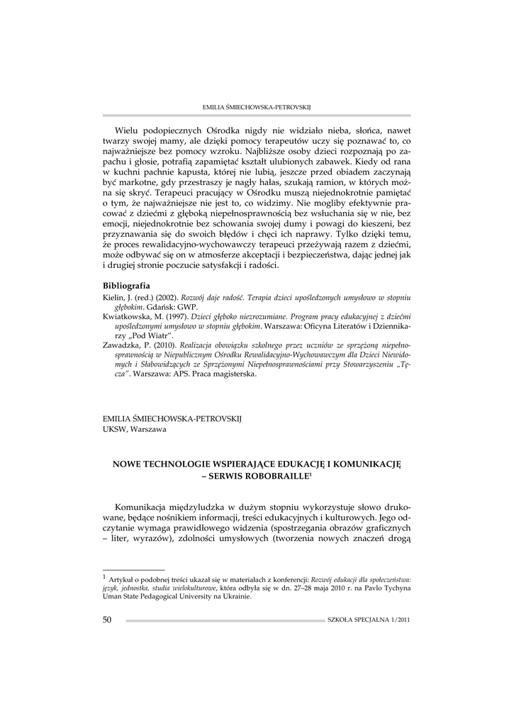 EMILIA ŚMIECHOWSKA-PETROVSKIJ Wielu podopiecznych Ośrodka nigdy nie widziało nieba, słońca, nawet twarzy swojej mamy, ale dzięki pomocy terapeutów uczy się poznawać to, co najważniejsze bez pomocy wzroku. Najbliższe osoby dzieci rozpoznają po zapachu i głosie, potrafią zapamiętać kształt ulubionych zabawek. Kiedy od rana w kuchni pachnie kapusta, której nie lubią, jeszcze przed obiadem zaczynają być markotne, gdy przestraszy je nagły hałas, szukają ramion, w których można się skryć. Terapeuci pracujący w Ośrodku muszą niejednokrotnie pamiętać o tym, że najważniejsze nie jest to, co widzimy. Nie mogliby efektywnie pracować z dziećmi z głęboką niepełnosprawnością bez wsłuchania się w nie, bez emocji, niejednokrotnie bez schowania swojej dumy i powagi do kieszeni, bez przyznawania się do swoich błędów i chęci ich naprawy. Tylko dzięki temu, że proces rewalidacyjno-wychowawczy terapeuci przeżywają razem z dziećmi, może odbywać się on w atmosferze akceptacji i bezpieczeństwa, dając jednej jak i drugiej stronie poczucie satysfakcji i radości. Bibliografia Kielin, J. (red.) (2002). Rozwój daje radość. Terapia dzieci upośledzonych umysłowo w stopniu głębokim. Gdańsk: GWP. Kwiatkowska, M. (1997). Dzieci głęboko niezrozumiane. Program pracy edukacyjnej z dziećmi upośledzonymi umysłowo w stopniu głębokim. Warszawa: Oficyna Literatów i Dziennikarzy „Pod Wiatr”. Zawadzka, P. (2010). Realizacja obowiązku szkolnego przez uczniów ze sprzężoną niepełnosprawnością w Niepublicznym Ośrodku Rewalidacyjno-Wychowawczym dla Dzieci Niewidomych i Słabowidzących ze Sprzężonymi Niepełnosprawnościami przy Stowarzyszeniu „Tęcza”. Warszawa: APS. Praca magisterska. EMILIA ŚMIECHOWSKA-PETROVSKIJ UKSW, Warszawa NOWE TECHNOLOGIE WSPIERAJĄCE EDUKACJĘ I KOMUNIKACJĘ – SERWIS ROBOBRAILLE1 Komunikacja międzyludzka w dużym stopniu wykorzystuje słowo drukowane, będące nośnikiem informacji, treści edukacyjnych i kulturowych. Jego odczytanie wymaga prawidłowego widzenia (spostrzegania obrazów graficznych – liter, wyrazów), zdolności umysłowych (tworzenia nowych znaczeń drogą 1 Artykuł o podobnej treści ukazał się w materiałach z konferencji: Rozwój edukacji dla społeczeństwa: język, jednostka, studia wielokulturowe, która odbyła się w dn. 27–28 maja 2010 r. na Pavlo Tychyna Uman State Pedagogical University na Ukrainie. 50 SZKO£A SPECJALNA 1/2011 NOWE TECHNOLOGIE WSPIERAJĄCE EDUKACJĘ I KOMUNIKACJĘ... manipulowania pojęciami) oraz opanowania techniki czytania i treningu w tym zakresie. Współcześnie brak zdolności lub znaczące ograniczenie umiejętności odczytywania tekstów drukowanych, wynikające z doświadczanych deficytów natury sensorycznej (uszkodzenia wzroku), umysłowej czy społecznej (analfabetyzmu), redukują możliwości międzyludzkiej komunikacji, a tym samym sprawnego funkcjonowania w społeczeństwie. Niemożność porozumiewania się za pomocą drukowanych informacji staje się powodem poznawczych i społecznych ograniczeń. Populację osób o ograniczonych możliwościach komunikowania się opartego na słowie drukowanym stanowią osoby z niepełnosprawnością wzrokową, osoby z zaburzeniami dyslektycznymi, szczególnie z zaburzeniami percepcji wzrokowej, pamięci wzrokowej oraz analizy i syntezy wzrokowej. Dynamicznie postępujący proces starzenia się społeczeństw prowadzi do powiększania się grupy najstarszych obywateli, często doznających w starszym wieku pogorszenia możliwości wzrokowych. Ta część społeczeństwa również doświadcza ograniczeń aktywności społecznej z powodu trudności w komunikacji bazującej na znakach drukowanych. Zgodnie z opinią M. Paplińskiej (2005, s. 178–179) specjalistyczny sprzęt przeznaczony dla niewidomych i słabowidzących, wykorzystujący najnowsze technologie, umożliwia osobom z uszkodzonym wzrokiem przekraczanie barier w dostępie do tekstów drukowanych. Do ich dyspozycji przeznaczono programy odczytu ekranu udostępniające zasoby środowiska Windows za pomocą mowy syntetycznej i monitorów brajlowskich. Wykorzystanie skanerów i syntezy mowy umożliwia odczytywanie zeskanowanego czarnodrukowego tekstu lub jego konwersję na brajla i drukowanie na drukarce brajlowskiej. W dobie wykorzystywania najnowszych technologii w dziedzinie rehabilitacji trudno mówić o poważnych trudnościach w komunikacji między osobami widzącymi i niewidomymi (tamże). Specjalistyczne rozwiązania problemów dostępu do słowa drukowanego często wiążą się jednak z wysokimi kosztami oraz koniecznością przeszkolenia w zakresie ich obsługi. Pojawia się bariera cenowa oraz informacyjno-praktyczna. Serwis RoboBraille, bazujący na scentralizowanym systemie konwersji tekstów na mowę syntetyczną lub znaki brajla, oferuje łatwą i szybką możliwość odczytania tekstu drukowanego. Umożliwia dostęp do artykułów, książek lub stron internetowych bez potrzeby posiadania czy obsługiwania skomplikowanego i kosztownego sprzętu oraz oprogramowania. Dzięki prostocie obsługi i darmowemu dostępowi RoboBraille może być wykorzystywany zarówno przez osoby doświadczające trudności w odczytywaniu tekstów drukowanych, wyedukowane w zakresie obsługi skomplikowanego sprzętu i oprogramowania, jak również ich bliskich, współpracowników czy nauczycieli szkół integracyjnych okazjonalnie szukających możliwości konwersji tekstów drukowanych na mowę syntetyczną lub nieznany im alfabet brajla. System RoboBraille, przełamując bariery w dziedzinie komunikacji opartej na piśmie drukowanym, zapewnia pełniejsze uczestnictwo w życiu społecznym. Ułatwia dostęp do informacji oraz ich wymianę pomiędzy wszystkimi członkami społeczeństwa. SZKO£A SPECJALNA 1/2011 51 EMILIA ŚMIECHOWSKA-PETROVSKIJ Przeznaczenie Oferta serwisu RoboBraille skierowana jest do różnych grup odbiorców. Odpowiada na potrzeby dzieci 
