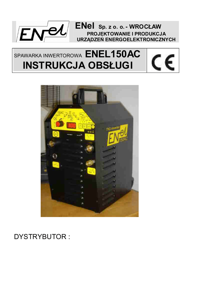 ENel Sp. z o. o. - WROCŁAW PROJEKTOWANIE I PRODUKCJA URZĄDZEŃ ENERGOELEKTRONICZNYCH ENEL150AC INSTRUKCJA OBSŁUGI SPAWARKA INWERTOROWA DYSTRYBUTOR : 1. WSTĘP Niniejsza instrukcja zawiera informacje, które pozwolą w pełni wykorzystać walory eksploatacyjne spawarki ENEL150AC oraz umożliwią bezpieczne jej użytkowanie. Wszystkich użytkowników zachęcamy do zapoznania się z poniższą instrukcją. 2. PRZEZNACZENIE Spawarka ENEL150AC jest nowoczesnym źródłem prądu stałego oraz zmiennego, przeznaczonym głównie do spawania metodą TIG oraz elektrodami otulonymi (metoda MMA) wszystkich typów (ER-, EA-, EB-, ES-, ...) o średnicach od 1,6 do 3,2. Z uwagi na wysokie napięcie biegu jałowego (95V) oraz bardzo dobre własności spawalnicze, urządzenie umożliwia również spawanie elektrodami w otulinie celulozowej, wykorzystywanymi do spawania między innymi rurociągów. Po wyposażeniu spawarki w odpowiedni uchwyt możliwe jest spawanie metodą TIG (spawanie elektrodą nietopliwą - najczęściej wolframową w osłonie gazu obojętnego np. argonu) stali, miedzi, aluminium oraz stopów tych metali. Zajarzenie łuku odbywa się metodą bezstykową (zajarzenie iskrowe) lub dotykową. Możliwa jest zdalna regulacja prądu spawania we wszystkich trybach pracy. Mikroprocesorowy sterownik spawarki zapewnia precyzję i powtarzalność nastaw wielu parametrów oraz prostą obsługę. Z uwagi na małe gabaryty i masę oraz odporność na duże wahania napięcia sieci - spawarka ENEL150AC jest szczególnie przydatna do pracy w trudnych warunkach terenowych przy montażu wszelkiego rodzaju konstrukcji spawanych, rurociągów, zbiorników itp.. O Urządzenie jest przystosowane do pracy w temperaturze otoczenia od -10 C O O do +40 C i wilgotności względnej do 90% przy temperaturze +20 C. 3. OPIS Spawarka ENEL150AC jest inwertorowym źródłem prądu stałego pracującym w zakresie częstotliwości powyżej częstotliwości akustycznej. Jest źródłem o dobrej dynamice, wygładzonym i stabilnym łuku, lekkim, o niewielkich gabarytach, odpornym na duże wahania napięcia sieci zasilającej. Elementy połączeniowe, regulacyjne i sygnalizacyjne rozmieszczone są na płycie czołowej. Na płycie tylnej znajdują się : wyłącznik zasilania, przewód zasilający, wentylator, tabliczka znamionowa oraz króciec zaworu gazu, służący do doprowadzenia gazu osłonowego z butli. Elementy regulacyjne i sygnalizacyjne spawarki przedstawia rys. 1. 2 Rysunek 1 Spawarkę wyposażono w cyfrowy wyświetlacz (1), wskazujący wartości nastawianych parametrów, zadajnik wartości parametrów (2), przełącznik rodzaju pracy (5), przełącznik parametrów (3), przełącznik sposobu zajarzania (4), przełącznik wyboru polaryzacji prądu stałego lub prądu zmiennego (6) oraz lampki sygnalizacyjne. Do dyspozycji są cztery rodzaje pracy wybierane przyciskiem (5) (rys. 1): 1) spawanie elektrodami otulonymi (MMA) - czerwona lampka powinna wskazywać Prąd spawania nastawiany jest w zakresie od 5 do 130A z rozdzielczością co 1A. Prostownik posiada funkcję ANTYSTYK ułatwiającą odklejenie elektrody w przypadku jej przywarcia do spawanych elementów (jeżeli przywarcie elektrody do spawanych elementów trwa dłużej niż 1,5 sekundy następuje 3 automatyczne wyłączenie prądu spawania, dzięki czemu oderwanie elektrody nie nastręcza trudności). Polaryzację napięcia (DC+ lub DC-) na elektrodzie wybieramy przyciskiem (6) Możliwe są dwa rodzaje pracy : a) z automatycznym ograniczaniem napięcia biegu jałowego do wartości bezpiecznej ok. 12V. Ten rodzaj pracy jest automatycznie ustawiany po włączeniu zasilania oraz po zmianie z innego trybu pracy na tryb MMA i sygnalizowany jest ciągłym świeceniem diody wskazującej prąd spawaniaIs. b) bez automatycznego ograniczania napięcia biegu jałowego. Napięcie biegu jałowego utrzymywane jest na poziomie ok. 95V. Do tego rodzaju pracy przechodzimy naciskając przycisk zmiany parametru (3). Ten rodzaj pracy sygnalizowany jest mruganiem diody wskazującej prąd spawania Is. Ponowne naciśnięcie przycisku (3) powoduje powrót do pracy z automatycznym ograniczaniem napięcia. Po zaopatrzeniu spawarki w przystawkę zdalnego sterowania możliwa jest zdalna zmiana prądu spawania podczas wykonywania spoiny. 2) spawanie prądem stałym (DC-) metodą TIG 2T (dwutakt)- czerwona lampka powinna wskazywać Do dyspozycji są następujące parametry nastawiane w podanych zakresach : Is[A] - prąd spawania w amperach nastawiany w zakresie 5 - 150A z rozdzielczością co 1A Tn[s] - czas narastania prądu spawania w sekundach nastawiany w zakresie 0,1-5s z rozdzielczością co 0,1s To[s] - czas opadania prądu spawania w sekundach nastawiany w zakresie 0,1-20s z rozdzielczością co 0,1s Ib[%] - prąd bazowy nastawiany w procentach prądu spawania Is w zakresie 10 - 100% z rozdzielczością co 1%. Jeżeli wartość prądu bazowego ustawimy na 100% prąd spawania będzie miał wartość stałą równą nastawionej wartości Is. Jeżeli wartość prądu bazowego ustawimy różną od 100% to uzyskamy prąd pulsujący o następujących parametrach : prąd spawania będzie pulsował z częstotliwością fp i wypełnieniem TH[%] (patrz niżej) 4 TH[%] - czas trwania impulsów prądu o wartości Is w % okresu pulsacji nastawiany w zakresie 1 – 99%. Parametr TH nastawiany jest tylko wówczas gdy wartość prądu bazowego Ib nastawiono różną od 100% fp[Hz] –częstotliwość pulsacji prądu spawania w Hz, nastawiana w zakresie 0.1 – 50Hz. Parametr fp nastawiany jest tylko wówczas gdy wartość prądu bazowego Ib nastawiono różną od 100% Tg[s] - czas wypływu gazu po zgaśnięciu łuku w sekundach nastawiany w zakresie od 1 - 25s z rozdzielczością co 1s TH=20 % TH=80 % Is Is Ib=50% Tp=1/fp Ib=10 % Tp=1/fp Przykładowe przebiegi prądu pulsującego dla różnych nastaw fp, Ib, TH Sposób zajarzania wybieramy przyciskiem HF (4) : - ZAJARZENIE DOTYKOWE - LAMPKA (9
