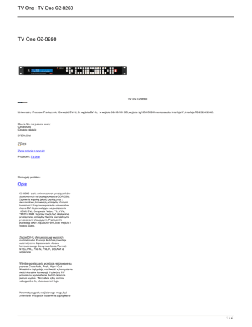 TV One : TV One C2-8260 TV One C2-8260 TV One C2-8260 Uniwersalny Procesor Przełącznik, 10x wejść DVI-U, 2x wyjścia DVI-U, 1x wejście 3G/HD/HD SDI, wyjście 3g/HD/HD SDIinterfejs audio, interfejs IP, interfejs RS-232/422/485. Ocena Nie ma jeszcze oceny Cena brutto Cena po rabacie 37859,00 zł Zadaj pytanie o produkt Producent: TV One Szczegóły produktu Opis C2-8000 - seria uniwersalnych przełączników zbudowanych na bazie procesora CORIO®2. Zapewnia wysoką jakość przełącznia z dwukanałową konwersją pomiędzy różnymi formatami. Urządzenie posiada uniwersalne złącze DVI-U pozwalające na podłączenie HDMI, DVI, Composite Video, YC, YUV, YPbPr i RGB. Sygnały mogą być skalowane, przełączane pomiędzy dwoma niezależnymi procesorami skalującymi. Przełączniki posiadają także złącza 3G-SDI, oraz wejścia i wyjścia audio. Złącze DVI-U oferuje obsługę wysokich rozdzielczości. Funkcja AutoSet powoduje automatyczne dopasowanie obrazu komputerowego do wyświetlacza. Formaty NTSC, PAL, PAL-M, PAL-N, SECAM są wspierane. W trybie przełączania przejścia realizowane są poprzez Cross-fade, Push, Wipe i Cut. Niezależne tryby dają możliwość wykorzystania dwóch kanałów konwersji. Podwójny PIP pozwala na wyświetlenie dwóch okien na jednym wyjściu. Wszystkie tryby można wzbogacić o tło, kluczowanie i logo. Parametry sygnału wejściowego mogą być zmieniane. Wszystkie ustawienia zapisywane 1/4 TV One : TV One C2-8260 są w pamięci nieulotnej i można je przywołać nawet po utracie zasilania. Dostępne są również presety, które można dowolnie zmieniać. Wszystkie funkcje są dostępne poprzez frontowy panel, złącze RS-232/422/485, IP. Program pracujący pod kontrolą Windows oferuje dostęp do wszystkich funkcji w łatwy sposób. LCD na panelu frontowym również pomaga w konfiguracji. Urządzenie mieści się w obudowie 1RU. Dostępne jest również opcjonalne redundancyjne źródło zasilania. Zmienny Zoom do 10x powiększa każdą część ekranu komputerowego do pożądanej wartości. Zmienne ścieśnianie do 10% początkowej wielkości pozwala na dopasowanie obrazu do większości ekranów. Zaawansowane systemy eliminacji migotania i wysoka wartość próbkowania zapewniają krystaliczny obraz, pełną przepustowość. Przełącznik jest także wyposażony w systemy redukcji szumu. Zaawansowane funkcje pozwalają na użycie kluczowania wejść. Dzięki zastosowaniu próbkowania 4:4:4 precyzyjne kluczowanie na poziomie pixela może być uzyskane. Tryb Mix Mode pozwala na bezszwowe cięcia, przejścia fade i wipe pomiędzy wejściami. Wejście referencyjne genlock jest kompatybilne z SD i HD i zapewnia precyzję synchronizacji. Wewnętrzny przełącznik audio pozwala na przekazywanie sygnału z wejścia DVI i SDI na wyjście DVI i SDI. Opcjonalny moduł audio pozwala na wprowadzanie opóźnienia do toru audio. Kluczowe cechy C2-8000: * rozmiar 1RU, * wysokiej jakości, bezszwowe przełączanie, * konwersja w górę, w dół i krosowo, * wejścia DVI-U (HDMI/CV/YC/RGB/YPbPr): aż do 12, * wejścia SDI: aż do 2 SD/HD/3G-SDI + odświeżone wyjście, * wyjścia DVI-U: 2 (HDMI/CV/YC/EGB/YPbPr), * wyjścia SDI: aż do 2 (SD/HD/3G), * wejścia Genlock: 1x Tri/Bi z pętlą, * analogowe: PC aż do 2048x2048, HDTV aż do 1080p/60, * DVI: PC aż do 1920x1200, HDTV aż do 1080p/60, * współpracuje z NTSC, PAL, PAL-M, PAL-N, SECAM, * wejścia i wyjścia HDMI kompatybilne z HDCP, * kompensacja ruchu i 3:2 Pull-down, * interpolacja przekątnej, * redukcja szumów dla wejść PAL, NTSC i 1080i, * automatyczna detekcja rozdzielczości wejściowej, * AutoSet - automatyczne dopasowanie rozmiaru obrazu z wejścia PC, * pełne próbkowanie 4:4:4, * ustawialne powiększenie do 10X i pomniejszenie do 10%, * kluczowanie chromy i lumy, * przejścia Fade, Wipe, Push i Cut, * ustawienia parametrów sygnału wideo, * embedowanie/deembedowanie dźwięku dla SDI i DVI, * embedowanie/deembedowanie dla CV/SDI, * wewnętrzne przekazywanie audio, * możliwość zmiany Logo przez użytkownika, * zapis stałych obrazków, * ramki z ustawialnymi kolorami i rozmiarami, * interfejs IP, * interfejs RS-232/422/485, * opcjonalny moduł audio z wyjściem AES i ustawialnym opóźnieniem, * opcjonalny moduł Tally, * opcjonalne zapasowy zasilacz, * opcjonalny zestaw do montowania w Racku. 2/4 TV One : TV One C2-8260 Specyfikacja techniczna Wejścia wideo: Composite: 10x przez DVI-U S-Video: 10x przez DVI-U YUV/YPbPr: 10x przez DVI-U SD/HD/3G-SDI: 2x BNC (+wyjście re-clocked) Wejścia komputerowe: Cyfrowe DVI: 10x przez DVI-U Analogowe: 10x przez DVI-U Rozdzielczości: Analog: PC do 2048x2048, HD do 1080p60, DVI: PC do 1920x1200, HD do 1080p60 Wyjścia wideo: Standardy telewizyjne: NTSC, PLA, PLA-M/N, SECAM Composite: 2x przez DVI-U S-Video: 2x przez DVI-U YUV/YPbPr: 2x przez DVI-U SD/HD/3G-SDI: do 2x przez BNC Wyjścia komputerowe: DVI: 2x przez DVI-U Analogowe: 2x przez DVI-U Formaty analogowe: RGBHV, RGBS, RGsB, YPbPr Zakresy wejść/wyjść: Rozdzielczo?ci HD (DVI, YPbPr, SDI): 720p 23.98/24/25/29.97/30/50/59.94/60Hz, 1035i 59.94/60Hz, 1080i 50/59.94/60Hz, 1080p 23.98/24/25/29.97/30/50/59.94/60Hz Pliki do pobrania Specyfikacja w języku angielskim. INSTRUKCJA OBSŁUGI serii C2-8000 W J.POLSKIM Filmy English C2-8000 Universal Input Seamless Switcher is based on TV One's exclusive CORIO®2 technology and provides high quality video switching with two-channel bi-directional conversion between a variety of analog and digital video formats. The standard system features multiple DVI-U input modules (allowing any of HDMI, DVI, Composite Video, YC, YUV, YPbPr or RGB) that can be scaled and switched between, along with two independent processing channels. The system can also have 3G-SDI input/output modules fitted, as well as audio I/O. The high resolution DVI-U (HDMI, DVI, CV, YC, YUV, YPbPr or RGB) outputs are selectable as virtually any PC or HDTV resolution (or SDI with the 3G-SD