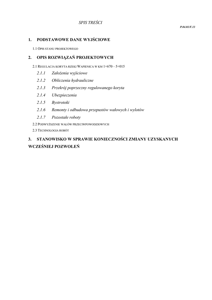 SPIS TREŚCI P.04.01/F.13 1. PODSTAWOWE DANE WYJŚCIOWE 1.1 OPIS STANU PROJEKTOWEGO 2. OPIS ROZWIĄZAŃ PROJEKTOWYCH 2.1 REGULACJA KORYTA RZEKI WAPIENICA W KM 1+670 – 5+015 2.1.1 ZałoŜenia wyjściowe 2.1.2 Obliczenia hydrauliczne 2.1.3 Przekrój poprzeczny regulowanego koryta 2.1.4 Ubezpieczenia 2.1.5 Bystrotoki 2.1.6 Remonty i odbudowa przepustów wałowych i wylotów 2.1.7 Pozostałe roboty 2.2 PODWYśSZENIE WAŁÓW PRZECIWPOWODZIOWYCH 2.3 TECHNOLOGIA ROBÓT 3. STANOWISKO W SPRAWIE KONIECZNOŚCI ZMIANY UZYSKANYCH WCZEŚNIEJ POZWOLEŃ P.04.01/F.13 Nr umowy: K/131/2010/BTP - OZ-1740/p Tytuł opracowania: „Wykonanie aktualizacji przedmiaru robót na zadanie Odbudowa Nr str.: str. 2 Nr arch.: 4/2010 koryta cieku Wapienica wraz z nadbudową obwałowań w km 0+000 Oddział Sosnowiec – 5+600” w zakresie km 1+670 – 5+015”. 1. Podstawowe dane wyjściowe 1.1 Opis stanu projektowego Projekt budowlany na wymienione zadanie został wykonany na podstawie pomiarów z 2003roku. Od tego czasu koryto uległo zmianom wynikającym z kilkukrotnego przejścia fali powodziowej. Niniejszą aktualizację wykonano na podstawie nowych przekroi geodezyjnych zlokalizowanych w identycznych miejscach jak pierwotne. Zakres jej uwzględnia warunki techniczne określone przez Zamawiającego a których kopię załączono na końcu opracowania. Niniejszy opis naleŜy rozpatrywać łącznie z Projektem Budowlanym. 2. Opis rozwiązań projektowych 2.1 Regulacja koryta rzeki Wapienica w km 1+670 – 5+015 2.1.1 ZałoŜenia wyjściowe Pozostawia się bez zmian projektowany spadek koryta, szerokości dna oraz lokalizacje projektowanych budowli jak; bystrotoki kamienne, przepusty, wyloty. Doświadczenia z eksploatacji koryta rzeki na odcinkach juŜ wykonanych skłoniły Zamawiającego do zmiany ubezpieczenia skarp brzegów w stosunku do projektu budowlanego. 2.1.2 Obliczenia hydrauliczne Na podstawie wykonanych przekroi poprzecznych aktualnego koryta dokonano obliczeń hydraulicznych za pomocą programu komputerowego HEC-RAC celem określenia warunków przepływu wód kontrolnych – Q1%=147m3/s, a powyŜej km 2+470 Q1%=134,5 m3/s oraz miarodajnych Q3%=114m3/s, a powyŜej km 2+470 Q3%=104,3 m3/s. Z obliczeń tych wynika Ŝe przy przepływie kontrolnym prędkości wody w korycie istniejącym cechują się znaczną zmiennością i wynoszą od 1,65m/s w przekroju 4+050 do 4,30m/s w przekroju 1+741. Następnym krokiem było sprawdzenie jak kształtują się warunki przepływu kontrolnego w korycie po wykonaniu projektowanych robót. Stwierdzono znaczne zmniejszenie zmienności prędkości na poszczególnych przekrojach. Obecnie prędkość wody, na odcinkach pomiędzy bystrotokami oscyluje od 2,1 m/s do 3,1m/s. P.04.01/F.13 Nr umowy: K/131/2010/BTP - OZ-1740/p Tytuł opracowania: „Wykonanie aktualizacji przedmiaru robót na zadanie Odbudowa Nr str.: str. 3 Nr arch.: 4/2010 koryta cieku Wapienica wraz z nadbudową obwałowań w km 0+000 Oddział Sosnowiec – 5+600” w zakresie km 1+670 – 5+015”. Ławki międzywala są obecnie porośnięte byliną o nazwie Rdestowiec ostrokończysty. Sprawdzono jakie prędkości wody będą występowały na ławkach oczyszczonych oraz porośniętych ta rośliną, dla pierwszego przypadku przyjęto współczynnik Manninga n=0,04, a dla drugiego n=0,100. Stwierdzono prędkości nad powierzchnią ławek: przy n=0,04 oscylują w granicach 0,9-1,4 m/s a przy n=0,100 v=0,3-0,6m/s. Określono rzędną korony wału dla przypadku, gdy ławki byłyby porośnięte rdestem, co stwarza dodatkowy margines bezpieczeństwa. 2.1.3 Przekrój poprzeczny regulowanego koryta Szerokość dna uzaleŜniona od lokalizacji odcinka: − od km 1+670 do 2+650 szerokość 8,0m − od km 2+650 do 4+207 szerokość 7,0m PowyŜej km 4+207 w Projekcie budowlanym nie projektowano robót w korycie rzeki, tylko ewentualne podwyŜszenie obwałowań. Nachylenie skarp 1:2 na całej długości regulowanego koryta. W miejscach gdzie występują ławki międzywala projektuje się je obniŜyć tak, aby były wzniesiona o 1,8m nad projektowane dno. 2.1.4 Ubezpieczenia Zmieniono sposób ubezpieczenia stopy skarp i samej skarpy w stosunku do pierwotnego projektu. Według pierwotnego projektu stopa i skarpy koryta rzeki ubezpieczone były następująco: Od km 0+00 do 4+207 − stopa skarpy - opaską typu Ner z wikliny leśnej, − skarpa - brzegosłonem faszynowym krytym z wikliny leśnej a powyŜej darniowanie i obsiew, Od km 4+207 do km 5+015 nie były przewidywane roboty w korycie rzeki. Obecnie projektuje się zmienny typ ubezpieczenia w zaleŜności od lokalizacji: − Na łukach wklęsłych w stopie skarpy projektuje się umocnienie z koszy siatkowokamiennych o przekroju 1,0x0,5m zagłębionych 70cm poniŜej dna. Na skarpie materace siatkowo-kamienne grubości 30cm pasem szerokości 4,0m. Kosze i materace wykonane z drutu średnicy minimum 3,0mm, zabezpieczonego powłoką cynkowo-aluminiową i oczkach P.04.01/F.13 Nr umowy: K/131/2010/BTP - OZ-1740/p Tytuł opracowania: „Wykonanie aktualizacji przedmiaru robót na zadanie Odbudowa Nr str.: str. 4 Nr arch.: 4/2010 koryta cieku Wapienica wraz z nadbudową obwałowań w km 0+000 Oddział Sosnowiec – 5+600” w zakresie km 1+670 – 5+015”. o wymiarach 8x10cm. Materace ułoŜone na geowłókninie o gramaturze 200g/m2 Materace naleŜy obsypać gruntem mineralnym i obsiać mieszanką traw. − Na łukach wypukłych oraz odcinkach prostych projektuje się wykonanie na skarpach ubezpieczenia z geokraty komórkowej typu „plaster miodu” o wysokości 20cm i wymiarach oczek po rozciągnięciu 500x420mm lub zbliŜonych. Geokrata ta będzie wyciągnięta pasem szerokości 0,5m na dno. Pod tym odcinkiem naleŜy wykonać w dnie opaskę kamienną, która stanowić będzie rodzaj fundamentu zabezpieczającego przed ewentualnym podmyciem. Na skarpie geokrata winna być ułoŜona pasem szerokości 4,0m. Szczegóły obu typów ubezpieczenia pokazano na rysunku. Wierzchnią powier
