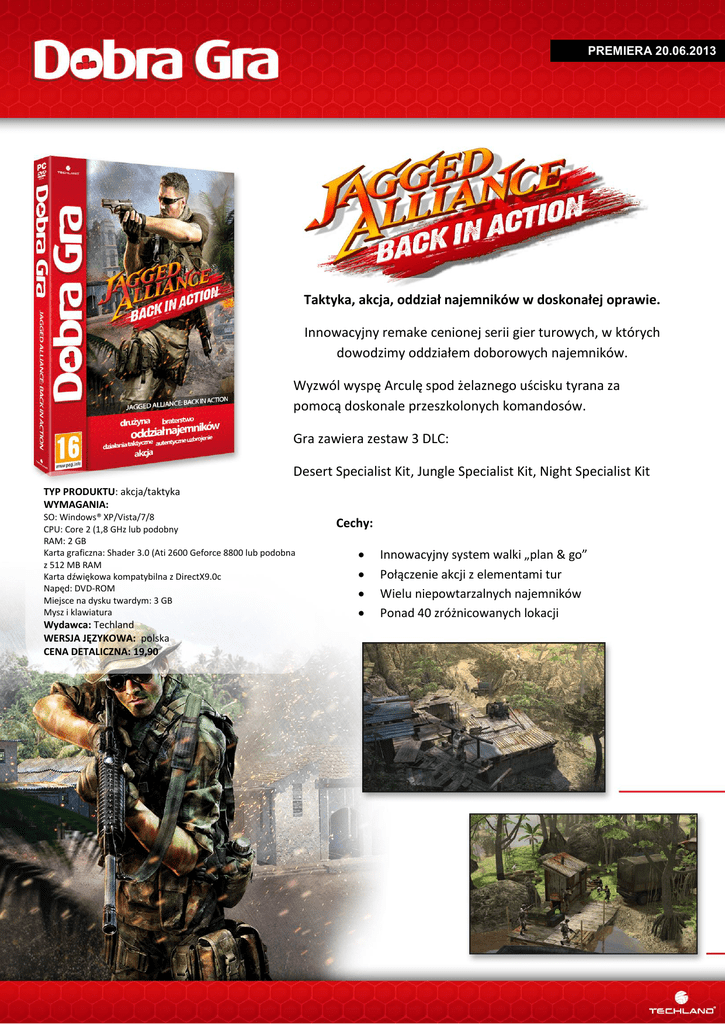PREMIERA 20.06.2013 Taktyka, akcja, oddział najemników w doskonałej oprawie. Innowacyjny remake cenionej serii gier turowych, w których dowodzimy oddziałem doborowych najemników. Wyzwól wyspę Arculę spod żelaznego uścisku tyrana za pomocą doskonale przeszkolonych komandosów. Gra zawiera zestaw 3 DLC: Desert Specialist Kit, Jungle Specialist Kit, Night Specialist Kit TYP PRODUKTU: akcja/taktyka WYMAGANIA: SO: Windows® XP/Vista/7/8 CPU: Core 2 (1,8 GHz lub podobny RAM: 2 GB Karta graficzna: Shader 3.0 (Ati 2600 Geforce 8800 lub podobna z 512 MB RAM Karta dźwiękowa kompatybilna z DirectX9.0c Napęd: DVD-ROM Miejsce na dysku twardym: 3 GB Mysz i klawiatura Wydawca: Techland WERSJA JĘZYKOWA: polska CENA DETALICZNA: 19,90 Cechy: Innowacyjny system walki „plan & go” Połączenie akcji z elementami tur Wielu niepowtarzalnych najemników Ponad 40 zróżnicowanych lokacji