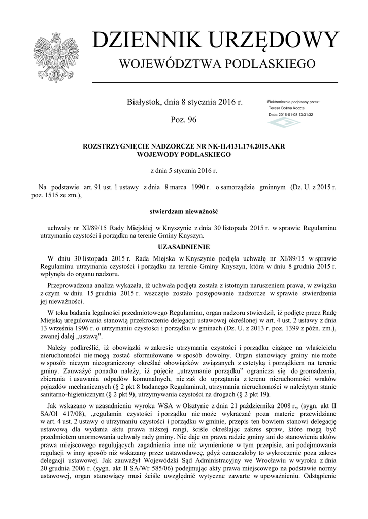 DZIENNIK URZĘDOWY WOJEWÓDZTWA PODLASKIEGO Białystok, dnia 8 stycznia 2016 r. Elektronicznie podpisany przez: Teresa Bożena Koczta Poz. 96 Data: 2016-01-08 13:31:32 ROZSTRZYGNIĘCIE NADZORCZE NR NK-II.4131.174.2015.AKR WOJEWODY PODLASKIEGO z dnia 5 stycznia 2016 r. Na podstawie art. 91 ust. 1 ustawy z dnia 8 marca 1990 r. o samorządzie gminnym (Dz. U. z 2015 r. poz. 1515 ze zm.), stwierdzam nieważność uchwały nr XI/89/15 Rady Miejskiej w Knyszynie z dnia 30 listopada 2015 r. w sprawie Regulaminu utrzymania czystości i porządku na terenie Gminy Knyszyn. UZASADNIENIE W dniu 30 listopada 2015 r. Rada Miejska w Knyszynie podjęła uchwałę nr XI/89/15 w sprawie Regulaminu utrzymania czystości i porządku na terenie Gminy Knyszyn, która w dniu 8 grudnia 2015 r. wpłynęła do organu nadzoru. Przeprowadzona analiza wykazała, iż uchwała podjęta została z istotnym naruszeniem prawa, w związku z czym w dniu 15 grudnia 2015 r. wszczęte zostało postępowanie nadzorcze w sprawie stwierdzenia jej nieważności. W toku badania legalności przedmiotowego Regulaminu, organ nadzoru stwierdził, iż podjęte przez Radę Miejską uregulowania stanowią przekroczenie delegacji ustawowej określonej w art. 4 ust. 2 ustawy z dnia 13 września 1996 r. o utrzymaniu czystości i porządku w gminach (Dz. U. z 2013 r. poz. 1399 z późn. zm.), zwanej dalej „ustawą”. Należy podkreślić, iż obowiązki w zakresie utrzymania czystości i porządku ciążące na właścicielu nieruchomości nie mogą zostać sformułowane w sposób dowolny. Organ stanowiący gminy nie może w sposób niczym nieograniczony określać obowiązków związanych z estetyką i porządkiem na terenie gminy. Zauważyć ponadto należy, iż pojęcie „utrzymanie porządku” ogranicza się do gromadzenia, zbierania i usuwania odpadów komunalnych, nie zaś do uprzątania z terenu nieruchomości wraków pojazdów mechanicznych (§ 2 pkt 8 badanego Regulaminu), utrzymania nieruchomości w należytym stanie sanitarno-higienicznym (§ 2 pkt 9), utrzymywania czystości na drogach (§ 2 pkt 19). Jak wskazano w uzasadnieniu wyroku WSA w Olsztynie z dnia 21 października 2008 r., (sygn. akt II SA/Ol 417/08), „regulamin czystości i porządku nie może wykraczać poza materie przewidziane w art. 4 ust. 2 ustawy o utrzymaniu czystości i porządku w gminie, przepis ten bowiem stanowi delegację ustawową dla wydania aktu prawa niższej rangi, ściśle określając zakres spraw, które mogą być przedmiotem unormowania uchwały rady gminy. Nie daje on prawa radzie gminy ani do stanowienia aktów prawa miejscowego regulujących zagadnienia inne niż wymienione w tym przepisie, ani podejmowania regulacji w inny sposób niż wskazany przez ustawodawcę, gdyż oznaczałoby to wykroczenie poza zakres delegacji ustawowej. Jak zauważył Wojewódzki Sąd Administracyjny we Wrocławiu w wyroku z dnia 20 grudnia 2006 r. (sygn. akt II SA/Wr 585/06) podejmując akty prawa miejscowego na podstawie normy ustawowej, organ stanowiący musi ściśle uwzględnić wytyczne zawarte w upoważnieniu. Odstąpienie Dziennik Urzędowy Województwa Podlaskiego –2– Poz. 96 od tej zasady narusza związek formalny i materialny pomiędzy aktem wykonawczym a ustawą, co z reguły stanowi istotne naruszenie prawa. Jednocześnie zwrócić należy uwagę, że regulacja art. 4 ust. 2 wspomnianej ustawy ma charakter wyczerpujący, tj. uchwalając na jej podstawie regulamin czystości i porządku, rada powinna zawrzeć w nim postanowienia odnoszące się do wszystkich enumeratywnie wymienionych w ustawie zagadnień. Wskazując zakres zagadnień objętych regulaminem czystości i porządku, ustawodawca w skonstruowaniu delegacji ustawowej nie posłużył się sformułowaniem „w szczególności”, „może określić”, ale sformułowaniem „regulamin określa”, co prowadzi do wniosku, że treść tego regulaminu musi bezwzględnie odpowiadać zakresowi delegacji ustawowej”. Katalog spraw, które ustawodawca pozwolił radzie gminy ująć w regulaminie utrzymania czystości i porządku na terenie gminy jest zamknięty, a rada może dokonywać regulacji prawnych tylko w takim zakresie, w jakim została do tego upoważniona. Takie rozwiązanie legislacyjne jest uzasadnione z uwagi na wkroczenie poprzez przepisy prawa miejscowego w sferę praw i wolności obywateli. W ocenie organu nadzoru przepisy § 2 pkt 10, 12 niniejszego Regulaminu podjęte zostały bez wymaganej podstawy prawnej. Rada Miejska w Knyszynie mocą przedmiotowych postanowień załącznika do uchwały nałożyła odpowiednio na właścicieli nieruchomości obowiązek posypywania piaskiem chodnika oraz usuwanie nawisów (sopli) z okapów, rynien i innych części nieruchomości. Należy zauważyć, iż z art. 4 ust. 2 pkt 1 lit. b ustawy wynika obowiązek unormowania w niniejszym Regulaminie wymagań dotyczących uprzątania błota, śniegu, lodu i innych zanieczyszczeń tylko z tych części nieruchomości, które służą do użytku publicznego. Przepis art. 5 ust. 1 pkt 4 ustawy precyzyjnie ustala zakres obowiązków właścicieli nieruchomości dotyczących tej kwestii nakazując im utrzymanie porządku i czystości poprzez uprzątnięcie błota, śniegu, lodu i innych zanieczyszczeń z chodników położonych wzdłuż nieruchomości, przy czym za taki chodnik uznaje się wydzieloną część drogi publicznej służącą dla ruchu pieszego położoną bezpośrednio przy granicy nieruchomości, a czynność dotyczyć może jedynie uprzątnięcia błota, śniegu, lodu i innych zanieczyszczeń (wyroki WSA w Bydgoszczy z dnia 29 października 2009 r. sygn. akt II SA/Bd 633/08 oraz z dnia 6 stycznia 2009 r., sygn. akt II SA/Bd 611/08). Dodatkowo należy stwierdzić nieuprawnioną modyfikację art. 5 ust. 1 pkt 4 ustawy przez Radę Miejską w Knyszynie. Powyższy przepis wskazuje, iż właściciel nieruchomości nie jest obowiązany do uprzątnięcia chodnika, na którym jest dopuszczony
