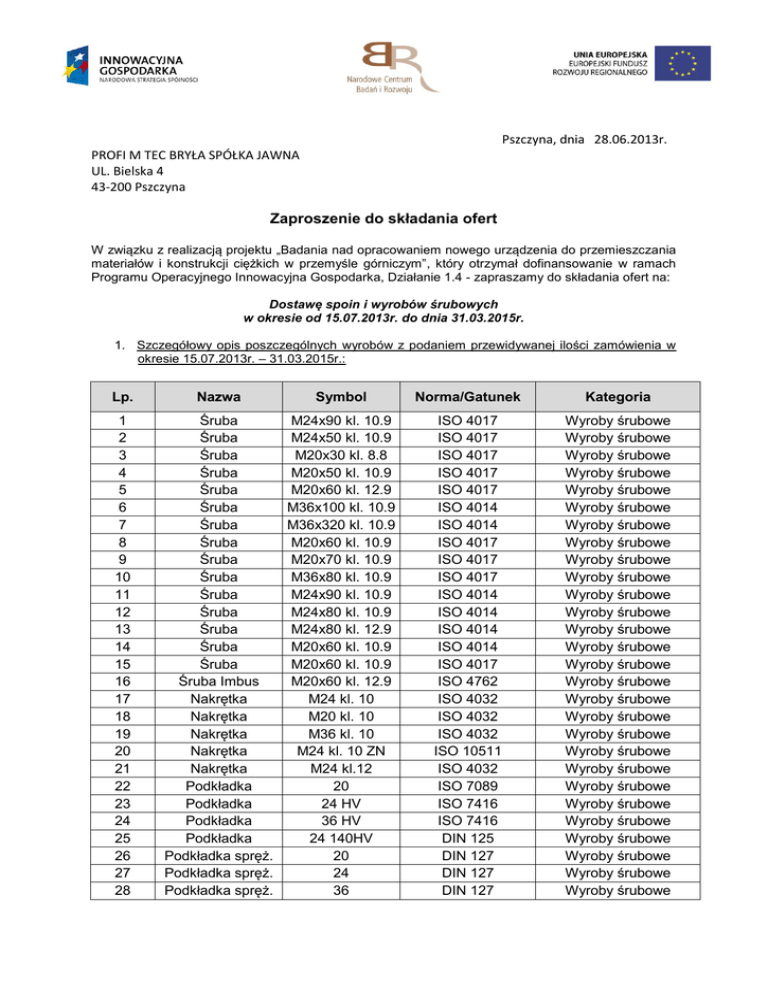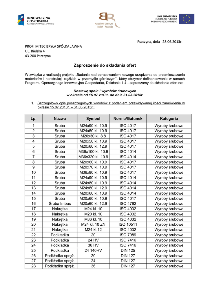Pszczyna, dnia 28.06.2013r. PROFI M TEC BRYŁA SPÓŁKA JAWNA UL. Bielska 4 43-200 Pszczyna Zaproszenie do składania ofert W związku z realizacją projektu „Badania nad opracowaniem nowego urządzenia do przemieszczania materiałów i konstrukcji ciężkich w przemyśle górniczym”, który otrzymał dofinansowanie w ramach Programu Operacyjnego Innowacyjna Gospodarka, Działanie 1.4 - zapraszamy do składania ofert na: Dostawę spoin i wyrobów śrubowych w okresie od 15.07.2013r. do dnia 31.03.2015r. 1. Szczegółowy opis poszczególnych wyrobów z podaniem przewidywanej ilości zamówienia w okresie 15.07.2013r. – 31.03.2015r.: Lp. 1 2 3 4 5 6 7 8 9 10 11 12 13 14 15 16 17 18 19 20 21 22 23 24 25 26 27 28 Nazwa Symbol Śruba M24x90 kl. 10.9 Śruba M24x50 kl. 10.9 Śruba M20x30 kl. 8.8 Śruba M20x50 kl. 10.9 Śruba M20x60 kl. 12.9 Śruba M36x100 kl. 10.9 Śruba M36x320 kl. 10.9 Śruba M20x60 kl. 10.9 Śruba M20x70 kl. 10.9 Śruba M36x80 kl. 10.9 Śruba M24x90 kl. 10.9 Śruba M24x80 kl. 10.9 Śruba M24x80 kl. 12.9 Śruba M20x60 kl. 10.9 Śruba M20x60 kl. 10.9 Śruba Imbus M20x60 kl. 12.9 Nakrętka M24 kl. 10 Nakrętka M20 kl. 10 Nakrętka M36 kl. 10 Nakrętka M24 kl. 10 ZN Nakrętka M24 kl.12 Podkładka 20 Podkładka 24 HV Podkładka 36 HV Podkładka 24 140HV Podkładka spręż. 20 Podkładka spręż. 24 Podkładka spręż. 36 Norma/Gatunek Kategoria ISO 4017 ISO 4017 ISO 4017 ISO 4017 ISO 4017 ISO 4014 ISO 4014 ISO 4017 ISO 4017 ISO 4017 ISO 4014 ISO 4014 ISO 4014 ISO 4014 ISO 4017 ISO 4762 ISO 4032 ISO 4032 ISO 4032 ISO 10511 ISO 4032 ISO 7089 ISO 7416 ISO 7416 DIN 125 DIN 127 DIN 127 DIN 127 Wyroby śrubowe Wyroby śrubowe Wyroby śrubowe Wyroby śrubowe Wyroby śrubowe Wyroby śrubowe Wyroby śrubowe Wyroby śrubowe Wyroby śrubowe Wyroby śrubowe Wyroby śrubowe Wyroby śrubowe Wyroby śrubowe Wyroby śrubowe Wyroby śrubowe Wyroby śrubowe Wyroby śrubowe Wyroby śrubowe Wyroby śrubowe Wyroby śrubowe Wyroby śrubowe Wyroby śrubowe Wyroby śrubowe Wyroby śrubowe Wyroby śrubowe Wyroby śrubowe Wyroby śrubowe Wyroby śrubowe 29 Drut spawalniczy 30 Gaz techniczny 31 Gaz techniczny 32 Gaz techniczny SG2/1,2mm CM-18 (82%Ar18%Co2 7, b. T-40) Tlen techniczny 6,4m3 b. T-40 Acetylen N-185 (Acetylen rozpuszczony) b. T-40 SG2 Spoiny --------- Spoiny --------- Spoiny --------- Spoiny Szacunkowa wielkość zamówienia wg kategorii: 3 - Spoiny – 150kg ( gazy – 120m ) - Wyroby śrubowe – 1000kg 2. Warunkiem składania ofert jest: a. zobowiązanie do dostarczenia wyrobów każdorazowo w następującym terminie od dnia otrzymania zamówienia: do 14 dni kalendarzowych Kryteria wyboru ofert będą następujące: cena 100%. Termin składania ofert upływa w dniu: 05.07.2013r. Termin ważności oferty: nie krócej niż: 15.07.2013r. 00 00 Ewentualne dodatkowe informacje można uzyskać od poniedziałku do piątku w godz. 8 do 15 poprzez kontakt mailowy [email protected]; telefoniczny: +48 32/210 40 77, faksem +48 32/210 40 77. Złożona oferta powinna zawierać co najmniej: o nazwę i adres oferenta, o opis nawiązujący do parametrów wyszczególnionych w zapytaniu ofertowym, o cenę jednostkową za 1 kilogram śrub, nakrętek, drutu spawalniczego, 1 szt. podkładek, 3 1m gazu technicznego (w tym Acetylen – za 1 kg) (netto oraz brutto) z wyraźnym wskazaniem którego wyrobu cena dotyczy (z katalogu wyrobów wskazanego w punkcie 1 niniejszego zapytania), o termin ważności oferty, o zobowiązanie Oferenta do dostarczenia towaru zgodnie z punktem 2a niniejszego zapytania; o informację, czy oferta jest ważna jednostkowo czy tylko w całości; o podpis osoby upoważnionej do składania ofert w imieniu Oferenta; o oświadczenie stanowiące załącznik nr 1; 3. Wybór oferty: W przypadku, gdy co najmniej dwie oferty otrzymają taką samą liczbę punktów, Zamawiający zaproponuje Oferentom, którzy złożyli oferty, możliwość złożenia ofert dodatkowych w terminie dwóch dni. Oferty dodatkowe nie mogą zawierać cen wyższych niż oferta pierwotna. W przypadku, gdy wszystkie podlegające ocenie oferty będą wyższe niż kwota jaką Zamawiający może przeznaczyć na sfinansowanie przedmiotu zamówienia, Zamawiający może przeprowadzić dodatkowe negocjacje z wszystkimi Oferentami, których oferty zostaną ocenione. Negocjacje zostaną udokumentowane protokołami z negocjacji. Zamawiający wybierze do realizacji ofertę, która spełnia warunki udziału w projekcie oraz uzyska największą liczbą punktów. Oferent, który wygra będzie zobowiązany podpisać umowę w terminie i miejscu oraz na warunkach przedstawionych przez Zamawiającego. 4. Oferta, która: - nie będzie odpowiadać treści Zapytania ofertowego, - zostanie złożona po terminie składania ofert, - złożona zostanie bez kompletu wymaganych załączników, - zawierać będzie braki formalne, zostanie odrzucona. Załączniki: - oświadczenie o braku powiązań Złożenie oferty w ramach niniejszego postępowania nie wywołuje po stronie PROFI M TEC BRYŁA SPÓŁKA JAWNA obowiązku jej wyboru.