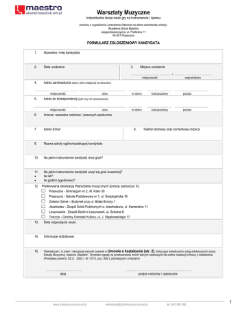 Warsztaty Muzyczne Indywidualne lekcje nauki gry na instrumencie / śpiewu prosimy o wypełnienie i przesłanie listownie na adres sekretariatu szkoły: Akademia Sztuk Maestro Jazgarzewszczyzna, ul. Podleśna 11 05-501 Piaseczno FORMULARZ ZGŁOSZENIOWY KANDYDATA 1. Nazwisko i imię kandydata 2. Data urodzenia 3. Miejsce urodzenia ……………………………………… / …………………………………… miejscowość województwo 4. Adres zamieszkania (dane, które znajdą się na rachunku): ………………………………………… …………………………………………… …………… miejscowość ulica nr domu 5. ……………………… kod pocztowy ……………………………… poczta ……………………… kod pocztowy ……………………………… poczta Adres do korespondencji (jeśli inny niż zamieszkania): ………………………………………… …………………………………………… …………… miejscowość ulica nr domu 6. Imiona i nazwiska rodziców / prawnych opiekunów 7. Adres Email 9. Nazwa szkoły ogólnokształcącej kandydata 10. Na jakim instrumencie kandydat chce grać? 11. • • Na jakim instrumencie kandydat uczył się grać wcześniej? Ile lat?: Ile godzin tygodniowo?: 8. Telefon domowy oraz komórkowy rodzica 12. Preferowana lokalizacja Warsztatów muzycznych (proszę zaznaczyć X): □ Piaseczno - Gimnazjum nr 2, Al. Kalin 30 □ □ □ □ □ Piaseczno - Szkoła Podstawowa nr 1, ul. Świętojańska 18 Zalesie Górne – Budynek przy ul. Białej Brzozy 1 Józefosław - Zespół Szkół Publicznych w Józefosławiu, ul. Kameralna 11 Lesznowola - Zespół Szkół w Lesznowoli, ul. Szkolna 8 Tarczyn - Gminny Ośrodek Kultury, ul. J. Stępkowskiego 17 13. Data rozpoczęcia nauki: 14. Informacje dodatkowe: 15. Oświadczam, iż znam i akceptuję warunki zawarte w Umowie o kształcenie (str. 2), dotyczące świadczenia usług edukacyjnych przez Szkołę Muzyczną I stopnia „Maestro”. Wyrażam zgodę na przetwarzanie moich danych osobowych dla celów realizacji Umowy o kształcenie (Podstawa prawna: DZ.U. 2002 r. Nr 101/2, poz. 926 z późniejszymi zmianami) ……………………………… data www.szkolamuzyczna.art.pl ………………………………………………………… podpis rodziców / opiekunów [email protected] tel. 602 280 086 1 UMOWA O KSZTAŁCENIE Zawarta w dniu …………….………….. w …………………….……….…………. pomiędzy Szkołą Muzyczną I stopnia „Maestro” reprezentowaną przez Dyrektora Andrzeja Gozdeckiego, zwaną dalej Szkołą, a Panią/Panem ……………………………………..…………………….……………..…….……………..…....………… zwanym/zwaną w dalej Rodzicem, zamieszkałą/zamieszkałym (adres zameldowania) …..………...……….…………………….….……….…………..……….……………………………………….….…….., tel. ………………...…….…………, adres email …..………………………….….…………............ Rodzicem ucznia: ………………………………..……………..……………………………..……………………………….………….……….………. urodzonego/urodzonej dnia ………..……………………………….. w (miejsce urodzenia) …….………...…..…………......................................................… . §1 Przedmiotem Umowy jest świadczenie usług edukacyjnych następującego rodzaju (proszę zaznaczyć X): Usługa dodatkowa □ Warsztaty muzyczne 30 min. tygodniowo □ Warsztaty muzyczne □ Warsztaty muzyczne 45 min. tygodniowo 60 min. tygodniowo □ Warsztaty muzyczne 90 min. tygodniowo □ Dojazd do domu ucznia 1 x tygodniowo □ Dojazd do domu ucznia 2 x tygodniowo §2 Umowa niniejsza zawarta zostaje na czas określony, to jest od …………………………... do dnia 30.06.2017 r. lub w przypadku wcześniejszej rezygnacji do dnia, w którym uczeń przestaje (data rozpoczęcia nauki) uczęszczać do Szkoły, w trybie nauki wskazanym w § 1. O terminie rezygnacji ze szkoły Rodzice powiadomią dyrektora szkoły na piśmie, z co najmniej miesięcznym wyprzedzeniem. §3 1. Warsztaty muzyczne prowadzone przez Szkołę to zajęcia indywidualne trwające w wymiarze podstawowym 30 min. tygodniowo. Wymiar ten można powielać zwiększając opłaty. 2. Dojazd do domu ucznia to usługa polegająca na dojeździe nauczyciela do domu ucznia celem przeprowadzenia warsztatów muzycznych. Usługa dostępna po potwierdzeniu przez Szkołę. 3. Warsztaty muzyczne odbywają się zgodnie z ustalonym przez Szkołę tygodniowym harmonogramem zajęć z uwzględnieniem kalendarza roku szkolnego obowiązującego w woj. mazowieckim. Organizacja roku szkolnego dotycząca dni wolnych od nauki prowadzona jest w oparciu o zarządzenia odpowiednich organów administracji państwowej regulujących pracę w roku szkolnym i przebiega analogicznie jak we wszystkich szkołach publicznych. 4. O zmianach w toku pracy Szkoły wynikających z realizacji programu nauczania, w tym o dniach wolnych w przypadku przeprowadzania egzaminów, przesłuchań, audycji i koncertów Rodzic będzie powiadamiany z siedmiodniowym wyprzedzeniem. §4 1. Rodzic powinien zapewnić regularne uczęszczanie dziecka na zajęcia szkolne oraz motywować i dopilnować systematycznego przygotowywania ucznia do zajęć szkolnych. 2. Rodzic powinien zapewnić uczniowi Szkoły stały dostęp do informacji zamieszczanych przez Szkołę na szkolnej witrynie internetowej oraz w poczcie elektronicznej. 3. Rodzic zobowiązany jest do powiadomienia Szkoły o zmianach danych teleadresowych niezbędnych do kontaktu z nim. 4. Rodzice zobowiązani są do dostarczenia dokumentów niezbędnych do przyjęcia i uczęszczania dziecka do Szkoły, w tym zaświadczenia lekarskiego o braku przeciwwskaz