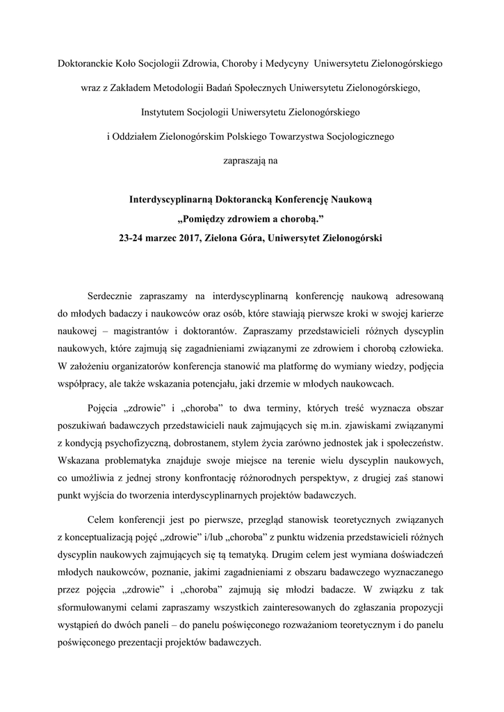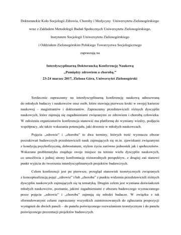 Doktoranckie Koło Socjologii Zdrowia, Choroby i Medycyny Uniwersytetu Zielonogórskiego wraz z Zakładem Metodologii Badań Społecznych Uniwersytetu Zielonogórskiego, Instytutem Socjologii Uniwersytetu Zielonogórskiego i Oddziałem Zielonogórskim Polskiego Towarzystwa Socjologicznego zapraszają na Interdyscyplinarną Doktorancką Konferencję Naukową „Pomiędzy zdrowiem a chorobą.” 23-24 marzec 2017, Zielona Góra, Uniwersytet Zielonogórski Serdecznie zapraszamy na interdyscyplinarną konferencję naukową adresowaną do młodych badaczy i naukowców oraz osób, które stawiają pierwsze kroki w swojej karierze naukowej – magistrantów i doktorantów. Zapraszamy przedstawicieli różnych dyscyplin naukowych, które zajmują się zagadnieniami związanymi ze zdrowiem i chorobą człowieka. W założeniu organizatorów konferencja stanowić ma platformę do wymiany wiedzy, podjęcia współpracy, ale także wskazania potencjału, jaki drzemie w młodych naukowcach. Pojęcia „zdrowie” i „choroba” to dwa terminy, których treść wyznacza obszar poszukiwań badawczych przedstawicieli nauk zajmujących się m.in. zjawiskami związanymi z kondycją psychofizyczną, dobrostanem, stylem życia zarówno jednostek jak i społeczeństw. Wskazana problematyka znajduje swoje miejsce na terenie wielu dyscyplin naukowych, co umożliwia z jednej strony konfrontację różnorodnych perspektyw, z drugiej zaś stanowi punkt wyjścia do tworzenia interdyscyplinarnych projektów badawczych. Celem konferencji jest po pierwsze, przegląd stanowisk teoretycznych związanych z konceptualizacją pojęć „zdrowie” i/lub „choroba” z punktu widzenia przedstawicieli różnych dyscyplin naukowych zajmujących się tą tematyką. Drugim celem jest wymiana doświadczeń młodych naukowców, poznanie, jakimi zagadnieniami z obszaru badawczego wyznaczanego przez pojęcia „zdrowie” i „choroba” zajmują się młodzi badacze. W związku z tak sformułowanymi celami zapraszamy wszystkich zainteresowanych do zgłaszania propozycji wystąpień do dwóch paneli – do panelu poświęconego rozważaniom teoretycznym i do panelu poświęconego prezentacji projektów badawczych. W ramach panelu teoretycznego organizatorzy proponują poruszenie m.in. następujących zagadnień: Sposoby definiowania pojęć „zdrowie” i/lub „choroba” w ramach reprezentowanych dyscyplin naukowych. Specyfika sposobów definiowania terminów „zdrowie” i/lub choroba” w ramach reprezentowanych dyscyplin naukowych. Jedna, czy wiele definicji pojęć „zdrowie” i/lub „choroba”? Jednowymiarowość, czy wielkowymiarowość terminów „zdrowia” i/lub „choroby”? Granice pojęć „zdrowie” i/lub „choroba”. Kto jest „zdrowy”, a kto jest „chory” z punktu widzenia przedstawicieli różnych dyscyplin naukowych? Do udziału w panelu empirycznym zapraszamy osoby zainteresowane zaprezentowaniem własnych projektów badawczych w ramach zaproponowanych poniżej zagadnień: Przedmiot badań zdrowia i choroby z różnych dyscyplin naukowych: co lub/i kogo badamy? Wyzwania metodologiczne z uwzględnieniem specyfiki różnych dyscyplin naukowych: jakie stosujemy reguły poznania? Badania zdrowia i choroby w praktyce z uwzględnieniem specyfiki różnych dyscyplin naukowych: młodzi badacze w terenie czyli nasz warsztat. Funkcja praktyczna badań dotyczących zdrowia i choroby: komu potrzebne są wyniki naszych badań? W czasie trwania konferencji organizatorzy, poza panelem teoretycznym i empirycznym, odbędą się także warsztaty, które będą mogły stanowić przestrzeń do wypracowania przez zainteresowanych uczestników interdyscyplinarnego projektu badawczego. Warunki uczestnictwa: Osoby zainteresowane uczestnictwem w konferencji proszone są o przesłanie zgłoszenia (na załączonym do informacji formularzu zgłoszenia) do dnia 31.01.2017 na adres [email protected] Informacja o zaakceptowaniu propozycji wystąpienia zostanie przesłana za pośrednictwem poczty elektronicznej konferencji do dnia 06.02.2017. Czas przewidziany na wystąpienie to 15 minut. Koszt uczestnictwa: Koszt uczestnictwa w konferencji wynosi 150 zł. W ramach opłaty organizatorzy zapewniają materiały konferencyjne, przerwy kawowe, dwa obiady. Informacje dotyczące sposobu płatności zostaną podane wraz z informacją o zaakceptowaniu propozycji wystąpienia. Publikacja: Organizatorzy przewidują wydanie recenzowanej pokonferencyjnej pracy zbiorowej. Artykuły zostaną opublikowane po uzyskaniu pozytywnej recenzji. Osoby zainteresowane opublikowaniem artykułu proszone są o jego przesłanie do dnia 15.05.2017 na adres [email protected] Szczegółowe informacje o zasadach publikacji zostaną podane wraz z informacją o zaakceptowaniu propozycji wystąpienia. Rada Programowa Konferencji: dr hab. Anna Gaweł, prof. UJ (Instytut Pedagogiki, Uniwersytet Jagielloński) dr hab. Mirosław Kowalski, prof. UZ (Katedra Teorii i Filozofii Wychowania, Uniwersytet Zielonogórski) dr hab. Ewa Narkiewicz-Niebalec, prof. UZ (Zakład Metodologii Badań Społecznych, Uniwersytet Zielonogórski) dr hab. Włodzimierz Piątkowski, prof. UMCS (Instytut Socjologii, Uniwersytet Marii CurieSkłodowskiej, Samodzielna Pracownia Socjologii Medycyny, Uniwersytet Medyczny w Lublinie) dr hab. Tatiana Rongińska, prof. UZ (Instytut Psychologii, Uniwersytet Zielonogórski) dr hab. Beata Trzop, prof. UZ (Instytut Socjologii, Uniwersytet Zielonogórski) dr hab. Maria Zielińska, prof. UZ (Instytut Socjologii, Uniwersytet Zielonogórski) Komitet Organizacyjny: mgr Katarzyna Walentynowicz-Moryl (Zakład Metodologii Badań Społecznych, Uniwersytet Zielonogórski) mgr Milena Grzegorczyk (Doktoranckie Koło Socjologii Zdrowia, Choroby i Medycyny, Uniwersytet Zielonogórski) mgr Aleksandra Kita (Doktoranckie Koło Socjologii Zdrowia, Choroby i Medycyny, Uniwersytet Zielonogórski) Informacje na temat konferencji wraz z formularzem zgłoszenia znajdują 