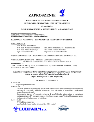 ZAPROSZENIE KONFERENCJA NAUKOWO – SZKOLENIOWA KIELECKIEJ OKRĘGOWEJ IZBY APTEKARSKIEJ 13 luty 2010 r. ZAMEK KRÓLEWSKI w SANDOMIERZU ul. ZAMKOWA 12 Konferencja organizowana przy udziale: LUBELSKIEJ OKRĘGOWEJ IZBY APTEKARSKIEJ PODKARPACKIEJ OKRĘGOWEJ IZBY APTEKARSKIEJ PATRONAT NAUKOWY – UNIWERSYTET MEDYCZNY w LUBLINIE WYKŁADOWCY prof. dr hab. Anna Malm dr n. med. Marek Niewiedzioł dr n. med. Anna Polewczyk mgr Tadeusz Pawełek dr n. med. Romana Rolla – Szczepańska dr n. med. Marian Patrzałek mgr farm. Łukasz Godlewski WSPÓŁORGANIZATOR – HURTOWNIA FARMACEUTYCZNA LUBFRAM S.A. WSPARCIE LOGISTYCZNE – Medicine Conference Consulting PROFESJONANA ORGANIZACJA KONFERENCJI MEDYCZNYCH SPONSORZY – GSK COMMERCIAL Sp. z o.o., BIOMED LUBLIN, NES PHARMA, SERVIER, MSD, LABOFARM, PHARMA NORD Uczestnicy wszystkich form szkolenia ciągłego w czasie trwania konferencji mogą w sumie zdobyć 20 punktów edukacyjnych (6 pkt. twardych i 14 pkt. miękkich). PROGRAM KONFERENCJI 8.30 – 9.00 Rejestracja uczestników 9.00 – 9.10 Oficjalne rozpoczęcie konferencji, przywitanie zaproszonych gości, przedstawienie sponsorów konferencji, wręczenie pakietów startowych oraz skryptów z materiałami naukowymi uczestnikom konferencji. Rozpoczęcie kursu „Promocja zdrowia i profilaktyka zdrowotna w aptekach ogólnodostępnych” przygotowanego i realizowanego przez Wydział Farmaceutyczny Uniwersytetu Medycznego w Lublinie. 9.10 – 10.00 Wykład inauguracyjny prof. dr hab. Anna Malm „Probiotyki w XXI wieku”. 10.00 – 10.20 Prezentacja Hurtowni Farmaceutycznej LUBFARM S.A. – dyrektor ds. sprzedaży Wojciech Woźniak 10.20 – 10.40 Prezentacja programu prozdrowotnego Max Medicum. – dyrektor ds. kluczowych klientów Jarosław Stańczak 10.40 – 10.45 Przerwa kawowa 10.45 – 12.45 dr n. med. Marek Niewiedzioł „Leki złożone w terapii nadciśnienia tętniczego”. „Leczenie metaboliczne w chorobie niedokrwiennej serca”. „Równoważność biologiczna a terapeutyczna czy to to samo ?”. 12.45 – 13.00 Prezentacja produktów firmy Pharma Nord. 13.00 – 13.45 Zwiedzanie wystaw i zbiorów zamkowych z przewodnikiem lub indywidualnie. 13.45 – 14.15 Przerwa obiadowa 14.15 – 14.30 mgr farm. Łukasz Godlewski Unikalne formuły – nowe produkty – nowe możliwości. Prezentacja produktów Uzarin i Avilin. 14.30 – 15.10 mgr Tadeusz Pawełek „Znaczenie granicy pomiędzy lekiem a żywnością z punktu widzenia producenta, dystrybutora, lekarza, farmaceuty i pacjenta”. 15.10 – 15.55 dr n. med. Anna Polewczyk „Leki oryginalne i generyczne – czy są na pewno takie same ?”. 15.55 – 16.05 Prezentacja - Agnieszka Kuźma 16.00 – 16.35 dr n. med. Romana Rolla – Szczepańska „Szczepienia ochronne dla osób podróżujących” 16.35 – 16.45 Prezentacja – Marzena Janczyk 16.45 – 17.25 dr n. med. Marian Patrzałek „Skuteczna ochrona przed krztuścem i inwazyjną chorobą pneumokokową”. 17.25 – 17.30 test na zakończenie kursu. 17.30 Zakończenie konferencji. Koszt udziału w szkoleniu: 100,- zł. Wpłaty na konto: Uniwersytet Medyczny w Lublinie Al. Racławickie 1 95 1240 5497 1111 0010 2830 7931 – kurs „Promocja zdrowia i profilaktyka zdrowotna…”. Warunkiem udziału w szkoleniu jest okazanie dowodu wpłaty w dniu szkolenia Dowód wpłaty jest podstawą do wystawienia faktury. Dodatkowych informacji udziela: Kielecka Okręgowa Izba Aptekarska telefon 41 366-17-73 Zgłoszenie uczestnictwa w szkoleniu następuje na podstawie karty zgłoszenia lub telefonicznie. Zgłoszenia uczestników przyjmuje Ośrodek Kształcenia Podyplomowego Uniwersytetu Medycznego w Lublinie – Teresa Słotwińska telefony: 81 718-65-78, 600 355 323 Koordynator z terenu Podkarpacia: Marek Haładyj telefon – 500 127 810 Koordynator z terenu Świętokrzyskiego: Sławomir Szysz telefon – 500 002 270 Ze względu na ograniczoną ilość miejsc o udziale w szkoleniu decyduje kolejność zgłoszeń.