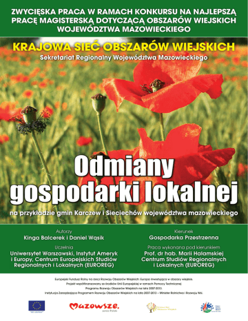 ZWYCIĘSKA PRACA W RAMACH KONKURSU NA NAJLEPSZĄ PRACĘ MAGISTERSKĄ DOTYCZĄCĄ OBSZARÓW WIEJSKICH WOJEWÓDZTWA MAZOWIECKIEGO KRAJOWA SIEĆ OBSZARÓW WIEJSKICH Sekretariat Regionalny Województwa Mazowieckiego Odmiany gospodarki lokalnej na przykładzie gmin Karczew i Sieciechów województwa mazowieckiego Autorzy Kierunek Kinga Balcerek i Daniel Wąsik Gospodarka Przestrzenna Uczelnia Praca wykonana pod kierunkiem Uniwersytet Warszawski, Instytut Ameryk i Europy, Centrum Europejskich Studiów Regionalnych i Lokalnych (EUROREG) Prof. dr hab. Marii Halamskiej Centrum Studiów Regionalnych i Lokalnych (EUROREG) Europejski Fundusz Rolny na rzecz Rozwoju Obszarów Wiejskich: Europa inwestująca w obszary wiejskie. Projekt współfinansowany ze środków Unii Europejskiej w ramach Pomocy Technicznej Programu Rozwoju Obszarów Wiejskich na lata 2007-2013. Instytucja Zarządzająca Programem Rozwoju Obszarów Wiejskich na lata 2007-2013 – Minister Rolnictwa i Rozwoju Wsi. Uniwersytet Warszawski Instytut Ameryk i Europy Centrum Europejskich Studiów Regionalnych i Lokalnych (EUROREG) Kinga Balcerek Daniel Wąsik Nr albumu: 266907 Nr albumu: 265022 Odmiany gospodarki lokalnej Na przykładzie gmin Karczew i Sieciechów województwa mazowieckiego. Praca magisterska na kierunku Gospodarka Przestrzenna Praca wykonana pod kierunkiem Prof. dr hab. Marii Halamskiej Centrum Studiów Regionalnych i Lokalnych (EUROREG) Warszawa, czerwiec 2012 Oświadczenie kierującego pracą Oświadczam, że niniejsza praca została przygotowana pod moim kierunkiem i stwierdzam, że spełnia ona warunki do przedstawienia jej w postępowaniu o nadanie tytułu zawodowego. Podpis kierującego pracą Data Oświadczenie autorów pracy Świadomy odpowiedzialności prawnej oświadczam, że niniejsza praca dyplomowa została napisana przeze mnie samodzielnie i nie zawiera treści uzyskanych w sposób niezgodny z obowiązującymi przepisami. Oświadczam również, że przedstawiona praca nie była wcześniej przedmiotem procedur związanych z uzyskaniem tytułu zawodowego w wyższej uczelni. Oświadczam ponadto, że niniejsza wersja pracy jest identyczna z załączoną wersją elektroniczną. Data Podpisy autorów pracy 2 Streszczenie Praca, składająca się z dwóch części opisuje różne typy gospodarki lokalnej na mazowszu. Dwa studia przypadku gospodarki lokalnej na obszarach metropolitarnych Warszawy oraz obszarach peryferyjnych regionu. Zostały przygotowane według identycznej procedury i narzędzi badawczych. W podsumowaniu autorzy wpisują badane gospodarki w typologię Mariniego i Monney’a, ukazując w analizowanych przypadkach cechy rent-seeking economy, dependent economy oraz entrepreneurial economy. Słowa kluczowe zróżnicowanie regionu, rozwój lokalny, gospodarka lokalna, suburbanizacja, obszary wiejskie Dziedzina pracy (kody wg programu Sokrates – Erasmus) 14600 Tytuł pracy w języku angielskim The types of local economy. The case study of Karczew and Sieciechów municipalities in Mazowieckie voivodeship 3 4 Spis treści I Wstęp ...................................................................................................................................6 II Część pierwsza. Karczew. Gospodarka lokalna na obszarach metropolitarnych…………..14 1. Gmina Karczew: historia, układ terytorialny, dynamika ludności Usytuowanie przestrzenne i dostępność .......................................................................................................................... 14 2. Gospodarka gminy: analiza stanu, układ terytorialny, charakter związków……………….37 3. Gospodarka lokalna na obszarach metropolitarnych: endogenne i egzogenne czynniki rozwoju………………………………………………………………………………………..69 Wykazy ................................................................................................................................ 81 Bibliografia .......................................................................................................................... 83 III Część druga. Sieciechów. Gospodarka lokalna na obszarach peryferyjnych……………..90 1. Gmina Sieciechów: historia, dostępność i dynamika ludności……………………………………………………………………………………….90 2. Gospodarka gminy: analiza jej stanu, struktury, charakteru wewnętrznych powiązań. .... 116 3. Peryferyjna gospodarka lokalna: bariery, możliwości i wizje rozwoju ............................ 159 Wykazy .............................................................................................................................. 169 Bibliografia ........................................................................................................................ 171 IV Wnioski………………………………………………………………………………..…173 Aneks 1: Dyspozycje do wywiadu z burmistrzem/wójtem, maj 2012 r. ............................... 178 Aneks 2: Kwestionariusz wywiadu z sołtysem, maj 2012 r. ................................................ 180 Aneks 3: Dyspozycje do zebrania informacji o największych przedsiębiorstwach w gminie, maj 2012 ............................................................................................................................ 187 5 I Wstęp W ostatnim okresie badania nad problemami lokalnymi ustąpiły miejsca badaniom nad problematyką europejską oraz regionalną. Są one także coraz rzadsze, w EUROREG, który w latach 1985 – 2000 prowadził wielkie badania w ramach projektu „Polska Lokalna”, który prof. Grzegorz Gorzelak ocenia jako „niedościgły (na razie) przykład wielkiego przedsięwzięcia naukowego, szczodrze finansowanego, pozwalającego na prowadzenie kilkuletnich badań w bardzo szerokim ogólnopolskim zespole” (Gorzelak 2007, s. 312). Taka zmiana przedmiotu zainteresowań nie oznacza, że pr
