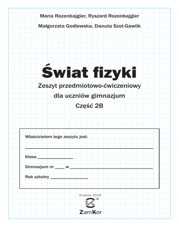 Maria Rozenbajgier, Ryszard Rozenbajgier Małgorzata Godlewska, Danuta Szot-Gawlik Świat fizyki Zeszyt przedmiotowo-ćwiczeniowy dla uczniów gimnazjum Część 2B Właścicielem tego zeszytu jest: ______________________________________________________ Klasa _______________ Gimnazjum nr ____ w ___________________________________ Rok szkolny ________________ K r a k ó w 2 010 Autorzy: Maria Rozenbajgier Ryszard Rozenbajgier Małgorzata Godlewska Danuta Szot-Gawlik Korekta językowa: Agnieszka Kochanowska-Sabljak Magdalena Puda-Blokesz Redakcja techniczna: Stanisław Sagnowski Projekt okładki: Joanna Wypiór R Zam Kor © Copyright by ZamKor P. Sagnowski i Wspólnicy sp. j. ul. Tetmajera 19, 31-352 Kraków tel.: (12) 623 25 00 faks: (12) 623 25 13 e-mail: [email protected] www.zamkor.pl ISBN 978-83-60793-53-4 (całość) ISBN 978-83-60793-57-2 (część 2B) Druk i oprawa: P.W. Stabil, tel.: (12) 410 28 20 7.2. Cieplny przepływ energii I. Notatki z lekcji II. Odszukaj w podręczniku odpowiedzi na pytania i wykonaj polecenia: 1. Na czym polega zmiana energii wewnętrznej ciał przez cieplny przepływ energii? Podaj przykład takiej zmiany. 2. Wymień kilka substancji (materiałów) będących złymi przewodnikami ciepła. Podaj przykłady ich zastosowania. 3. Wymień kilka substancji (materiałów) będących dobrymi przewodnikami ciepła. 4. O czym informuje nas pierwsza zasada termodynamiki? III. Fizyka wokół nas 1. Jaką rolę w lecie, a jaką w zimie spełnia styropian, którym okłada się ściany budynków? 71 2. Jesienią ogrodnicy okrywają krzewy słomą, włókniną lub papierem. Wyjaśnij, jaką rolę pełni taka osłona. 3. Kiedy chodzimy boso po podłodze wykonanej z płytek ceramicznych, od- czuwamy zimno. Gdy chodzimy po podłodze wykonanej z drewna, wydaje nam się ona znacznie cieplejsza, mimo że temperatura w obu pomieszczeniach jest taka sama. Jak można wytłumaczyć nasze odczucia? 4. Jaki błąd tkwi w potocznym stwierdzeniu, że „w zimie przez nieszczelne okno do mieszkania wchodzi zimno”? 72 IV. A to ciekawe… Drewno źle przewodzi ciepło nawet wtedy, gdy jest rozżarzone do czerwoności. Dlatego niektórzy ludzie potrafią spacerować boso po warstwie rozżarzonych kawałków węgla drzewnego, nie narażając swych stóp na oparzenie. Mimo wysokiej temperatury takiego węgla do stóp człowieka dociera stosunkowo mało ciepła. Chodzenie boso po rozgrzanych kawałkach metalu lub innego dobrego przewodnika ciepła na pewno skończyłoby się fatalnie. (Na podstawie: Paul G. Hewitt, Fizyka wokół nas, Wydawnictwo Naukowe PWN, Warszawa 2000) Odszukaj w Internecie więcej informacji na ten temat i przytocz w kilku zdaniach. V. „Fizyczne rachunki”, czyli rozwiązujemy zadania rachunkowe (i nie tylko) 1. Wylot strzykawki zatkano plasteliną, jej tłok ustawiono w położeniu środkowym, a następnie zanurzono ją w naczyniu z gorącą wodą. Co stało się z tłokiem strzykawki? Czy pomiędzy gorącą wodą a powietrzem zawartym w strzykawce nastąpił przepływ ciepła? Czy wzrost energii we- 73 wnętrznej powietrza w strzykawce jest równy ilości pobranego przez niego ciepła? 2. Poniżej podano przykłady różnych zjawisk fizycznych, którym towarzyszy zmiana energii wewnętrznej ciał, objawiająca się zmianą temperatury. Podziel je na takie, w których energia wewnętrzna ciała zmienia się na skutek wykonanej pracy (zapisz w drugiej kolumnie DEw = W), oraz na takie, w których zmiana ta jest spowodowana cieplnym przepływem energii (zapisz w drugiej kolumnie DEw = Q). Opis zjawiska fizycznego Wiertarką wiercimy otwór w metalowej płytce. Pocieramy o siebie zmarznięte dłonie. Pieczemy ciasto w piekarniku. Dotykamy zmarzniętymi dłońmi pieca kaflowego. Piłką do metalu piłujemy stalowy drut. Umieszczamy butelkę coca-coli w lodówce. Pieczemy w ognisku ziemniaki. VI. Wykonujemy doświadczenia opisane w podręczniku Doświadczenie ze strony 161 Cel: Badamy właściwości izolacyjne kołder i poduszek. 74 DEw = Wynik: Wniosek: VIII. „Rozrywkowa” fizyka Rozwiązaniem logogryfu jest nazwa jednego z działów fizyki. Odszukaj w encyklopedii lub w Internecie znaczenie tego słowa. 1. Stosowany do mocowania różnych przedmiotów podczas wykonywania doświadczeń z fizyki. 75 2. Fizyk, twórca najpopularniejszej skali temperatur. 3. Jej wykonanie jest jednym ze sposobów zmiany energii wewnętrznej ciała. 4. Jest miarą średniej energii kinetycznej chaotycznego ruchu cząsteczek ciała. 5. Materiał izolacyjny wykorzystywany w budownictwie. 6. Wypełnia instalację centralnego ogrzewania. 7. Gorący, służy do ogrzewania powietrza w mieszkaniu. 8. Materiał będący złym przewodnikiem ciepła, stosowany w dziewiarstwie. 9. Służy do ogrzewania pręta w doświadczeniu 7.1 (str. 158 w podręczniku). 10.Stosowany do utrzymywania stałej temperatury np. gorącej herbaty lub kawy. 11.Część energii wewnętrznej przekazywana ciału o niższej temperaturze. 12.Osadzone w ścianie budynku ma podwójne szyby. 13.Wykonując doświadczenie 7.1 (str. 158 w podręczniku), użyjesz jej do przymocowania gwoździ do metalowego pręta. X. Miejsce na rozwiązanie zadań z podręcznika (str. 161) i innych zadań zleconych przez nauczyciela 76 8. Drgania i fale sprężyste 8.1. Ruch drgający I. Notatki z lekcji II. Odszukaj w podręczniku odpowiedzi na pytania i wykonaj polecenia: 1. Analizując wynik doświadczenia 8.1 (str. 192–193 w podręczniku), podaj, jakie są wspólne cechy ruchów nazywanych drganiami gasnącymi. Co jest przyczyną zaniku drgań? 2. Co należy zrobić, aby podtrzymać drgania gasnące? 3. Jakie wielkości fizyczne charakteryzują ruch drgający? 4. Jaki jest związek okresu drgań z ich częstotliwością? 5. W jaki sposób na wykresie drgań przedstawionym na rysunku 8.3 (str. 195 w podręczniku) odczytujemy amplitudę i okres drgań? 6. Opisz kolejne przemiany energii mechanicznej zachodzące w ruchu drgającym wahadła i ci