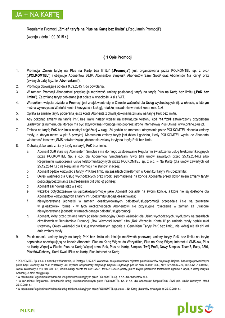 Regulamin Promocji „Zmień taryfę na Plus na Kartę bez limitu” („Regulamin Promocji”) (wersja z dnia 1.09.2015 r.) § 1 Opis Promocji 1. Promocja „Zmień taryfę na Plus na Kartę bez limitu” („Promocja”) jest organizowana przez POLKOMTEL sp. z o.o.1 („POLKOMTEL”) i obejmuje Abonentów 36.62, Abonentów Simplus3, Abonentów Sami Swoi2 oraz Abonentów Na Kartę4 oraz (zwanych dalej łącznie „Abonentami”). 2. Promocja obowiązuje od dnia 9.09.2015 r. do odwołania. 3. W ramach Promocji Abonentowi przysługuje możliwość zmiany posiadanej taryfy na taryfę Plus na Kartę bez limitu („PnK bez limitu”). Za zmianę taryfy pobierana jest opłata w wysokości 3 zł z VAT. 4. Warunkiem wzięcia udziału w Promocji jest znajdowanie się w Okresie ważności dla Usług wychodzących (tj. w okresie, w którym można wykorzystać Wartość konta i korzystać z Usług), a także posiadanie wartości konta min. 3 zł. 5. Opłata za zmianę taryfy pobierana jest z konta Abonenta z chwilą dokonania zmiany na taryfę PnK bez limitu. 6. Aby dokonać zmiany na taryfę PnK bez limitu należy wpisać na klawiaturze telefonu kod *147*20# zatwierdzony przyciskiem „zadzwoń” (z numeru, dla którego ma być aktywowana Promocja) lub poprzez stronę internetową Plus Online: www.online.plus.pl. 7. Zmiana na taryfę PnK bez limitu nastąpi najpóźniej w ciągu 24 godzin od momentu otrzymania przez POLKOMTEL zlecenia zmiany taryfy, o którym mowa w pkt 6 powyżej. Momentem zmiany taryfy jest dzień i godzina, kiedy POLKOMTEL wysłał do Abonenta wiadomość tekstową SMS potwierdzającą dokonanie zmiany taryfy na taryfę PnK bez limitu. 8. Z chwilą dokonania zmiany taryfy na taryfę PnK bez limitu: a. b. c. d. e. f. g. 9. Abonent 36i6 staje się Abonentem Simplus i ma do niego zastosowanie Regulamin świadczenia usług telekomunikacyjnych przez POLKOMTEL Sp. z o.o. dla Abonentów Simplus/Sami Swoi (dla umów zawartych przed 25.12.2014r.) albo Regulaminu świadczenia usług telekomunikacyjnych przez POLKOMTEL sp. z o.o. – Na Kartę (dla umów zawartych od 25.12.2014 r.) o ile Regulamin Promocji nie stanowi inaczej; Abonent będzie korzystać z taryfy PnK bez limitu na zasadach określonych w Cenniku Taryfy PnK bez limitu; Okres ważności dla Usług wychodzących oraz środki zgromadzone na koncie Abonenta przed dokonaniem zmiany taryfy pozostają bez zmian z zastrzeżeniem pkt 8 lit. g) poniżej; Abonent zachowuje staż w sieci; wszelkie dotychczasowe usługi/pakiety/promocje jakie Abonent posiadał na swoim koncie, a które nie są dostępne dla Abonentów korzystających z taryfy PnK bez limitu ulegają dezaktywacji; niewykorzystane jednostki w ramach dezaktywowanych pakietów/usług/promocji przepadają i nie są zwracane w jakiejkolwiek formie - w tych okolicznościach Abonentowi nie przysługuje roszczenie w zamian za utracone niewykorzystane jednostki w ramach danego pakietu/usług/promocji; Abonent, który przed zmianą taryfy posiadał promocyjny Okres ważności dla Usług wychodzących, wydłużony na zasadach określonych w Regulaminie Promocji „Rok Ważności Konta” albo „Rok Ważności Konta II” po zmianie taryfy będzie miał ustawiony Okres ważności dla Usług wychodzących zgodnie z Cennikiem Taryfy PnK bez limitu, nie krócej niż 30 dni od dnia zmiany taryfy. Po dokonaniu zmiany taryfy na taryfę PnK bez limitu nie istnieje możliwość ponownej zmiany taryfy PnK bez limitu na taryfę poprzednio obowiązującą na koncie Abonenta: Plus na Kartę Więcej do Wszystkich, Plus na Kartę Więcej Internetu i SMS-ów, Plus na Kartę Więcej w Plusie, Plus na Kartę Więcej przez Rok, Plus na Kartę, Simplus, Twój Profil, Nowy Simplus, Team7, Easy, 36i6, PiszMówDobowy, Sami Swoi, iPlus na Kartę, Plus Internet na Kartę. POLKOMTEL Sp. z o.o. z siedzibą w Warszawie, ul. Postępu 3, 02-676 Warszawa, zarejestrowana w rejestrze przedsiębiorców Krajowego Rejestru Sądowego prowadzonym przez Sąd Rejonowy dla m.st. Warszawy, XIII Wydział Gospodarczy Krajowego Rejestru Sądowego pod nr KRS: 0000419430, NIP: 527-10-37-727, REGON: 011307968, kapitał zakładowy 3 510 300 000 PLN, Dział Obsługi Klienta tel. 601102601, fax 601102602 (opłaty, jak za zwykłe połączenie telefoniczne zgodnie z taryfą, z której korzysta Abonent), e-mail: [email protected]. 2 W rozumieniu Regulaminu świadczenia usług telekomunikacyjnych przez POLKOMTEL Sp. z o.o. dla Abonentów 36.6. 3 W rozumieniu Regulaminu świadczenia usług telekomunikacyjnych przez POLKOMTEL Sp. z o.o. dla Abonentów Simplus/Sami Swoi (dla umów zawartych przed 25.12.2014 r.). 4 W rozumieniu Regulaminu świadczenia usług telekomunikacyjnych przez POLKOMTEL sp. z o.o. – Na Kartę (dla umów zawartych od 25.12.2014 r.). 1 10. Z dniem 1.09.2015 r. Abonenci korzystający z taryf: Plus na Kartę, Simplus, 36,6, PiszMów Dobowy, Twój Profil, Nowa taryfa Simplus, Team 7, Easy, Sami Swoi mogą zmienić swoją taryfę tylko na jedną z taryf obowiązujących od dnia 9.09.2014 r. tj.: Plus na Kartę bez limitu lub Plush bez limitu, przy czym: a. Abonenci korzystający z taryfy Nowa taryfa Simplus mogą ją także zmienić na taryfę Twój Profil, b. Abonenci korzystający z taryfy Team 7 mogą ją także zmienić na taryfy: Nowa taryfa Simplus lub Twój Profil, c. Abonenci korzystający z taryfy Easy mogą ją także zmienić na taryfy: Nawa taryfa Simplus lub Twój Profil, d. Abonenci korzystający z jednej z czterech taryf „Więcej” mogą ją także zmienić na inną taryfę „Więcej” tj.: Więcej do Wszystkich, Więcej Internetu i SMS-ów, Więcej w Plusie, Więcej przez Rok. § 2 Informacje dodatkowe 11. Informacja o odwołaniu Promocji zostanie podana przez POLKOMTEL do wiadomości publicznej za pośrednictwem strony internetowej www.plus.pl. 12. W kwestiach nieuregulowanych Regulaminem Promocji zastosowanie mają odpowiednio postanowienia Regulaminu świadczenia usług telekomunikacyjnych prze