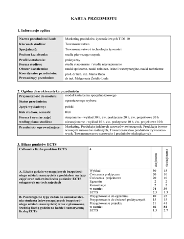 KARTA PRZEDMIOTU 1. Informacje ogólne Nazwa przedmiotu i kod: Marketing produktów żywnościowych T.D1.10 Kierunek studiów: Towaroznawstwo Specjalność: Towaroznawstwo i technologia żywności Poziom kształcenia: studia pierwszego stopnia Profil kształcenia: Forma studiów: Obszar kształcenia: Koordynator przedmiotu: Prowadzący przedmiot: praktyczny studia stacjonarne / studia niestacjonarne nauki społeczne, nauki rolnicze, leśne i weterynaryjne, nauki techniczne prof. dr hab. inż. Maria Ruda dr inż. Małgorzata Źródło-Loda 2. Ogólna charakterystyka przedmiotu Przynależność do modułu: moduł kształcenia specjalnościowego Status przedmiotu: ograniczonego wyboru Język wykładowy: polski Rok studiów, semestr: III,6 Forma i wymiar zajęć według planu studiów: stacjonarne - wykład 30 h, ćw. praktyczne 20 h, ćw. projektowe 20 h niestacjonarne - wykład 15 h, ćw. praktyczne 10 h, ćw. projektowe 10 h Przedmioty wprowadzające: Marketing, Produkcja jadalnych surowców zwierzęcych, Produkcja żywnościowych surowców roślinnych, Towaroznawstwo produktów żywnościowych, Towaroznawstwo surowców i produktów ekologicznych 4 A. Liczba godzin wymagających bezpośredniego udziału nauczyciela z podziałem na typy zajęć oraz całkowita liczba punktów ECTS osiąganych na tych zajęciach Wykład Ćwiczenia praktyczne Ćwiczenia projektowe Egzamin Konsultacje w sumie: ECTS Przygotowanie do egzaminu Przygotowanie do ćwiczeń praktycznych Przygotowanie projektu w sumie: ECTS B. Poszczególne typy zadań do samokształcenia studenta (niewymagających bezpośredniego udziału nauczyciela) wraz z planowaną średnią liczbą godzin na każde i sumaryczną liczbą ECTS niestacjonarne Całkowita liczba punktów ECTS stacjonarne 3. Bilans punktów ECTS 30 20 20 2 2 74 2.5 10 15 21 46 1.5 15 10 10 2 2 39 1.3 25 15 41 81 2.7 C. Liczba godzin praktycznych/laboratoryjnych w ramach przedmiotu oraz związana z tym liczba punktów ECTS Ćwiczenia praktyczne Ćwiczenia projektowe Wykonanie projektu Przygotowanie do ćwiczeń praktycznych w sumie: ECTS 20 20 21 15 76 2.5 10 10 41 15 76 2.5 4. Opis przedmiotu Cel przedmiotu: Celem przedmiotu jest zapoznanie studentów z podstawową wiedzą z zakresu marketingu produktów żywnościowych oraz wykształcenie umiejętności doboru i stosowania metod analizy marketingowej w odniesieniu do podmiotów branży spożywczej. Metody dydaktyczne: wykład multimedialny studium przypadku pokaz, film ćwiczenia praktyczne metoda projektów Treści kształcenia Wykłady: 1. Specyfika marketingu produktów żywnościowych. 2. Zachowanie się konsumentów i producentów na rynku żywności. 3. Rola marketingu w kształtowaniu konsumpcji żywności. 4. Produkt. Klasyfikacja produktów konsumpcyjnych. 5. Marka – proces budowania marki produktów żywnościowych. 6. Cena jako instrument marketingu żywności. 7. Dystrybucja żywności. 8. Marketing w handlu żywnością. 9. Promocja artykułów żywnościowych. 10. Reklama i jej znaczenie na rynku produktów żywnościowych. 11. Organizacja marketingu w przedsiębiorstwie. 12. Strategia i taktyka marketingu produktów żywnościowych. 13. Marketing wybranych produktów żywnościowych. Ćwiczenia praktyczne: 1. Dobór źródeł informacji marketingowej na rynku żywnościowym. 2. Analiza i ocena strategii wybranych producentów artykułów mleczarskich – studium przypadku. 3. Analiza i ocena strategii wybranych producentów mięsa i wędlin – studium przypadku. 4. Analiza i ocena strategii wybranych producentów soków i przetworów owocowo-warzywnych – studium przypadku. 5. Analiza i ocena strategii wybranych producentów pozostałych branż spożywczych – studium przypadku. 6. Analiza i ocena strategii wybranych dystrybutorów produktów żywnościowych – studium przypadku. Ćwiczenia projektowe 1. Przeprowadzenie analizy makrootoczenia dla wybranego producenta żywności. 2. Wykonanie analizy otoczenia konkurencyjnego metodą „Pięciu sił M. Portera”. 3. Analiza portfela oferowanych produktów. 4. Wykonanie analizy SWOT. 5. Przeprowadzenie segmentacji rynku. 6. Formułowanie celów i założeń strategii marketingowej. 7. Opracowanie propozycji strategii odnośnie: produktu, dystrybucji, ceny i promocji. 8. Opracowanie harmonogramu działań i założeń budżetu. 5. Efekty kształcenia i sposoby weryfikacji Efekty kształcenia Efekt przedmiotu T.D1.10_K_W01 Student, który zaliczył przedmiot Efekt kierunkowy Wiedza Zna specyfikę marketingu produktów żywnościowych T.D1.10_K_W02 Posiada wiedzę odnośnie zachowanie się konsumentów i producentów na rynku żywności T.D1.10_K_W03 Posiada wiedzę na temat instrumentów marketingu-mix w odniesieniu do artykułów żywnościowych T.D1.10_K_W04 T.D1.10_K_W05 Zna proces budowania marki produktów żywnościowych Ma wiedzę na temat organizacji marketingu w przedsiębiorstwie T.D1.10_K_W06 T.D1.10_K_U03 Posiada wiedzę na temat strategii i taktyki marketingu produktów żywnościowych Umiejętności Potrafi poprawnie zaprojektować plan marketingowy dla podmiotu działającego w branży spożywczej Posiada zdolność doboru metod wykorzystywanych w analizie marketingowej Potrafi formułować wnioski z przeprowadzonych analiz T.D1.10_K_K01 T.D1.10_K_K02 Kompetencje społeczne Potrafi pracować w grupie Potrafi myśleć w sposób przedsiębiorczy T.D1.10_K_U01 T.D1.10_K_U02 K_W04 K_W13 K_U15 K_W04 K_W12 K_W13 K_W04 K_W10 K_W13 K_W13 K_W13 K_W15 K_W13 K_W14 K_U02 K_U01 K_U06 K_U11 K_U13 K_K05 K_K03 Sposoby weryfikacji efektów kształcenia: Lp. Efekt przedmiotu 1 T.D1.10_K_W01 2 T.D1.10_K_W02 3 T.D1.10_K_W03 4 T.D1.10_K_W04 5 T.D1.10_K_W05 6 T.D1.10_K_W06 7 T.D1.10_K_U01 8 T.D1.10_K_U02 Sposób weryfikacji Ocena formująca Egzamin pisemny ograniczony czaso- sprawdzian wo – test jednokrotnego wyboru dzy Ocena końcowa wie- ocena końcowa egzaminu pisemnego Ćwiczenia przedmiotowe grupowe zaliczenie ćwiczenia praktyczMerytoryczna ocena 
