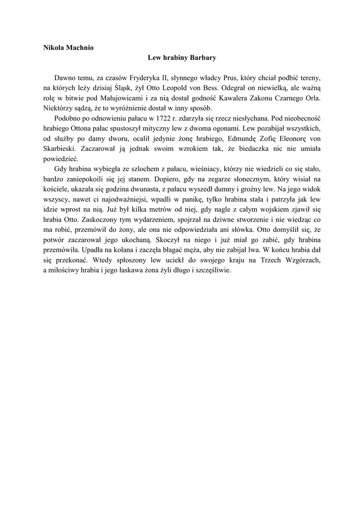Nikola Machnio Lew hrabiny Barbary Dawno temu, za czasów Fryderyka II, słynnego władcy Prus, który chciał podbić tereny, na których leŜy dzisiaj Śląsk, Ŝył Otto Leopold von Bess. Odegrał on niewielką, ale waŜną rolę w bitwie pod Małujowicami i za nią dostał godność Kawalera Zakonu Czarnego Orla. Niektórzy sądzą, Ŝe to wyróŜnienie dostał w inny sposób. Podobno po odnowieniu pałacu w 1722 r. zdarzyła się rzecz niesłychana. Pod nieobecność hrabiego Ottona pałac spustoszył mityczny lew z dwoma ogonami. Lew pozabijał wszystkich, od słuŜby po damy dworu, ocalił jedynie Ŝonę hrabiego, Edmundę Zofię Eleonorę von Skarbieski. Zaczarował ją jednak swoim wzrokiem tak, Ŝe biedaczka nic nie umiała powiedzieć. Gdy hrabina wybiegła ze szlochem z pałacu, wieśniacy, którzy nie wiedzieli co się stało, bardzo zaniepokoili się jej stanem. Dopiero, gdy na zegarze słonecznym, który wisiał na kościele, ukazała się godzina dwunasta, z pałacu wyszedł dumny i groźny lew. Na jego widok wszyscy, nawet ci najodwaŜniejsi, wpadli w panikę, tylko hrabina stała i patrzyła jak lew idzie wprost na nią. JuŜ był kilka metrów od niej, gdy nagle z całym wojskiem zjawił się hrabia Otto. Zaskoczony tym wydarzeniem, spojrzał na dziwne stworzenie i nie wiedząc co ma robić, przemówił do Ŝony, ale ona nie odpowiedziała ani słówka. Otto domyślił się, Ŝe potwór zaczarował jego ukochaną. Skoczył na niego i juŜ miał go zabić, gdy hrabina przemówiła. Upadła na kolana i zaczęła błagać męŜa, aby nie zabijał lwa. W końcu hrabia dał się przekonać. Wtedy spłoszony lew uciekł do swojego kraju na Trzech Wzgórzach, a miłościwy hrabia i jego łaskawa Ŝona Ŝyli długo i szczęśliwie.