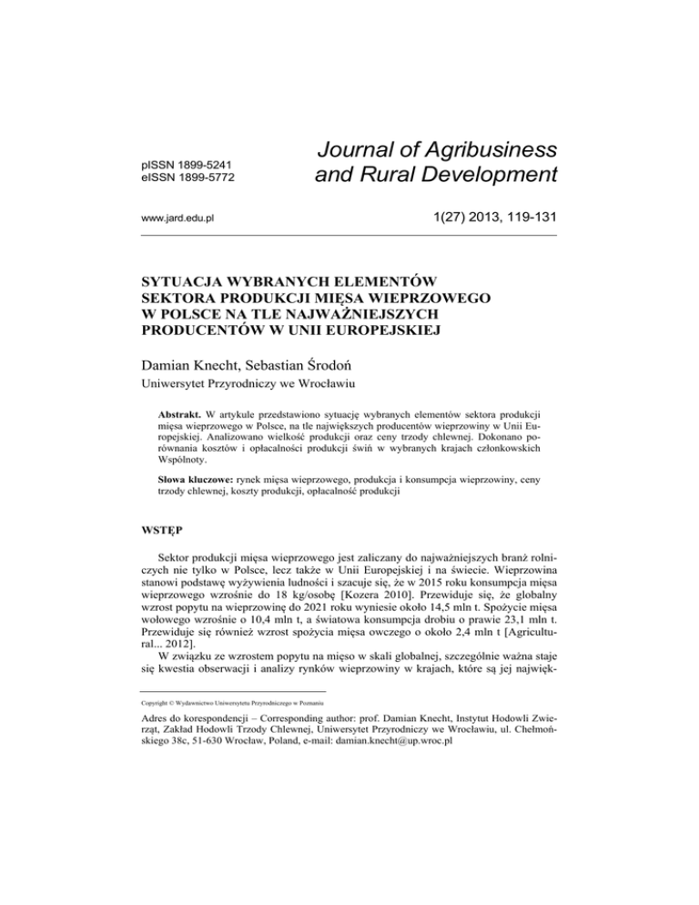 pISSN 1899-5241 eISSN 1899-5772 Journal of Agribusiness and Rural Development www.jard.edu.pl 1(27) 2013, 119-131 SYTUACJA WYBRANYCH ELEMENTÓW SEKTORA PRODUKCJI MIĘSA WIEPRZOWEGO W POLSCE NA TLE NAJWAŻNIEJSZYCH PRODUCENTÓW W UNII EUROPEJSKIEJ Damian Knecht, Sebastian Środoń Uniwersytet Przyrodniczy we Wrocławiu Abstrakt. W artykule przedstawiono sytuację wybranych elementów sektora produkcji mięsa wieprzowego w Polsce, na tle największych producentów wieprzowiny w Unii Europejskiej. Analizowano wielkość produkcji oraz ceny trzody chlewnej. Dokonano porównania kosztów i opłacalności produkcji świń w wybranych krajach członkowskich Wspólnoty. Słowa kluczowe: rynek mięsa wieprzowego, produkcja i konsumpcja wieprzowiny, ceny trzody chlewnej, koszty produkcji, opłacalność produkcji WSTĘP Sektor produkcji mięsa wieprzowego jest zaliczany do najważniejszych branż rolniczych nie tylko w Polsce, lecz także w Unii Europejskiej i na świecie. Wieprzowina stanowi podstawę wyżywienia ludności i szacuje się, że w 2015 roku konsumpcja mięsa wieprzowego wzrośnie do 18 kg/osobę [Kozera 2010]. Przewiduje się, że globalny wzrost popytu na wieprzowinę do 2021 roku wyniesie około 14,5 mln t. Spożycie mięsa wołowego wzrośnie o 10,4 mln t, a światowa konsumpcja drobiu o prawie 23,1 mln t. Przewiduje się również wzrost spożycia mięsa owczego o około 2,4 mln t [Agricultural... 2012]. W związku ze wzrostem popytu na mięso w skali globalnej, szczególnie ważna staje się kwestia obserwacji i analizy rynków wieprzowiny w krajach, które są jej najwiękCopyright © Wydawnictwo Uniwersytetu Przyrodniczego w Poznaniu Adres do korespondencji – Corresponding author: prof. Damian Knecht, Instytut Hodowli Zwierząt, Zakład Hodowli Trzody Chlewnej, Uniwersytet Przyrodniczy we Wrocławiu, ul. Chełmońskiego 38c, 51-630 Wrocław, Poland, e-mail: [email protected] 120 D. Knecht, S. Środoń szymi producentami na świecie. Polska znajduje się w czołówce państw produkujących trzodę chlewną i odgrywa istotną rolę na unijnym rynku wieprzowiny. Celem artykułu było przede wszystkim przedstawienie wybranych elementów sektora produkcji mięsa wieprzowego w Polsce, jako członka UE. Posłużono się informacjami o charakterze statystycznym i opisowym wykorzystując dane z ośrodków monitorujących rynek trzody chlewnej we Wspólnocie. Dla zobrazowania sytuacji na rynku globalnym wykorzystano także dane z Departamentu Rolnictwa Stanów Zjednoczonych (USDA). Artykuł ma charakter przeglądowy i omawia podstawowe informacje dotyczące światowego, unijnego, a przede wszystkim polskiego rynku wieprzowiny. PRODUKCJA I SPOŻYCIE MIĘSA WIEPRZOWEGO NA ŚWIECIE Światowa produkcja mięsa wieprzowego wzrosła od 2008 roku z 97,83 mln t, do 101,66 mln t w 2011 roku. Według prognoz Departamentu Rolnictwa Stanów Zjednoczonych w 2012 roku przewiduje się znaczny wzrost globalnej produkcji wieprzowiny do 104,36 mln ton (tab. 1). Tabela 1. Światowa produkcja wieprzowiny (tys. t) Table 1. World production of pork (thous. t) Kraje – Countries Lata – Years 2008 2009 2010 2011 2012* Świat – World 97 826 100 547 102 902 101 662 104 357 102,7 Chiny – China 46 205 48 905 51 070 49 500 51 600 104,2 UE-27 – EU-27 22 573 21 279 22 011 22 354 22 523 100,8 USA 10 599 10 442 10 187 10 332 10 562 102,2 3 015 3 130 3 195 3 227 3 311 102,6 Brazylia – Brazil 2012/2011 Rosja – Russia 1 736 1 844 1 920 1 995 2 100 105,3 Wietnam – Vietnam 1 850 1 910 1 930 1 960 2 000 102,0 Kanada – Canada 1 786 1 789 1 772 1 770 1 775 100,3 Japonia – Japan 1 249 1 310 1 292 1 267 1 275 100,6 Filipiny – Philippines 1 225 1 240 1 225 1 260 1 265 100,4 Meksyk – Mexico 1 161 1 162 1 165 1 182 1 215 102,8 *Prognoza USDA/FAS i Komisji Europejskiej dla UE-27. Źródło: dane USDA/FAS oraz Komisji Europejskiej z 2012 roku. *Prognosis USDA/FAS and the European Commission for EU-27. Source: USDA/FAS data and the European Commission, 2012. Obecnie największym producentem mięsa wieprzowego na świecie są Chiny, które w 2011 roku wyprodukowały 49,5 mln t wieprzowiny. Szacuje się, że w 2012 roku Chińczycy zwiększą produkcję do 51,6 mln t. Drugim producentem wieprzowiny na Journal of Agribusiness and Rural Development Sytuacja wybranych elementów sektora produkcji mięsa wieprzowego ... 121 świecie jest UE, która produkuje o połowę mniej mięsa od Chin. Trzecim producentem wieprzowiny na świecie są Stany Zjednoczone, które w porównaniu z Chinami wytwarzają o około 80% mniej wieprzowiny. Kolejnymi znaczącymi producentami trzody chlewnej są kolejno: Brazylia, Rosja i Wietnam. Dużym producentem wieprzowiny, podobnie jak Polska, jest także Kanada [Livestock... 2012]. Spożycie wieprzowiny na świecie od 2008 do 2011 roku wzrosło z 97,93 mln t, do 101,29 mln t. Szacunkowe dane wskazują, że w 2012 roku globalna konsumpcja wieprzowiny wzrośnie do 103,78 mln t. Różnica pomiędzy produkcją mięsa wieprzowego, a spożyciem będzie wynosić około 577 tys. t (tab. 2). Tabela 2. Światowe spożycie wieprzowiny (tys. t) Table 2. World consumption of pork (thous. t) Kraje – Countries Lata – Years 2008 2009 Świat – World 97 934 100 398 Chiny – China 46 691 UE-27 – EU-27 2010 2011 2012* 2012/2011 102 684 101 286 103 780 102,5 48 823 51 157 50 004 51 995 104,0 21 024 21 058 20 841 20 564 20 505 99,7 USA – USA 8 813 9 013 8 653 8 339 8 481 101,7 Rosja – Russia 2 842 2 719 2 835 2 940 2 999 102,0 Brazylia – Brazil 2 390 2 423 2 577 2 644 2 697 102,0 Japonia – Japan 2 486 2 467 2 488 2 522 2 528 100,2 Wietnam – Vietnam 1 880 1 936 1 940 1 995 2 035 102,0 Meksyk – Mexico 1 605 1 770 1 774 1 690 1 775 105,0 Korea Poludniowa South Korea 1 519 1 480 1 539 1 487 1 530 102,9 Filipiny – Philippines 1 270 1 298 1 358 1 358 1 364 100,4 *Prognoza USDA/FAS i Komisji Europejskiej dla UE-27. Źródło: dane USDA/FAS oraz Komisji Europejskiej z 2012 roku. *Prognosis USDA/
