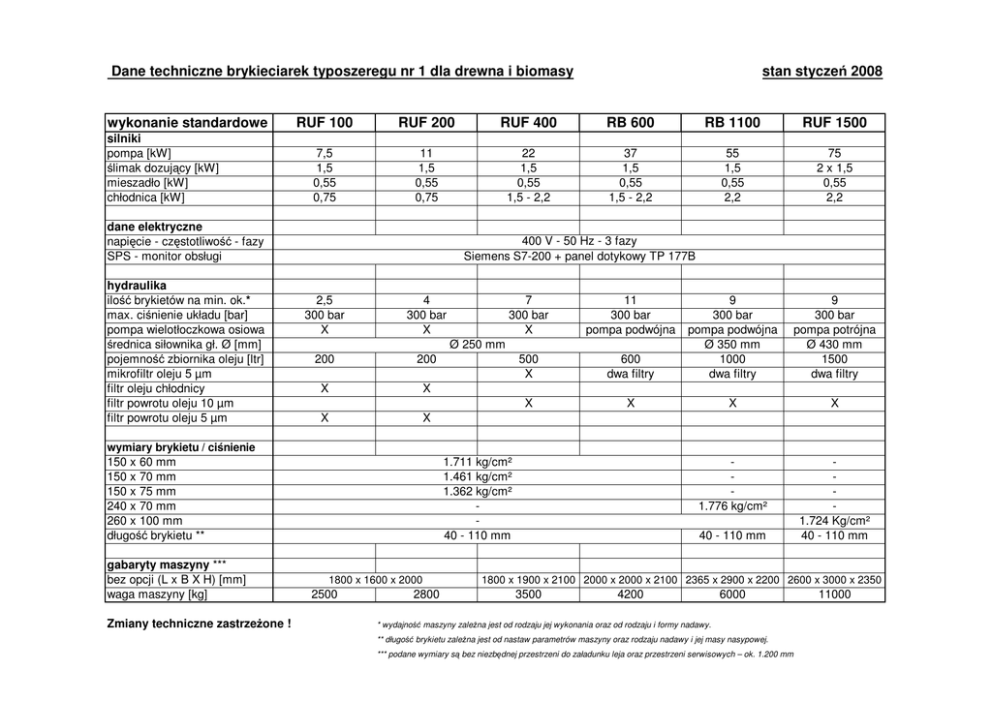 Dane techniczne brykieciarek typoszeregu nr 1 dla drewna i biomasy wykonanie standardowe silniki pompa [kW] ślimak dozujący [kW] mieszadło [kW] chłodnica [kW] RUF 100 RUF 200 RUF 400 RB 600 RB 1100 RUF 1500 7,5 1,5 0,55 0,75 11 1,5 0,55 0,75 22 1,5 0,55 1,5 - 2,2 37 1,5 0,55 1,5 - 2,2 55 1,5 0,55 2,2 75 2 x 1,5 0,55 2,2 9 300 bar pompa potrójna Ø 430 mm 1500 dwa filtry dane elektryczne napięcie - częstotliwość - fazy SPS - monitor obsługi hydraulika ilość brykietów na min. ok.* max. ciśnienie układu [bar] pompa wielotłoczkowa osiowa średnica siłownika gł. Ø [mm] pojemność zbiornika oleju [ltr] mikrofiltr oleju 5 µm filtr oleju chłodnicy filtr powrotu oleju 10 µm filtr powrotu oleju 5 µm stan styczeń 2008 400 V - 50 Hz - 3 fazy Siemens S7-200 + panel dotykowy TP 177B 2,5 300 bar X 4 300 bar X 7 300 bar X 11 300 bar pompa podwójna 500 X 600 dwa filtry 9 300 bar pompa podwójna Ø 350 mm 1000 dwa filtry X X X X 1.776 kg/cm² 1.724 Kg/cm² 40 - 110 mm Ø 250 mm 200 200 X X X X wymiary brykietu / ciśnienie 150 x 60 mm 150 x 70 mm 150 x 75 mm 240 x 70 mm 260 x 100 mm długość brykietu ** gabaryty maszyny *** bez opcji (L x B X H) [mm] waga maszyny [kg] Zmiany techniczne zastrzeŜone ! 1.711 kg/cm² 1.461 kg/cm² 1.362 kg/cm² 40 - 110 mm 1800 x 1600 x 2000 2500 2800 40 - 110 mm 1800 x 1900 x 2100 2000 x 2000 x 2100 2365 x 2900 x 2200 2600 x 3000 x 2350 3500 4200 6000 * wydajność maszyny zaleŜna jest od rodzaju jej wykonania oraz od rodzaju i formy nadawy. ** długość brykietu zaleŜna jest od nastaw parametrów maszyny oraz rodzaju nadawy i jej masy nasypowej. *** podane wymiary są bez niezbędnej przestrzeni do załadunku leja oraz przestrzeni serwisowych – ok. 1.200 mm 11000