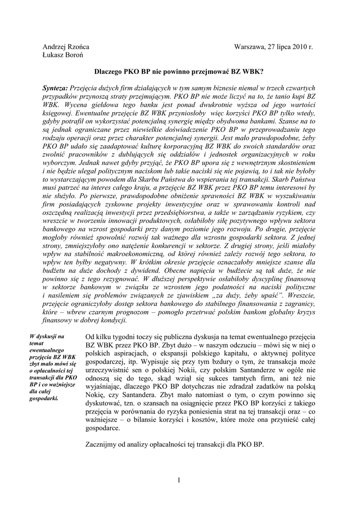 Andrzej Rzońca Łukasz Boroń Warszawa, 27 lipca 2010 r. Dlaczego PKO BP nie powinno przejmować BZ WBK? Synteza: Przejęcia duŜych firm działających w tym samym biznesie niemal w trzech czwartych przypadków przynoszą straty przejmującym. PKO BP nie moŜe liczyć na to, Ŝe tanio kupi BZ WBK. Wycena giełdowa tego banku jest ponad dwukrotnie wyŜsza od jego wartości księgowej. Ewentualne przejęcie BZ WBK przyniosłoby więc korzyści PKO BP tylko wtedy, gdyby potrafił on wykorzystać potencjalną synergię między obydwoma bankami. Szanse na to są jednak ograniczane przez niewielkie doświadczenie PKO BP w przeprowadzaniu tego rodzaju operacji oraz przez charakter potencjalnej synergii. Jest mało prawdopodobne, Ŝeby PKO BP udało się zaadaptować kulturę korporacyjną BZ WBK do swoich standardów oraz zwolnić pracowników z dublujących się oddziałów i jednostek organizacyjnych w roku wyborczym. Jednak nawet gdyby przyjąć, Ŝe PKO BP upora się z wewnętrznym skostnieniem i nie będzie ulegał politycznym naciskom lub takie naciski się nie pojawią, to i tak nie byłoby to wystarczającym powodem dla Skarbu Państwa do wspierania tej transakcji. Skarb Państwa musi patrzeć na interes całego kraju, a przejęcie BZ WBK przez PKO BP temu interesowi by nie słuŜyło. Po pierwsze, prawdopodobne obniŜenie sprawności BZ WBK w wyszukiwaniu firm posiadających zyskowne projekty inwestycyjne oraz w sprawowaniu kontroli nad oszczędną realizacją inwestycji przez przedsiębiorstwa, a takŜe w zarządzaniu ryzykiem, czy wreszcie w tworzeniu innowacji produktowych, osłabiłoby siłę pozytywnego wpływu sektora bankowego na wzrost gospodarki przy danym poziomie jego rozwoju. Po drugie, przejęcie mogłoby równieŜ spowolnić rozwój tak waŜnego dla wzrostu gospodarki sektora. Z jednej strony, zmniejszyłoby ono natęŜenie konkurencji w sektorze. Z drugiej strony, jeśli miałoby wpływ na stabilność makroekonomiczną, od której równieŜ zaleŜy rozwój tego sektora, to wpływ ten byłby negatywny. W krótkim okresie przejęcie oznaczałoby mniejsze szanse dla budŜetu na duŜe dochody z dywidend. Obecne napięcia w budŜecie są tak duŜe, Ŝe nie powinno się z tego rezygnować. W dłuŜszej perspektywie osłabiłoby dyscyplinę finansową w sektorze bankowym w związku ze wzrostem jego podatności na naciski polityczne i nasileniem się problemów związanych ze zjawiskiem „za duŜy, Ŝeby upaść”. Wreszcie, przejęcie ograniczyłoby dostęp sektora bankowego do stabilnego finansowania z zagranicy, które – wbrew czarnym prognozom – pomogło przetrwać polskim bankom globalny kryzys finansowy w dobrej kondycji. W dyskusji na temat ewentualnego przejęcia BZ WBK zbyt mało mówi się o opłacalności tej transakcji dla PKO BP i co waŜniejsze dla całej gospodarki. Od kilku tygodni toczy się publiczna dyskusja na temat ewentualnego przejęcia BZ WBK przez PKO BP. Zbyt duŜo – w naszym odczuciu – mówi się w niej o polskich aspiracjach, o ekspansji polskiego kapitału, o aktywnej polityce gospodarczej, itp. Wypisuje się przy tym bzdury o tym, Ŝe transakcja moŜe urzeczywistnić sen o polskiej Nokii, czy polskim Santanderze w ogóle nie odnoszą się do tego, skąd wziął się sukces tamtych firm, ani teŜ nie wyjaśniając, dlaczego PKO BP dotychczas nie zdradzał zadatków na polską Nokię, czy Santandera. Zbyt mało natomiast o tym, o czym powinno się dyskutować, tzn. o szansach na osiągnięcie przez PKO BP korzyści z takiego przejęcia w porównania do ryzyka poniesienia strat na tej transakcji oraz – co waŜniejsze – o bilansie korzyści i kosztów, które moŜe ona przynieść całej gospodarce. Zacznijmy od analizy opłacalności tej transakcji dla PKO BP. 1 Doświadczenie międzynarodowe pokazuje, Ŝe trzy czwarte duŜych przejęć kończy się stratami przejmującego. Doświadczenie międzynarodowe pokazuje, Ŝe w większości przypadków korzyści z połączenia dwóch firm nie trafiają do podmiotu przejmującego, a do właścicieli podmiotu przejmowanego. Szczególnie często, bo prawie w trzech czwartych przypadków, poraŜką kończą się – z punktu widzenia przejmującego – przejęcia duŜych firm działających w podobnym biznesie (zob. np. Capaldo, Dobbs, Suonio 2008). Aby podmiot przejmujący osiągnął korzyści z przejęcia, musi albo niewiele zapłacić za obiekt transakcji, albo doskonale wykorzystać potencjalną synergię między obydwoma podmiotami, które z kolei powinny być jak największe. PKO BP nie moŜe raczej liczyć na to, Ŝe tanio kupi BZ WBK. Wystawiony na sprzedaŜ bank wyróŜnia się efektywnością wykorzystania kapitałów powierzonych mu przez właścicieli. W 2009 r. Ŝaden z duŜych polskich banków nie potrafił osiągnąć równie wysokiego zysku z jednostki kapitału jak BZ WBK. Wysoka efektywność wykorzystania kapitałów znajduje odzwierciedlenie w wycenie giełdowej tego banku. Jego cena rynkowa jest grubo ponad dwukrotnie wyŜsza od wartości księgowej. Kursowi akcji tego banku nie zaszkodziły kłopoty jego irlandzkiego właściciela. Od początku 2009 r. rósł on o prawie jedną trzecią szybciej niŜ przeciętnie akcje banków notowanych na warszawskiej giełdzie. Wzrost ceny akcji BZ WBK mógł być po części efektem spekulacji pod jego przejęcie. Dla PKO BP nie ma to jednak specjalnego znaczenia. Wykres 1. Zmiana kursu akcji BZ WBK w porównaniu do całego sektora bankowego (WIG-BANKI) od początku 2009 r. WIG-BANKI BZ WBK 2,00 1,80 1,60 1,40 1,20 1,00 0,80 0,60 0,40 0,20 0,00 20 09 -0 20 1-0 5 09 -0 20 2-0 2 09 -0 320 02 09 -0 4 20 09 01 -0 20 5-0 4 09 -0 6 20 -0 1 09 -0 720 01 09 -0 8 -0 20 3 09 -0 920 01 09 -1 020 01 09 -1 20 1-0 2 09 -1 20 2-0 1 10 -0 20 1-0 4 10 -0 20 2-0 1 10 -0 301 20 10 -0 20 4-0 1 10 -0 20 5-0 4 10 -0 20 6-0 1 10 -0 701 PKO BP nie kupi tanio BZ WBK. Wycena giełdowa tego banku jest dwukrotnie wyŜsza od jego wartości księgowej. Źródło: Wyl