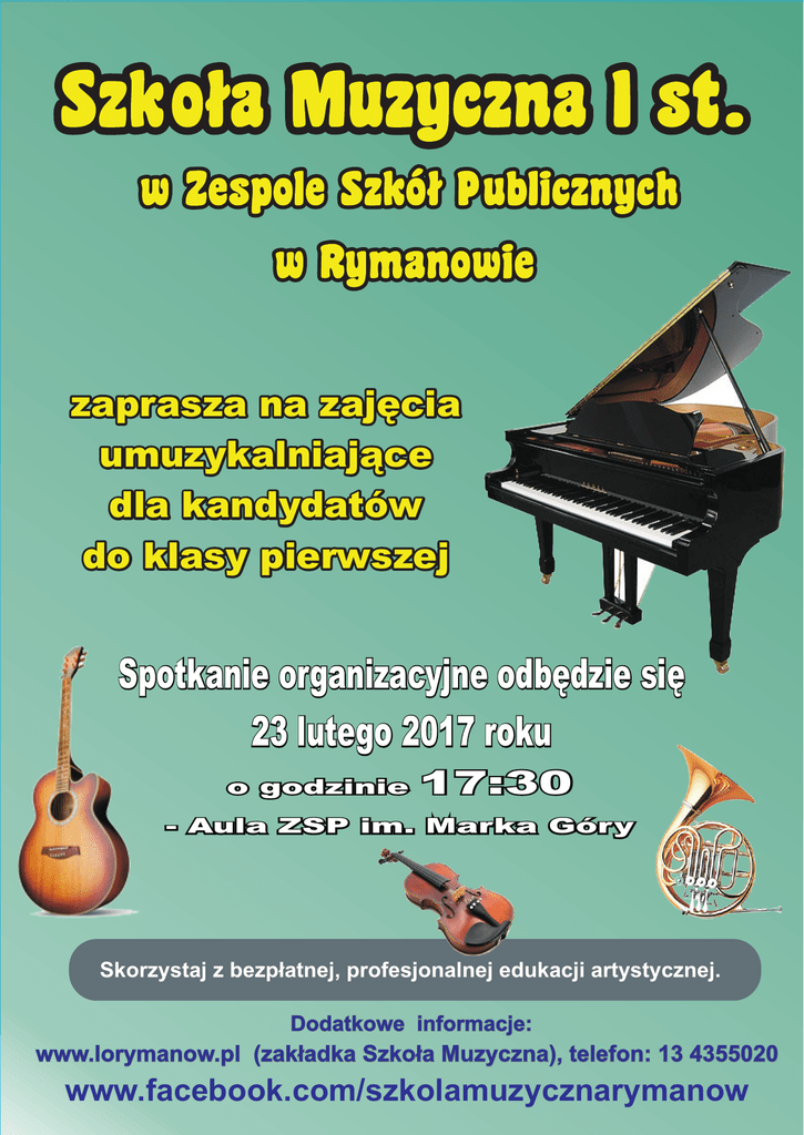 zaprasza na zajêcia umuzykalniaj¹ce dla kandydatów do klasy pierwszej Spotkanie organizacyjne odbêdzie siê 23 lutego 2017 roku o godzinie 17:30 - Aula ZSP im. Marka Góry Skorzystaj z bezp³atnej, profesjonalnej edukacji artystycznej. Dodatkowe informacje: www.lorymanow.pl (zak³adka Szko³a Muzyczna), telefon: 13 4355020 www.facebook.com/szkolamuzycznarymanow