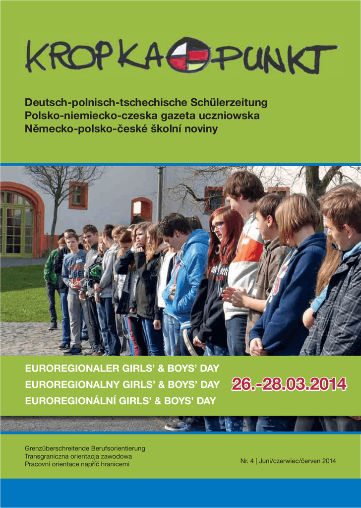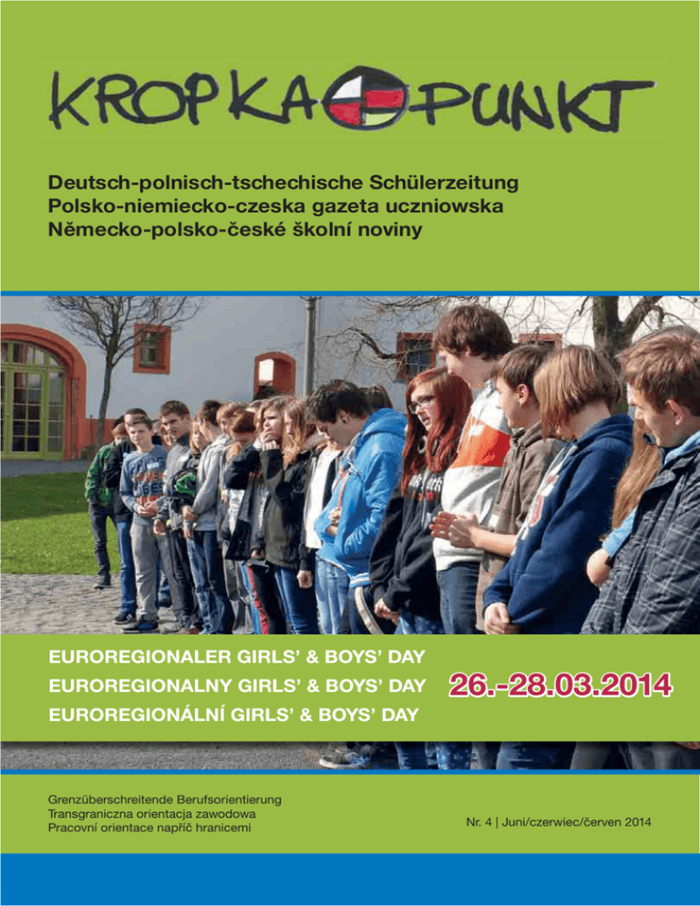 Deutsch-polnisch-tschechische Schülerzeitung Polsko-niemiecko-czeska gazeta uczniowska Německo-polsko-české školní noviny EUROREGIONALER GIRLS’ & BOYS’ DAY EUROREGIONALNY GIRLS’ & BOYS’ DAY 26.-28.03.2014 EUROREGIONÁLNÍ GIRLS’ & BOYS’ DAY Grenzüberschreitende Berufsorientierung Transgraniczna orientacja zawodowa Pracovní orientace napříč hranicemi Nr. 4 | Juni/czerwiec/červen 2014 Liebe Leserinnen und Leser, heute haltet Ihr schon die 4. Ausgabe von Kropka.Punkt in den Händen und die hat es in sich, und zwar gleich dreifach. Denn diese Ausgabe ist dreisprachig – deutsch, polnisch, tschechisch. Grund dafür ist, dass diese Ausgabe sozusagen ein Live-Bericht vom 5. Euroregionalen Girls’ & Boys’ Day ist, der vom 26. bis 28. März diesen Jahres stattfand. Dieser Schülerworkshop zur Berufsorientierung hat Jugendliche aus allen drei Ländern unserer Euroregion für drei Tage im Internationalen Begegnungszentrum St. Marienthal zusammengebracht. Gemeinsam haben sie sich Gedanken um ihre Berufswahl und auch untypische Berufe gemacht. Anschließend schauten sie sich in der Praxis um und besuchten Betriebe und Einrichtungen in Deutschland, Polen und Tschechien – die Jungs im Sozialbereich und die Mädchen im Energiesektor. In dieser Ausgabe von Kropka.Punkt haben wir die Berichte der Jugendlichen, die dabei waren, und allgemeine Infos zum Euroregionalen Girls’ & Boys’ Day für euch zusammengestellt. Viel Spaß beim Lesen! Drodzy Czytelnicy, Dzisiaj trzymacie w rękach IV wydanie gazetki „Kropka.Punkt“. To wydanie przygotowane zostało w trzech językach - niemieckim, polskim i czeskim. Jest sprawozdaniem z V Euroregionalnego Girls’ & Boys’ Day , który odbył się w tym roku w dniach 26 - 28 marca. W tym trzydniowym warsztacie dla uczniów, dotyczącym orientacji zawodowej, w Międzynarodowym Centrum Spotkań St. Marienthal udział wzięli uczestnicy z trzech krajów naszego Euroregionu. Wspólnie zastanawiali się nad wyborem zawodu oraz nad nietypowymi zawodami. Mieli też możliwość poznania zawodów w praktyce i zwiedzali przedsiębiorstwa i placówki w Niemczech, Polsce i Czechach - chłopcy w obszarze społecznym, a dziewczęta w sektorze energetycznym. W tym wydaniu gazetki „Kropka.Punkt“ zostały zamieszczone artykuły młodzieży uczestniczącej w tym wydarzeniu oraz informacje ogólne dotyczące Euroregionalnego Girls’ & Boys’ Day. Życzymy przyjemnej lektury! Milí čtenáři a čtenářky, V rukou držíte už 4. číslo časopisu Kropka.Punkt, který stojí za to hned třikrát. Toto vydání je totiž trojjazyčné: německé, polské a české. Důvodem je, že jej tvoří reportáž z 5. Euroregionálního Girls’ & Boys’ Day, který se uskutečnil mezi 26. a 28. březnem tohoto roku. Tento žákovský workshop zaměřený na pracovní orientaci přivedl na tři dny mladé lidi ze všech třech zemí našeho euroregionu do Mezinárodního centra setkání St. Marienthal. Společně přemýšleli nad výběrem povolání a to i v neobvyklých oblastech. Následně se porozhlédli v praxi a navštívili podniky a zařízení v Německu, Polsku a Česku – chlapci v sociálním a dívky v energetickém sektoru. V tomto vydání časopisu Kropka.Punkt jsme pro Vás připravili zprávy mladých účastníků a všeobecné informace ohledně euroregionálního Girls’ & Boys’ Day. Přejeme Vám příjemnou zábavu při čtení! 2 Day 1 Die Workshops „Berufe der Zukunft“ und „Männerwelten und Frauensachen“ Nachdem alle Teilnehmer in Ostritz eingetroffen waren, wurden alle herzlich begrüßt. Im 1. Workshop unter dem Motto „Berufe der Zukunft“ erhielten wir Einblicke und Informationen zu typischen Berufen für Frauen und Männer. In kleinen Gruppen arbeiteten wir Aufgaben und Ausbildungswege zu den einzelnen Berufsfeldern aus. Unsere zusammengetragenen Ergebnisse stellten wir dann auf Plakaten dar. Nach dem Mittagessen begann unser 2. Workshop. Dieser hieß „Männerwelten und Frauensachen“. Eine Studentin aus Dresden führte zuerst einen kleinen Test mit uns durch. Dazu stellten wir uns draußen in zwei Gruppen auf. Sie stellte uns verschiedene Fragen, die typisch für Frauen und Männer sind, und wir stellten uns mit unseren Antworten an die jeweiligen Stellen. Schnell merkten wir, dass unsere Antworten typisch für das jeweilige Geschlecht waren. Anschließend gab sie uns einige Berufe vor, die wir in Gruppen bearbeiteten, z. B. Einsatz und Aufgaben. Unsere Ergebnisse präsentierten wir auf großen Plakaten. Gemeinsam stellten wir fest, dass jeder jeden Beruf ausüben könnte, also dass es keine typischen Berufe nur für Frauen oder Männer geben sollte. Bei beiden Workshops waren wir in Gruppen mit den polnischen und tschechischen Schülern eingeteilt. Trotz kleiner Sprachschwierigkeiten machte es allen viel Spaß. Lena, Celine und Vivien von der Oberschule „Klaus Riedel“ Bernstadt „Szybkie zapamiętywanie“ W czasie corocznego spotkania młodzieży w czasie „Boys & Girls Day” w IBZ St. Marienthal uczestnicy brali udział w wielu działaniach rozwijających zdolności i umiejętności. Dnia 26 marca, wieczorem, odbyło się ćwiczenie pamięci, w którym brali udział uczniowie i nauczyciele ze szkół z Görlitz, Bernstadt, Hradka i Zawidowa oraz tłumacze uczestniczący w projekcie. Uczniowie i nauczycie z Polski oraz Czech pracowali ze słuchawkami, przez które tłumacze przekazywali w językach narodowych wiadomości pani prowadzącej warsztaty. Na początku przedstawiona została technika masażu uszu, dzięki której można łatwiej się uczyć, gdyż pobudza ona komórki móz- gu, odpowiadające za zapamiętywanie. Następnie przy pomocy tablicy multimedialnej rozwiązywano różnego rodzaju ćwiczenia. Jednym z nich było zapamiętanie rozmieszczenia różnych obrazków, które ponownie pojawiły się po przeprowadzeniu kolejnych ćwiczeń. Zadaniem uczestników było podanie jakie obraz