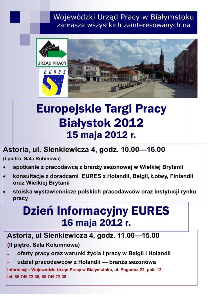 Wojewódzki Urząd Pracy w Białymstoku zaprasza wszystkich zainteresowanych na Europejskie Targi Pracy Białystok 2012 15 maja 2012 r. Astoria, ul. Sienkiewicza 4, godz. 10.00—16.00 (I piętro, Sala Rubinowa) • spotkanie z pracodawcą z branży sezonowej w Wielkiej Brytanii • konsultacje z doradcami EURES z Holandii, Belgii, Łotwy, Finlandii oraz Wielkiej Brytanii • stoiska wystawiennicze polskich pracodawców oraz instytucji rynku pracy Dzień Informacyjny EURES 16 maja 2012 r. Astoria, ul Sienkiewicza 4, godz. 11.00—15.00 (II piętro, Sala Kolumnowa) • oferty pracy oraz warunki życia i pracy w Belgii i Holandii • udział pracodawców z Holandii — branża sezonowa Informacje: Wojewódzki Urząd Pracy w Białymstoku, ul. Pogodna 22, pok. 12 tel. 85 749 72 35, 85 749 72 38