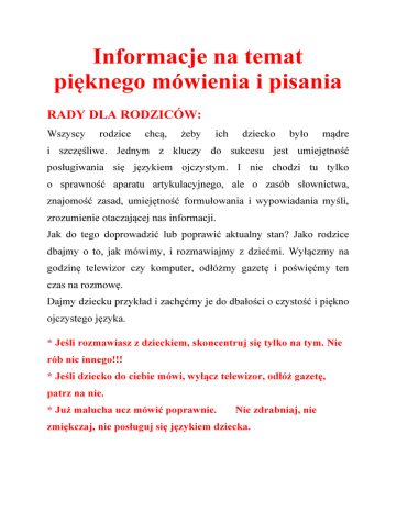 Informacje na temat pięknego mówienia i pisania RADY DLA RODZICÓW: Wszyscy rodzice chcą, żeby ich dziecko było mądre i szczęśliwe. Jednym z kluczy do sukcesu jest umiejętność posługiwania się językiem ojczystym. I nie chodzi tu tylko o sprawność aparatu artykulacyjnego, ale o zasób słownictwa, znajomość zasad, umiejętność formułowania i wypowiadania myśli, zrozumienie otaczającej nas informacji. Jak do tego doprowadzić lub poprawić aktualny stan? Jako rodzice dbajmy o to, jak mówimy, i rozmawiajmy z dziećmi. Wyłączmy na godzinę telewizor czy komputer, odłóżmy gazetę i poświęćmy ten czas na rozmowę. Dajmy dziecku przykład i zachęćmy je do dbałości o czystość i piękno ojczystego języka. * Jeśli rozmawiasz z dzieckiem, skoncentruj się tylko na tym. ie rób nic innego!!! * Jeśli dziecko do ciebie mówi, wyłącz telewizor, odłóż gazetę, patrz na nie. * Już malucha ucz mówić poprawnie. ie zdrabniaj, nie zmiękczaj, nie posługuj się językiem dziecka. Dlaczego dzieci nie mówią ładnie? Dlaczego dzieci nie czytają? Żeby mówić pięknie po polsku, trzeba czytać, czytać i jeszcze raz czytać. Oczywiście nie jest to jedyny warunek opanowania poprawnej polszczyzny, ale niezmiernie ważny. Z doświadczeń wynikających z mojej pracy z dziećmi i ich rodzicami wynika, że są trzy główne powody, dla których dzieci nie czytają: • wzorce rodziców, • media, • dysleksja. Zacznijmy od rodziców. To rodzice dają dzieciom najlepsze wzorce i pomysły na spędzanie wolnego czasu. Ogólnie biorąc, czytamy mało, co prawda książki są drogie, ale pozostają nam przecież biblioteki i czytelnie tradycyjne lub internetowe (które nie cierpią na nadmiar chętnych czytelników, w przeciwieństwie do wypożyczalni wideo). Jeśli dziecko będzie widziało czytających książki rodziców, a oni będą przekonywać je do czytania i pokazywać książkę jako alternatywę spędzania wolnego czasu (tłumacząc, dlaczego książki są mądre i ważne), to z dużym prawdopodobieństwem dziecko zacznie czytać i przekaże później tę pasję swoim dzieciom. Często mówimy: „Nie czytam, bo nie mam na to czasu”. Brak czasu jest naszym cywilizacyjnym problemem i wytłumaczeniem, ale jeśli znajdujemy go na oglądanie telewizji, filmów czy czytanie prasy, to znajdziemy go też na książkę. Właśnie, media. Jak one wpływają na kulturę języka i organizację czasu? Zwróćmy baczniejszą uwagę na to, co dzieci oglądają w mediach: jakim językiem posługują się bohaterowie filmów, gier komputerowych czy wokaliści zespołów. Przede wszystkim zaś – jak mocno media „wciągają” i „namawiają do wiary w to, że tam znajdziemy wszystko, co ważne”. Jaki przekaz niosą reklamy (ostatnio widziałam w jednej z reklam, że podstawową rzeczą, jaką powinniśmy kupić do domu, jest telewizor). Jak trudno zdobyć się na oglądanie tylko tego, co naprawdę nas interesuje. Nie namawiam oczywiście do wyrzucenia telewizora, tylko do zachowania równowagi. Zadbajmy o rodzinę, o wartości warte przekazania i wreszcie o sposób, w jaki je przekazujemy (może zaciekawi Państwa fakt, że 47% Polaków ma problemy ze zrozumieniem tekstów, są funkcjonalnymi analfabetami, między innymi dlatego, że książka i rozmowa zeszły na dalszy plan). Wspomnę jeszcze słowo o trzecim wymienionym przeze mnie powodzie kłopotów z czytaniem i mówieniem, czyli o dysleksji. (specyficzne i złożone problemy w nauce czytania i pisania). Zainteresowanych rozszerzeniem tematu odsyłam do literatury lub niezmierzonych zasobów Internetu. Jeśli Twoje dziecko mimo dobrych wzorców ma kłopoty z czytaniem i poprawnym mówieniem, po prostu udaj się do specjalistycznej poradni, gdzie wszystko zostanie sprawdzone. Dysleksja to nie tragedia, tylko dziecko musi więcej pracować pod opieką pedagoga, psychologa i terapeutów. Jako ciekawostkę powiem, że Albert Einstein, Leonardo da Vinci czy Christian Andersen byli dyslektykami? Na zakończenie powtórzę: dziecko będzie pięknie mówić, jeśli będzie czytać i słyszeć poprawną polszczyznę wokół siebie. Anna Dobosz – pedagog Światłowodem do analfabetyzmu Słyszałeś, jak Twoje dziecko, odchodząc od komputera, mówi coś o jakichś atakujących go ciągle „botach”, o tym, że oczywiście gra była „FPP” i że dodatkowo na innym serwerze został „zbanowany”? A czy wiesz, co znaczy „spox” albo „thx”, które Twoja pociecha wysyła esemesem albo komunikatorem sieciowym? Z drugiej strony czy wypowiedzi Twojego dziecka są płynne, pełne rozbudowanych zdań, poprawne gramatycznie, a może dodatkowo okraszone cytatami i bogate w oryginalne epitety? No właśnie. Imponujący rozwój technologii komputerowych i teleinformatycznych stworzył kolejne wyzwanie dla rodziców i pedagogów, chcących dziecko zainteresować rolą języka, jego użytecznością, poprawnością a także pięknem. Język sieci i gier jest pełen skrótów, zapożyczeń, wszędzie występują kalki językowe. Oczywiście pomagają w szybkiej komunikacji, tyle że bardzo płytkiej. Dodatkowo zamiast spróbować opisywać swoje uczucia wystarczy, wyślemy kilka buziek... Trend na pewno fascynujący dla lingwistów czy socjologów, ale czy nasze dziecko koniecznie musi znać tylko taką formę komunikacji? Dajmy mu szansę i rozmawiajmy z nim. Dużo. Jeszcze więcej. I jeszcze. Prowadźmy niebanalne dyskusje, bierzmy na warsztat kontrowersyjne tematy, aby je wciągać do rozmowy. Starajmy się propagować jego kontakty z rówieśnikami – nie tylko z tymi ukrytymi za ekranem i za swoim nickiem, ale z tymi realnymi, z twarzą, głosem, mimiką i gestem... Ewa Baran-Pełka – psycholog Rodzicu!!! Chcesz, aby Twoje dziecko ładnie mówiło? Jeśli chcesz aby Twoje dziecko ładnie mówiło... ... i rozwijało swoje zdolności językowe, lubiło mówić i wypowiadało się poprawnie, przyda Ci się znajom