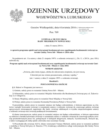 DZIENNIK URZĘDOWY WOJEWÓDZTWA LUBUSKIEGO Gorzów Wielkopolski, dnia 6 kwietnia 2016 r. Elektronicznie podpisany przez: Anna Zacharia; LUW Poz. 769 Data: 2016-04-06 11:38:00 UCHWAŁA NR XXV/186/16 RADY MIEJSKIEJ W NOWEJ SOLI z dnia 31 marca 2016 r. w sprawie programu opieki nad zwierzętami bezdomnymi oraz zapobiegania bezdomności zwierząt na terenie Gminy Nowa Sól - Miasto w 2016 roku Na podstawie art. 11a ustawy z dnia 21 sierpnia 1997r. o ochronie zwierząt (t. j. Dz. U. z 2013r., poz. 856.) uchwala się: Program opieki nad zwierzętami bezdomnymi oraz zapobiegania bezdomności zwierząt na terenie Gminy Nowa Sól - Miasto w roku 2016 WPROWADZENIE „Zwierzę, jako istota żyjąca, zdolna do odczuwania cierpienia, nie jest rzeczą. Człowiek jest mu winien poszanowanie, ochronę i opiekę.” (art. 1 ustawy z dnia 21 sierpnia 1997r. o ochronie zwierząt). Rozdział I. POSTANOWIENIA OGÓLNE § 1. Ilekroć w Programie jest mowa o: 1) Gminie, należy przez to rozumieć Gminę Nowa Sól – Miasto; 2) Schronisku, należy przez to rozumieć Miejskie Schronisko dla Bezdomnych Zwierząt przy ul. Żukowickiej 1a w Głogowie; 3) Straży Miejskiej, należy przez to rozumieć Straż Miejską w Nowej Soli; 4) Policji, należy przez to rozumieć Komendę Powiatową Policji w Nowej Soli; 5) przytulisku, należy przez to rozumieć miejsce nie będące schroniskiem, w którym zapewnione są właściwe warunki bytowania zwierząt w rozumieniu ustawy o ochronie zwierząt do czasowego pobytu zwierząt agresywnych stwarzających zagrożenie dla ludzi, zwierząt odebranych w wyniku nieprzestrzegania ustawy o ochronie zwierząt oraz zwierząt poddanych kwarantannie; 6) domu tymczasowym, należy przez to rozumieć miejsce nie będące schroniskiem, w którym zapewnione są właściwe warunki bytowania zwierząt w rozumieniu ustawy o ochronie zwierząt do czasowego pobytu zwierząt poszkodowanych przez los, potrąconych w kolizjach drogowych, rannych, wycieńczonych, chorych itp., a także wymagających stałej opieki człowieka oraz szczeniąt i kociąt; 7) Przychodni dla zwierząt ALFA, lekarz weterynarii Tomasz Mieluch, należy przez to rozumieć podmiot z siedzibą w Nowej Soli przy ul. Staszica 17/8, świadczący całodobowe usługi weterynaryjne dla Gminy Nowa Sól – Miasto; Dziennik Urzędowy Województwa Lubuskiego –2– Poz. 769 8) Przychodni weterynaryjnej Centaur Grzegorz Nowacki, podmiot z siedzibą w Głogowie przy ul. Rycerskiej 23, świadczący usługi odławiania bezdomnych zwierząt pochodzących z terenu Gminy Nowa Sól – Miasto; 9) gospodarstwie rolnym, należy przez to rozumieć gospodarstwo położone Lubieszów 7, 67-100 Nowa Sól, w którym zapewnione jest miejsce dla zwierząt gospodarskich; 10) zwierzętach bezdomnych, należy przez to rozumieć zwierzęta domowe lub gospodarskie, które uciekły, zabłąkały się lub zostały porzucone przez człowieka, a nie ma możliwości ustalenia ich właściciela lub innej osoby, pod której opieką trwale dotąd pozostawały; 11) zwierzętach domowych, należy przez to rozumieć zwierzęta tradycyjnie przebywające wraz z człowiekiem w jego domu lub odpowiednim pomieszczeniu, utrzymywane przez człowieka w charakterze jego towarzysza; 12) kotach wolno żyjących, należy przez to rozumieć koty urodzone lub żyjące na wolności (żyjące w otoczeniu człowieka w stanie dzikim); 13) Programie, należy przez to rozumieć Program opieki nad zwierzętami bezdomnymi oraz zapobiegania bezdomności zwierząt na terenie Gminy Nowa Sól-Miasto w 2016 roku. Rozdział II. CEL, ZADANIA I WYKONAWCY PROGRAMU § 2. 1. Celem Programu jest zapobieganie bezdomności zwierząt na terenie Gminy oraz opieka nad zwierzętami bezdomnymi. 2. Zadania priorytetowe Programu to: 1) elektroniczne znakowanie (czipowanie) psów; 2) ograniczanie populacji bezdomnych zwierząt poprzez sterylizację i kastrację psów i kotów oraz usypianie ślepych miotów; 3) zapewnienie opieki bezdomnym zwierzętom z Gminy; a) sprawowanie opieki nad kotami wolno żyjącymi, w tym ich dokarmianie; b) poszukiwanie nowych właścicieli dla bezdomnych zwierząt; c) niesienie pomocy zwierzętom poszkodowanym przez los, potrąconym w kolizjach drogowych, rannym, wycieńczonym, chorym, wymagającym stałej opieki człowieka oraz szczeniętom i kociętom; 4) zapewnienie całodobowej opieki weterynaryjnej w przypadkach zdarzeń drogowych z udziałem zwierząt; 5) odławianie bezdomnych zwierząt; 6) edukacja mieszkańców Nowej Soli w zakresie opieki nad zwierzętami. 3. Wykonawcami programu są: 1) Gmina; 2) Straż Miejska i Policja; 3) Organizacje społeczne, których statutowym celem działania jest ochrona zwierząt; 4) Miejskie Schronisko dla Bezdomnych Zwierząt przy ul. Żukowickiej 1a w Głogowie; 5) Przychodnia dla zwierząt ALFA, lek. wet. Tomasz Mieluch przy ul. Staszica 17/8 w Nowej Soli; 6) Przychodnia weterynaryjna Centaur Grzegorz Nowacki, przy ul. Rycerskiej 23 w Głogowie; 7) Gospodarstwo rolne położone w Lubieszów 7, 67-100 Nowa Sól, Dziennik Urzędowy Województwa Lubuskiego –3– Poz. 769 Rozdział III. ELEKTRONICZNE ZNAKOWANIE (CZIPOWANIE) PSÓW § 3. Elektroniczne znakowanie (czipowanie) zwierząt to jedna z głównych metod zapobiegania bezdomności zwierząt, realizowana przez: 1) Gminę poprzez: a) prowadzenie od 2009 roku akcji bezpłatnego czipowania psów, których właściciele zamieszkują na terenie Gminy oraz bezdomnych psów z terenu Gminy, b) wprowadzanie danych o zaczipowanych zwierzętach do bazy Safe-Animal, zrzeszonej w European Pet Network; 2) Schronisko poprzez: a) znakowanie (czipowanie) bezdomnych zwierząt przyjmowanych do Schroniska, b) bieżące wprowadzanie danych o zaczipowanych zwierzętach do Międzynarodowej Bazy Danych SafeAnimal, zrzeszonej w European Pet Network. Rozdział IV. OGRANICZANIE POPULACJI BEZDOMNYCH ZWIERZĄT § 4. Ograniczanie populacji bezdomnych zwierząt realizują: 1) Gmina poprzez: a) wykonywanie na koszt Gmin