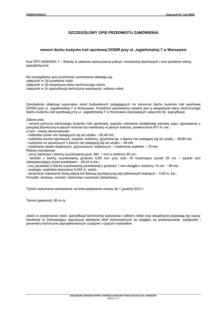 DOSiR/3/N/2012 Załącznik Nr 2 do SIWZ SZCZEGÓŁOWY OPIS PRZEDMIOTU ZAMÓWIENIA remont dachu budynku hali sportowej DOSiR przy ul. Jagiellońskiej 7 w Warszawie Kod CPV 45260000–7 – Roboty w zakresie wykonywania pokryć i konstrukcji dachowych i inne podobne roboty specjalistyczne Na szczegółowy opis przedmiotu zamówienia składają się: załącznik nr 2a przedmiar robót załącznik nr 2b ekspertyza stanu technicznego dachu załącznik nr 2c specyfikacja techniczna wykonania i odbioru robót Zamówienie obejmuje wykonanie robót budowlanych polegających na remoncie dachu budynku hali sportowej DOSiR przy ul. Jagiellońskiej 7 w Warszawie. Przedmiot zamówienia zawarty jest w ekspertyzie stanu technicznego dachu budynku hali sportowej przy ul. Jagiellońskiej 7 w Warszawie stanowiącym załącznik do specyfikacji. Zakres prac: - remont pokrycia dachowego budynku hali sportowej, poprzez nałożenie dodatkowej warstwy papy zgrzewalnej z posypką bitumiczną w jasnym kolorze lub membrany w jasnym kolorze, powierzchnia 977 m. kw.; w tym - roboty demontażowe: - rozbiórka rynien nie nadających się do użytku – 80,40 mb; - rozbiórka murów ogniowych, okapów, kołnierzy, gzymsów itp. z blachy nie nadającej się do użytku – 38,80 mb; - rozbiórka rur spustowych z blachy nie nadającej się do użytku – 38 mb; - rozebranie desek okapowych, gzymsowych, wiatrowych – rozebranie szalówki – 18 mb; Roboty montażowe: - rynny dachowe z blachy ocynkowanej grub. Min. 1 mm o średnicy 20 cm.; - obróbki z blachy ocynkowanej grubości 0,50 mm przy szer. W rozwinięciu ponad 25 cm – wysoki rant zabezpieczający przed przelewem – 48,24 m.kw.; - rury spustowe z blachy ocynkowanej powlekanej o grubości 1 mm okrągłe o średnicy 15 cm. – 38 mb.; - analogia: szalówka drewniana 0,045 m. sześć.; - dwukrotne malowanie farbą olejną lub ftalową (syntetyczną) płyt pilśniowych twardych – 4,50 m. kw.; Ponadto: dostawy, montaż i demontaż rusztowań (dzierżawa). Termin wykonania zamówienia: od dnia podpisania umowy do 1 grudnia 2012 r. Termin gwarancji: 36 m-cy Jeżeli w przedmiarze robót, specyfikacji technicznej wykonania i odbioru robót oraz ekspertyzie pojawiają się nazwy handlowe to Zamawiający dopuszcza składanie ofert równoważnych ze względu na przeznaczenie, wydajność i parametry techniczne zaprojektowanych urządzeń i użytych materiałów. DZIELNICOWY OŚRODEK SPORTU I REKREACJI DZIELNICY PRAGA PÓŁNOC M.ST. WARSZAWY Strona 1 z 1