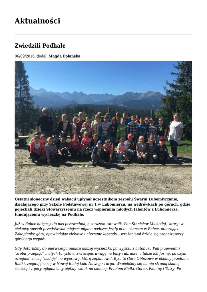 Aktualności Zwiedzili Podhale 06/09/2016, dodał: Magda Polańska Ostatni słoneczny dzień wakacji upłynął uczestnikom zespołu Śwarni Lubomiyrzanie, działającego przy Szkole Podstawowej nr 1 w Lubomierzu, na wędrówkach po górach, gdzie pojechali dzięki Stowarzyszeniu na rzecz wspierania młodych talentów z Lubomierza, fundującemu wycieczkę na Podhale. Już w Rabce dołączył do nas przewodnik, a zarazem ratownik, Pan Stanisław Mlekodaj, który w ciekawy sposób przedstawiał miejsca mijane podczas jazdy m.in. skansen w Rabce, otaczające Zakopiankę góry, opowiadając ciekawe i nieznane legendy – wrażeniami dzielą się organizatorzy górskiego wypadu. Gdy dotarliśmy do pierwszego punktu naszej wycieczki, po wyjściu z autobusu Pan przewodnik "zrobił przegląd" małych turystów, zwracając uwagę na buty i ubranie, a także ich formę, po czym oznajmił, że się "nadają" na wyprawę, którą zaplanował. Była to Góra Obłazowa w okolicy przełomu Białki, znajdująca się w Nowej Białej koło Nowego Targu. Wspięliśmy się na nią stromą skalną ścieżką i z góry oglądaliśmy piękny widok na okolicę: Przełom Białki, Gorce, Pieniny i Tatry. Po zejściu w okolicę rzeki, prowadzący opowiadał o zwyczajach zbójników, by zaprowadzić nas do Jaskini Obłazowej, która została nazwana świętym miejscem dla archeologów z powodu odkryć, których tam dokonano m. in. najstarszy bumerang świata wykonany z ciosu mamuta datowany ok. 23 0000 lat p.n.e. Kolejne miejsce, do którego dotarliśmy to Głodówka znajdująca się w okolicy Bukowiny Tatrzańskiej. Tam obok schroniska, zobaczyliśmy przepiękny widok szczytów najwyższych gór polskich, które Pan przewodnik omówił krok po kroku. Dodatkowo udostępniono nam lunetę, dzięki której mogliśmy obserwować panoramę Tatr z bliska. Punktem kulminacyjnym było jednak zdobycie szczytu Nosal. Strome podejścia i zmęczenie nie przeszkadzały, ponieważ rekompensowały je zapierające dech w piersiach widoki. Wszyscy dotarli na górę, która wznosi się 1206m n.p.m. Podziwiając to przepiękne wzniesienie reglowe w Tatrach Zachodnich, oglądaliśmy rozpościerające się szczyty górskie przed nami. Zeszliśmy inną drogą do Kuźnic. Tam w Spichlerzu i Wozowni - Kolekcja Antoniego Kocyana - podziwialiśmy różne eksponaty m.in. zwierzęta żyjące w Tatrach. Trochę zmęczeni ale bardzo dumni z siebie i zadowoleni udaliśmy się na obiad do zakopiańskiego pensjonatu. Środowa lekcja przyrody, historii, archeologii, a przede wszystkim przetrwania była dla nas wszystkich nowością. Była to wycieczka, która wymagała od wszystkich zaangażowania – dodają Śwarni Lubomiyrzanie. Serdeczne podziękowania kierujemy w stronę Pani Dyrektor Jadwigi Baran-Stożek za pomoc oraz oczywiście s. Elżbiecie Ciebierze za wiarę, że wszyscy dotrzemy na szczyt – wyrazy wdzięczności przekazują organizatorzy. Polecamy taki rodzaj aktywności wszystkim góralom zagórzańskim. Dostrzegajmy i doceniajmy to co nas otacza, bo to nasz mały raj na ziemi, który jest na wyciągnięcie ręki. Katarzyna Wojtyczka Dorota Wcisło