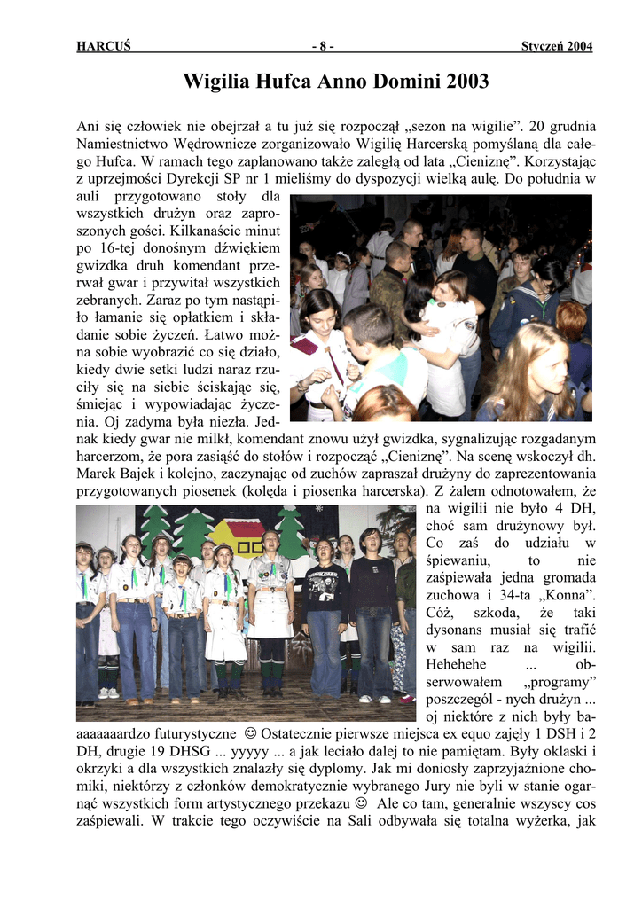 HARCUŚ -8- Styczeń 2004 Wigilia Hufca Anno Domini 2003 Ani się człowiek nie obejrzał a tu już się rozpoczął „sezon na wigilie”. 20 grudnia Namiestnictwo Wędrownicze zorganizowało Wigilię Harcerską pomyślaną dla całego Hufca. W ramach tego zaplanowano także zaległą od lata „Cieniznę”. Korzystając z uprzejmości Dyrekcji SP nr 1 mieliśmy do dyspozycji wielką aulę. Do południa w auli przygotowano stoły dla wszystkich drużyn oraz zaproszonych gości. Kilkanaście minut po 16-tej donośnym dźwiękiem gwizdka druh komendant przerwał gwar i przywitał wszystkich zebranych. Zaraz po tym nastąpiło łamanie się opłatkiem i składanie sobie życzeń. Łatwo można sobie wyobrazić co się działo, kiedy dwie setki ludzi naraz rzuciły się na siebie ściskając się, śmiejąc i wypowiadając życzenia. Oj zadyma była niezła. Jednak kiedy gwar nie milkł, komendant znowu użył gwizdka, sygnalizując rozgadanym harcerzom, że pora zasiąść do stołów i rozpocząć „Cieniznę”. Na scenę wskoczył dh. Marek Bajek i kolejno, zaczynając od zuchów zapraszał drużyny do zaprezentowania przygotowanych piosenek (kolęda i piosenka harcerska). Z żalem odnotowałem, że na wigilii nie było 4 DH, choć sam drużynowy był. Co zaś do udziału w śpiewaniu, to nie zaśpiewała jedna gromada zuchowa i 34-ta „Konna”. Cóż, szkoda, że taki dysonans musiał się trafić w sam raz na wigilii. Hehehehe ... obserwowałem „programy” poszczegól - nych drużyn ... oj niektóre z nich były baaaaaaaardzo futurystyczne ☺ Ostatecznie pierwsze miejsca ex equo zajęły 1 DSH i 2 DH, drugie 19 DHSG ... yyyyy ... a jak leciało dalej to nie pamiętam. Były oklaski i okrzyki a dla wszystkich znalazły się dyplomy. Jak mi doniosły zaprzyjaźnione chomiki, niektórzy z członków demokratycznie wybranego Jury nie byli w stanie ogarnąć wszystkich form artystycznego przekazu ☺ Ale co tam, generalnie wszyscy cos zaśpiewali. W trakcie tego oczywiście na Sali odbywała się totalna wyżerka, jak HARCUŚ -8- Styczeń 2004 również toczono rozmowy kuluarowe. Tak to jest kiedy się harcerze nie mogą sobą nacieszyć, bo nie widzieli się ze sobą aż kilka godzin. Tworzyły się „wędrówki ludów” i zbiórki nieformalnych grup. Kiedy śpiewy już umilkły, wszyscy ponownie zajęli miejsca przy stołach. Nadeszła pora na wspólne zaśpiewanie kilku kolęd. Nic nie trwa wiecznie, więc czas pożegnania się musiał nadejść prędzej czy później. Komendant zaprosił wszystkich do Kręgu. Ale co to był za Krąg ! Zajęliśmy calutki korytarz szkolny stojąc ciasno obok siebie. Kilka słów podziękowania, życzenia dla członków drużyn i ich rodziców, i już śpiewamy „Bratnie słowo”. Po rozwiązaniu Kręgu, druh komendant zaprasza kadrę instruktorską „do klasy nr 4”. Niektórzy bardzo się przestraszyli myśląc, że czeka ich jakaś klasówka ☺ Na szczęście komendant miał na myśli coś zgoła innego. Szybko ustawiliśmy krzesełka w krąg i ... zaczęliśmy śpiewać. Były kolędy, piosenki harcerskie i turystyczne. Były uśmiechy i druh, który pięknie grał na harmonijce ustnej i Hania jak zwykle super fajnie grająca na gitarce. A oprócz tego była druhna Iwona (hehehe ... w roli „czworonoga” – o kulach po złamaniu nogi) i były nasze harcerskie małżeństwa ze swoimi przezabawnymi dzieciaczkami. Oczywiście nie zabrakło też poczęstunku z przygotowanych wigilijnych wiktuałów. Nastrojowe piosenki i kolędy bardzo wzruszyły druhnę Dorotkę, która kilka dni wcześniej zdała funkcję drużynowej 4 GZ „Leśne ludki”. Niestety ... matura a co za tym idzie koniec luzów w czasie wolnym. Hehehehehe ... po raz pierwszy 20 DSH „Szare i Wilki” dała się niemal w całości sfotografować. Widok to rzadki i ciekawy ... prawie tak jak zrobienie fotki tygrysowi bengalskiemu ☺ Jakoś tak po 19-tej druh komendant rzucił hasło do pożegnania. Kolejny Krąg Pożegnalny – tym razem instruktorski. No niemal instruktorski. Znalazło się w nim dwoje przedstawicieli Namiestnictwa Wędrowniczego, na ręce których druh Marek złożył podziękowania. Coś tam przy tym wspominał niezbyt głośno, że niektórych nie było ale nie zrozumiałem kogo miał na myśli – czy zaproszonych gości, czy harcerzy z drużyn, czy innych członków Namiestnictwa (może z tych ostatnich nie wszyscy zostali zaproszeni do „klasy nr 4” ?). A po tym już tylko porządki i po wigilii. Teraz już tylko wigilie drużyn i te rodzinne w naszych własnych domach. HARCUŚ -8- Styczeń 2004 Hm. Marek Niewiarowski