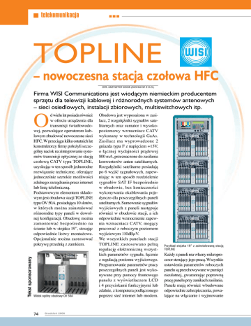 telekomunikacja TOPLINE – nowoczesna stacja czołowa HFC Opr. Krzysztof Sidor (Diomar sp. z o.o.) Firma WISI Communications jest wiodàcym niemieckim producentem sprz´tu dla telewizji kablowej i ró˝norodnych systemów antenowych – sieci osiedlowych, instalacji zbiorowych, multiswitchowych itp. O Tekst sponsorowany d wielu lat posiada również w ofercie urządzenia dla transmisji światłowodowej, pozwalające operatorom kablowym zbudować nowoczesne sieci HFC. W przeciągu kilku ostatnich lat konstruktorzy firmy położyli szczególny nacisk na zintegrowanie systemów transmisji optycznej ze stacją czołową CATV typu TOPLINE, uzyskując w ten sposób jednorodne rozwiązanie techniczne, oferujące jednocześnie szerokie możliwości zdalnego zarządzania przez internet lub linię telefoniczną. Podstawowym elementem składowym jest obudowa stacji TOPLINE typu OV 50A, posiadająca 10 slotów, w których można zainstalować różnorodne typy paneli w dowolnej konfiguracji. Obudowę można zamontować bezpośrednio na ścianie lub w stojaku 19”, stosując odpowiednie listwy montażowe. Opcjonalnie można zastosować pokrywę przednią z zamkiem. Widok ogólny obudowy OV 50A 74 Grudzieƒ 2006 Obudowa jest wyposażona w zasilacz, 2 rozgałęźniki sygnałów satelitarnych oraz sumator i wysokopoziomowy wzmacniacz CATV wykonany w technologii GaAs. Zasilacz ma wyprowadzone 2 gniazda typu F z napięciem +13V, o łącznej wydajności prądowej 800 mA, przeznaczone do zasilania konwerterów anten satelitarnych. Rozgałęźniki satelitarne posiadają po 6 wyjść sygnałowych, zapewniając w ten sposób rozdzielenie sygnałów SAT IF bezpośrednio w obudowie, bez konieczności wykonywania okablowania pojedynczo dla poszczególnych paneli satelitarnych. Sumowanie sygnałów wyjściowych z paneli następuje również w obudowie stacji, a ich odpowiednie wzmocnienie zapewnia wzmacniacz CATV, mogący pracować z roboczym poziomem wyjściowym 110dBµV. We wszystkich panelach stacji TOPLINE zastosowano pełną regulację elektroniczną wszystkich parametrów sygnału, łącznie z regulacją poziomu wyjściowego. Programowanie parametrów pracy poszczególnych paneli jest wykonywane przy pomocy frontowego panelu z wyświetlaczem LCD i 4 przyciskami funkcyjnymi lub zdalnie, z komputera podłączonego poprzez sieć internet lub modem. Przykład stojaka 19” z zainstalowanà stacjà TOPLINE Każdy z paneli ma własny mikroprocesor sterujący jego pracą. Wszystkie ustawienia parametrów roboczych panelu są przechowywane w pamięci nieulotnej, gwarantując poprawną pracę panelu przy zanikach zasilania. Panele mają również wbudowane odpowiednie zabezpieczenia, powalające na włączanie i wyjmowanie ich z pracującej obudowy, bez ryzyka uszkodzenia spowodowanego przepięciem. Szeroka gama dostępnych paneli decyduje o niezwykle wysokiej elastyczności konfiguracji stacji telekomunikacja SIECI KABLOWE N MEDIA N BIZNES N TELEKOMUNIKACJA N NOWE TECHNOLOGIE TOPLINE. W tabeli zostały przedstawione ich najbardziej istotne parametry użytkowe: Panele do transmisji optycznej LT 53, LT 53 400 nadajnik optyczny DFB z laserem niechłodzonym Nadajniki optyczne CATV o mocy wyjÊciowej 4dBm (2,5 mW) i 6 dBm (4 mW), pracujàce dla długoÊci fali 1310 nm. W nadajnikach jest zastosowana pełna automatyka wzmocnienia sygnału w.cz. Standardowy typ złàcza optycznego E2000. LT 54 1000, LT 53 1600 nadajnik optyczny DFB z laserem chłodzonym Nadajniki optyczne CATV o mocy wyjÊciowej 10 dBm (10 mW) i 12 dBm (16 mW), pracujàce dla długoÊci fali 1310 nm. W nadajnikach jest zastosowana pełna automatyka wzmocnienia sygnału w.cz. Standardowy typ złàcza optycznego E2000. LT 61 nadajnik optyczny DFB dla CATV + SAT IF z laserem niechłodzonym Nadajnik optyczny z oddzielnymi wejÊciami CATV i SAT IF, o mocy wyjÊciowej 4 dBm (2,5 mW), pracujàcy dla długoÊci fali 1310 nm. W nadajniku jest zastosowana pełna automatyka wzmocnienia sygnału w.cz. Standardowy typ złàcza optycznego E2000. LR 52 podwójny odbiornik optyczny kanału zwrotnego Praca w paÊmie 5÷100 MHz z 2 niezale˝nymi sygnałami optycznymi z zakresu 1290÷1600nm, przedział mocy wejÊciowej –12dBm÷+2dBm, mo˝liwoÊç konfiguracji do pracy w sieciach z redundancjà tras kablowych. Standardowy typ złàcza optycznego E2000. Panele do odbioru sygna∏ów cyfrowych OV 79, OV 79S odbiornik DVB-T z modulatorem TV Głowica odbiorcza pracuje w paÊmie 49÷862 MHz dla spektrum 2k i 8k, modulacji QPSK oraz 16 i 64 QAM. Modulator PAL/SECAM/NTSCM pracuje w paÊmie 45÷862 MHz w standardach B/G, D/K, I, L, M w trybie mono (oraz stereo i dual dla OV 79S). OV 76/76S, OV 77/77S odbiornik DVB-S z modulatorem TV Głowica satelitarna pracuje w paÊmie 950÷2150 MHz. Dodatkowo panel OV 77 / 77S posiada gniazdo CI na moduł CAM. Modulator PAL/SECAM/NTSC-M pracuje w paÊmie 45÷862 MHz w standardach B/G, D/K, I, L, M w trybie mono (oraz stereo i dual dla OV 76S i 77S). OV 75, OV 75A transmodulator DVB-S - QAM Głowica satelitarna pracuje w paÊmie 950÷2150 MHz. Konwersja do modulacji 4-, 16-, 32-, 64-, 128-, 256 QAM. Modulator QAM pracuje w paÊmie 45÷862MHz. Dodatkowo panel OV 75A zapewnia filtrowanie 10 PID-ów OV 75C, OV 75D transmodulator DVB-S-QAM z wejÊciem i wyjÊciem ASI Głowica satelitarna pracuje w paÊmie 950÷2150 MHz. Strumieƒ transportowy TS wyprowadzony na wyjÊcie ASI. Modulator QAM, z wejÊciem ASI, pracuje w paÊmie 45÷862 MHz. Dodatkowo panel OV 75D zapewnia filtrowanie 10 PID-ów. Panele do odbioru sygna∏ów analogowych OV 45D przemiennik TV analogowej oraz DVB-T i DVB-C Obsługiwane standardy: kanały analogowe o szerokoÊci 7 i 8 MHz, kanały cyfrowe DVB-T i DVB-C o szerokoÊci 7 i 8 MHz. Skuteczne filtry IF pozwalajà na prac´ sàsiedniokanałowà dla sygnałów wejÊciowych i wyjÊciowych. Panel pracuje w paÊmie 45÷862 MHz, ARW działa dla sygnału wejÊciowego w zakresie 50÷90 dBµV. OV 55, OV 85 analogowy odbiornik SAT z modu