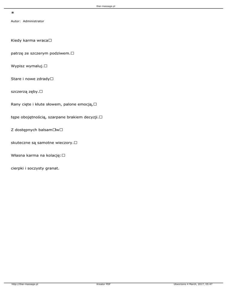 thai-massage.pl * Autor: Administrator Kiedy karma wraca patrzę ze szczerym podziwem. Wypisz wymaluj. Stare i nowe zdrady szczerzą zęby. Rany cięte i kłute słowem, palone emocją, tępe obojętnością, szarpane brakiem decyzji. Z dostępnych balsamÃłw skuteczne są samotne wieczory. Własna karma na kolację: cierpki i soczysty granat. http://thai-massage.pl Kreator PDF Utworzono 4 March, 2017, 05:47