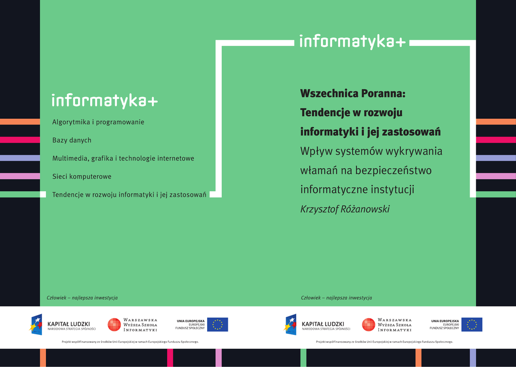 Wszechnica Poranna: Tendencje w rozwoju informatyki i jej zastosowań Wpływ systemów wykrywania włamań na bezpieczeństwo informatyczne instytucji Krzysztof Różanowski Wpływ systemów wykrywania włamań na bezpieczeństwo informatyczne instytucji Rodzaj zajęć: Wszechnica Poranna Tytuł: Wpływ systemów wykrywania włamań na bezpieczeństwo informatyczne instytucji Autor: dr inż. Krzysztof Różanowski Redaktor merytoryczny: prof. dr hab. Maciej M Sysło Zeszyt dydaktyczny opracowany w ramach projektu edukacyjnego Informatyka+ — ponadregionalny program rozwijania kompetencji uczniów szkół ponadgimnazjalnych w zakresie technologii informacyjno-komunikacyjnych (ICT). www.informatykaplus.edu.pl [email protected] Wydawca: Warszawska Wyższa Szkoła Informatyki ul. Lewartowskiego 17, 00-169 Warszawa www.wwsi.edu.pl [email protected] Projekt graficzny: FRYCZ I WICHA Warszawa 2009 Copyright © Warszawska Wyższa Szkoła Informatyki 2009 Publikacja nie jest przeznaczona do sprzedaży. Wpływ systemów wykrywania włamań na bezpieczeństwo informatyczne instytucji Krzysztof Różanowski WWSI Warszawa [email protected] <4> ■ ■ ■ Informatyka + Streszczenie Wykład Na wykładzie zostaną przedstawione podstawowe pojęcia i definicje związane z bezpieczeństwem informatycznym. Bezpieczeństwo jest elementem szerszego kontekstu, nazywanego wiarygodnością systemu informatycznego, dlatego na tle podstawowych atrybutów informacji związanych z systemem przedstawione i omówione zostaną dodatkowe atrybuty wiarygodności. Przedstawione zostanie znaczenie bezpieczeństwa w odniesieniu do roli systemów informatycznych, trudności związanych ze skonstruowaniem i eksploatacją systemu spełniającego wysokie wymagania w zakresie bezpieczeństwa oraz elementarnego konfliktu interesów występującego pomiędzy użytecznością systemu, a ryzykiem związanym z jego wykorzystaniem. Przedstawione zostaną również współczesne zagrożenia bezpieczeństwa i przykłady ataków na systemy informatyczne. Omówione będą też następujące kwestie: Ataki i zagrożenia przypadkowe lub powstałe w efekcie celowego działania. Ataki i zagrożenia mogące wynikać z nieświadomości lub naiwności użytkownika lub motywowane chęcią zysku czy odwetu. Ataki i zagrożenia mogące pochodzić z zewnątrz systemu lub od jego środka. Większość działań skierowanych w efekcie przeciwko bezpieczeństwu komputerowemu jest w świetle aktualnego prawa traktowana jako przestępstwa. Praktycznie wszystkie przypadki naruszające bezpieczeństwo wyczerpują znamiona przestępstw określonych w obowiązującym prawie. Dlatego w trakcie wykładu poruszone zostaną również aspekty prawne. Przedstawione zostaną komponenty systemu informatycznego w kontekście bezpieczeństwa (stanowisko komputerowe i infrastruktura sieciowa, system operacyjny i usługi narzędziowe, aplikacje użytkowe) oraz wskazówki do projektowania systemów zabezpieczeń. Omówione zostaną problemy bezpieczeństwa sieci komputerowych w warstwie sieciowej i transportowej. Na tej podbudowie scharakteryzowane zostaną przywołane w temacie systemy wykrywania włamań IDS/IPS, których zadaniem jest identyfikacja i reagowanie na nieautoryzowaną działalność skierowaną przeciwko chronionym zasobom sieciowym. Charakterystyka dotyczyć będzie trzech głównych rodzajów systemów IDS (HIDS, NIDS, NNIDS). Warsztaty Laboratorium dedykowane jest praktycznej realizacji i testowaniu skuteczność działań systemów wykrywania włamań na przykładzie programu SNORT, który jest programem typu open-source, docelowo stworzonym dla systemu UNIX, dostępnym także dla systemu Windows. Służyć może do analizy pakietów, wyszukiwania i dopasowywania podejrzanych treści, a także wykrywania ataków i anomalii np. ataków na serwery WWW, ukrytego skanowania portów czy prób identyfikacji. Dla słuchaczy przygotowane zostanie środowisko pracy w postaci maszyny wirtualnej z konfiguracją: system SNORT, aplikacja zarządzania danymi BASE dla danych z systemu SNORT, serwer WWW+ PHP, MySQL, ADOdb, zestaw exploitów oraz skaner sieciowy (Nessus). Celem ćwiczeń będzie właściwa konfiguracja i utworzenie własnych reguł wykrywania włamań i ich kwalifikacja do określonej klasy ataków w zależności od sygnatur wykorzystywanych exploitów. Ataki te będą typu SQL Injection. System SNORT zostanie przetestowany w trzech trybach pracy: Sniffer – przechwytywanie wszystkich pakietów i wyświetlanie na ekranie, Packet Logger – zapis wszystkich przechwyconych pakietów do pliku, Network Intrusion Detection Mode – sieciowy system wykrywania włamań. > Wpływ systemów wykrywania włamań na bezpieczeństwo <5> Spis treści Wprowadzenie ................................................................................................................................................. 6 1. Krótka charakterystyka systemów wykrywania włamań.............................................................................. 6 2. System wykrywania włamań SNORT ............................................................................................................ 7 2.1. Monitor pakietów................................................................................................................................... 7 2.2. Blok preprocesora ................................................................................................................................. 8 2.3. Mechanizm detekcji włamań ................................................................................................................. 9 2.4. Konfiguracja i uruchomienie systemu SNORT ...................................................................................... 12 2.5. Koncepcje rozwojowe systemu SNORT................................................................................................. 15 3. Warsztaty. Praktyczna realizacja ćwiczeń ........