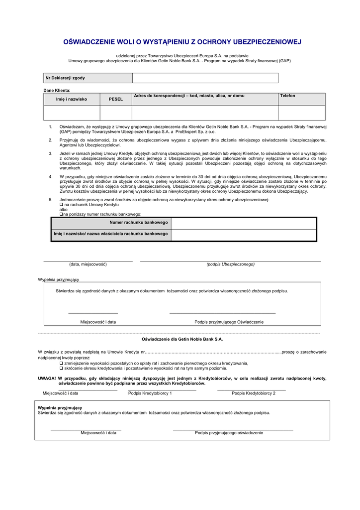 OŚWIADCZENIE WOLI O WYSTĄPIENIU Z OCHRONY UBEZPIECZENIOWEJ udzielanej przez Towarzystwo Ubezpieczeń Europa S.A. na podstawie Umowy grupowego ubezpieczenia dla Klientów Getin Noble Bank S.A. - Program na wypadek Straty finansowej (GAP) Nr Deklaracji zgody Dane Klienta: Imię i nazwisko PESEL Adres do korespondencji – kod, miasto, ulica, nr domu Telefon 1. Oświadczam, że występuję z Umowy grupowego ubezpieczenia dla Klientów Getin Noble Bank S.A. - Program na wypadek Straty finansowej (GAP) pomiędzy Towarzystwem Ubezpieczeń Europa S.A. a ProEkspert Sp. z o.o. 2. Przyjmuję do wiadomości, że ochrona ubezpieczeniowa wygasa z upływem dnia złożenia niniejszego oświadczenia Ubezpieczającemu, Agentowi lub Ubezpieczycielowi. 3. Jeżeli w ramach jednej Umowy Kredytu objętych ochroną ubezpieczeniową jest dwóch lub więcej Klientów, to oświadczenie woli o wystąpieniu z ochrony ubezpieczeniowej złożone przez jednego z Ubezpieczonych powoduje zakończenie ochrony wyłącznie w stosunku do tego Ubezpieczonego, który złożył oświadczenie. W takiej sytuacji pozostali Ubezpieczeni pozostają objęci ochroną na dotychczasowych warunkach. 4. W przypadku, gdy niniejsze oświadczenie zostało złożone w terminie do 30 dni od dnia objęcia ochroną ubezpieczeniową, Ubezpieczonemu przysługuje zwrot środków za objęcie ochroną w pełnej wysokości. W sytuacji, gdy niniejsze oświadczenie zostało złożone w terminie po upływie 30 dni od dnia objęcia ochroną ubezpieczeniową, Ubezpieczonemu przysługuje zwrot środków za niewykorzystany okres ochrony. Zwrotu kosztów ubezpieczenia w pełnej wysokości lub za niewykorzystany okres ochrony Ubezpieczonemu dokona Ubezpieczający. 5. Jednocześnie proszę o zwrot środków za objęcie ochroną za niewykorzystany okres ochrony ubezpieczeniowej: na rachunek Umowy Kredytu albo na poniższy numer rachunku bankowego: Numer rachunku bankowego Imię i nazwisko/ nazwa właściciela rachunku bankowego (data, miejscowość) (podpis Ubezpieczonego) Wypełnia przyjmujący Stwierdza się zgodność danych z okazanym dokumentem tożsamości oraz potwierdza własnoręczność złożonego podpisu. _____________________ Miejscowość i data _____________________________________________ Podpis przyjmującego Oświadczenie -------------------------------------------------------------------------------------------------------------------------------------------------------------------------------------------------------Oświadczenie dla Getin Noble Bank S.A. W związku z powstałą nadpłatą na Umowie Kredytu nr………………………………………………………………………………….....proszę o zarachowanie nadpłaconej kwoty poprzez: zmniejszenie wysokości pozostałych do spłaty rat i zachowanie pierwotnego okresu kredytowania, skrócenie okresu kredytowania i pozostawienie wysokości rat na tym samym poziomie. UWAGA! W przypadku, gdy składający niniejszą dyspozycję jest jednym z Kredytobiorców, w celu realizacji zwrotu nadpłaconej kwoty, oświadczenie powinno być podpisane przez wszystkich Kredytobiorców. _________________________ _____________________________ _____________________________ Miejscowość i data Podpis Kredytobiorcy 1 Podpis Kredytobiorcy 2 Wypełnia przyjmujący Stwierdza się zgodność danych z okazanym dokumentem tożsamości oraz potwierdza własnoręczność złożonego podpisu. ______________________________ Miejscowość i data ___________________________________________________ Podpis przyjmującego oświadczenie