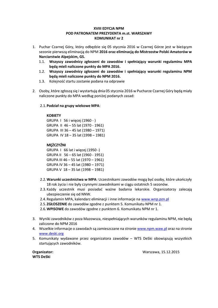 XVIII EDYCJA NPM POD PATRONATEM PREZYDENTA m.st. WARSZAWY KOMUNIKAT nr 2 1. Puchar Czarnej Góry, który odbędzie się 05 stycznia 2016 w Czarnej Górze jest w bieżącym sezonie pierwszą eliminacją do NPM 2016 oraz eliminacją do Mistrzostw Polski Amatorów w Narciarstwie Alpejskim, GS. 1.1. Wszyscy zawodnicy zgłoszeni do zawodów i spełniający warunki regulaminu MPA będą mieli naliczone punkty do MPA 2016. 1.2. Wszyscy zawodnicy zgłoszeni do zawodów i spełniający warunki regulaminu NPM będą mieli naliczone punkty do NPM 2016. 1.3. Kolejność startu zostanie podana na odprawie 2. Osoby, które zgłoszą się i wystartują dnia 05 stycznia 2016 w Pucharze Czarnej Góry będą miały naliczone punkty do MPA według poniżej podanych zasad: 2.1. Podział na grupy wiekowe MPA: KOBIETY GRUPA I 56 i więcej (1960 - ) GRUPA II 46 – 55 lat (1970 - 1961) GRUPA III 36 – 45 lat (1980 – 1971) GRUPA IV 18 – 35 lat (1998 – 1981) MĘŻCZYŹNI GRUPA I 66 lat i więcej (1950 -) GRUPA II 56 – 65 lat (1960 - 1951) GRUPA III 46 – 55 lat (1970 – 1961) GRUPA IV 36 – 45 lat (1980 – 1971) GRUPA V 18 – 35 lat (1998 – 1981) 2.2. Warunki uczestnictwa w MPA: Uczestnikami zawodów mogą być osoby, które ukończyły 18 rok życia i nie były czynnymi zawodnikami w ciągu ostatnich 5 sezonów. 2.3. Każdy uczestnik musi posiadać ważne badania lekarskie. Organizatorzy zalecają ubezpieczenie się od NNW. 2.4. Regulamin MPA, kalendarz eliminacji i inne informacje na www.wnp.pzn.pl 2.5. ZGŁOSZENIE do zawodów zgodne z punktem 5. Komunikatu NPM nr 1. 2.6. WPISOWE do zawodów zgodne z punktem 6. Komunikatu NPM nr 1. 3. Wyniki zawodników z poza Mazowsza, niespełniających warunków regulaminu NPM, nie będą zaliczone do NPM 2016 4. Wszelkie informacje o zawodach są zamieszczane na stronie www.npm.waw.pl oraz na stronie www.deski.org 5. Komunikaty wydawane przez organizatora zawodów – WTS DeSki obowiązują wszystkich startujących zawodników. Organizator: WTS DeSki Warszawa, 15.12.2015