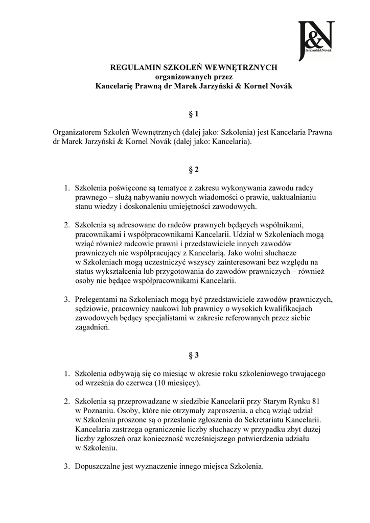 REGULAMIN SZKOLEŃ WEWNĘTRZNYCH organizowanych przez Kancelarię Prawną dr Marek Jarzyński & Kornel Novák §1 Organizatorem Szkoleń Wewnętrznych (dalej jako: Szkolenia) jest Kancelaria Prawna dr Marek Jarzyński & Kornel Novák (dalej jako: Kancelaria). §2 1. Szkolenia poświęcone są tematyce z zakresu wykonywania zawodu radcy prawnego – służą nabywaniu nowych wiadomości o prawie, uaktualnianiu stanu wiedzy i doskonaleniu umiejętności zawodowych. 2. Szkolenia są adresowane do radców prawnych będących wspólnikami, pracownikami i współpracownikami Kancelarii. Udział w Szkoleniach mogą wziąć również radcowie prawni i przedstawiciele innych zawodów prawniczych nie współpracujący z Kancelarią. Jako wolni słuchacze w Szkoleniach mogą uczestniczyć wszyscy zainteresowani bez względu na status wykształcenia lub przygotowania do zawodów prawniczych – również osoby nie będące współpracownikami Kancelarii. 3. Prelegentami na Szkoleniach mogą być przedstawiciele zawodów prawniczych, sędziowie, pracownicy naukowi lub prawnicy o wysokich kwalifikacjach zawodowych będący specjalistami w zakresie referowanych przez siebie zagadnień. §3 1. Szkolenia odbywają się co miesiąc w okresie roku szkoleniowego trwającego od września do czerwca (10 miesięcy). 2. Szkolenia są przeprowadzane w siedzibie Kancelarii przy Starym Rynku 81 w Poznaniu. Osoby, które nie otrzymały zaproszenia, a chcą wziąć udział w Szkoleniu proszone są o przesłanie zgłoszenia do Sekretariatu Kancelarii. Kancelaria zastrzega ograniczenie liczby słuchaczy w przypadku zbyt dużej liczby zgłoszeń oraz konieczność wcześniejszego potwierdzenia udziału w Szkoleniu. 3. Dopuszczalne jest wyznaczenie innego miejsca Szkolenia. 2 4. Organizacją i koordynacją Szkoleń zajmuje się osoba wyznaczona przez Kancelarię (dalej jako: Koordynator). Koordynator może ustanowić swojego zastępcę. 5. Dokumentacja dotycząca Szkoleń jest przechowywana w Sekretariacie Kancelarii. Dopuszcza się jej archiwizację po zakończeniu roku szkoleniowego. 6. Dalsze rozpowszechnianie otrzymanych materiałów opracowanych do celów szkoleniowych wymaga zgody autora oraz Kancelarii. §4 1. Zawiadomienia o terminach Szkoleń są publikowane z wyprzedzeniem na stronie internetowej Kancelarii i rozsyłane do stałych uczestników Szkoleń drogą listowną lub za pośrednictwem poczty elektronicznej. 2. Tematyka Szkoleń jest publikowana i rozsyłana w sposób wskazany w ust. 1 powyżej z co najmniej tygodniowym wyprzedzeniem, przy czym w uzasadnionych wypadkach dopuszczalne jest zawiadomienie w krótszym terminie. §5 1. Prelegenci oraz Uczestnicy Szkoleń wyrażają zgodę na przechowywanie przez Kancelarię danych dotyczących ich udziału w Szkoleniach dla potrzeb wykazania ilości godzin szkolenia / przeprowadzania wykładu i uzyskanych z tego tytułu punktów szkoleniowych w ramach ustawicznego kształcenia zawodowego radców prawnych. 2. Udział w Szkoleniu w charakterze słuchacza uczestnik potwierdza poprzez złożenie podpisu na liście obecności wraz z podaniem numeru wpisu na listę samorządu zawodowego. 3. Osoba wygłaszająca referat / prowadząca wykład na Szkoleniu jest obowiązana do podpisania zestawienia tematów danego Szkolenia w zakresie objętym jej referatem / wykładem ze wskazaniem ilości godzin szkoleniowych, a w przypadku radców prawnych również z podaniem numeru wpisu na listę radców prawnych. 4. Listę obecności oraz zestawienie tematów Szkolenia, o których mowa w ust. 2 i 3 powyżej, podpisuje Koordynator. 3 5. Po zakończeniu każdego roku szkoleniowego Kancelaria wystawia każdemu uczestnikowi Szkoleń zaświadczenie (certyfikat) zawierające informację o terminach, formie i zakresie Szkoleń, w których dana osoba uczestniczyła jako słuchacz lub wykładowca. 6. W zaświadczeniu, o którym mowa w ust. 5 powyżej, podaje się informację o ilości punktów szkoleniowych wyznaczonej zgodnie z § 3 ust. 2 Uchwały nr 30/B/VII/2008 Krajowej Rady Radców Prawnych z dnia 6 czerwca 2008 r. w sprawie określenia zasad wypełniania przez radcę prawnego obowiązku brania udziału w szkoleniach zawodowych. 7. Na życzenie każdego uczestnika Szkoleń zaświadczenie, o którym mowa w ust. 5 powyżej, może zostać wystawione również w innym terminie, przy czym wówczas objęte nim terminy Szkoleń nie są uwzględniane w zaświadczeniu wystawianym na koniec roku szkoleniowego. §6 Wszelkie uwagi dotyczące przeprowadzonych Szkoleń lub propozycje nowych tematów przyjmuje Koordynator Szkoleń. §7 Niniejszy regulamin udostępnia się każdemu zainteresowanemu w Sekretariacie Kancelarii oraz na stronie internetowej. Poznań, dnia 2 września 2013 r.
