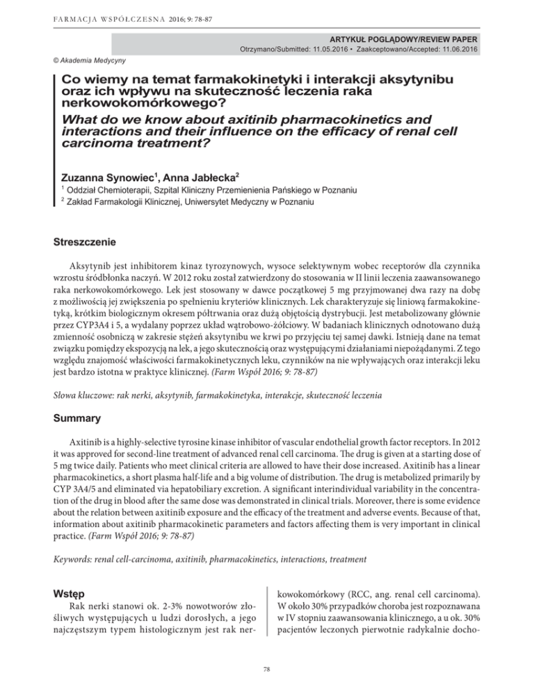 78 FA R M A C J A W S P Ó Ł C Z E S N A 2016; 9: 78-87 ARTYKUŁ POGLĄDOWY/REVIEW PAPER Otrzymano/Submitted: 11.05.2016 • Zaakceptowano/Accepted: 11.06.2016 © Akademia Medycyny Co wiemy na temat farmakokinetyki i interakcji aksytynibu oraz ich wpływu na skuteczność leczenia raka nerkowokomórkowego? What do we know about axitinib pharmacokinetics and interactions and their influence on the efficacy of renal cell carcinoma treatment? Zuzanna Synowiec1, Anna Jabłecka2 1 2 Oddział Chemioterapii, Szpital Kliniczny Przemienienia Pańskiego w Poznaniu Zakład Farmakologii Klinicznej, Uniwersytet Medyczny w Poznaniu Streszczenie Aksytynib jest inhibitorem kinaz tyrozynowych, wysoce selektywnym wobec receptorów dla czynnika wzrostu śródbłonka naczyń. W 2012 roku został zatwierdzony do stosowania w II linii leczenia zaawansowanego raka nerkowokomórkowego. Lek jest stosowany w dawce początkowej 5 mg przyjmowanej dwa razy na dobę z możliwością jej zwiększenia po spełnieniu kryteriów klinicznych. Lek charakteryzuje się liniową farmakokinetyką, krótkim biologicznym okresem półtrwania oraz dużą objętością dystrybucji. Jest metabolizowany głównie przez CYP3A4 i 5, a wydalany poprzez układ wątrobowo-żółciowy. W badaniach klinicznych odnotowano dużą zmienność osobniczą w zakresie stężeń aksytynibu we krwi po przyjęciu tej samej dawki. Istnieją dane na temat związku pomiędzy ekspozycją na lek, a jego skutecznością oraz występującymi działaniami niepożądanymi. Z tego względu znajomość właściwości farmakokinetycznych leku, czynników na nie wpływających oraz interakcji leku jest bardzo istotna w praktyce klinicznej. (Farm Współ 2016; 9: 78-87) Słowa kluczowe: rak nerki, aksytynib, farmakokinetyka, interakcje, skuteczność leczenia Summary Axitinib is a highly-selective tyrosine kinase inhibitor of vascular endothelial growth factor receptors. In 2012 it was approved for second-line treatment of advanced renal cell carcinoma. The drug is given at a starting dose of 5 mg twice daily. Patients who meet clinical criteria are allowed to have their dose increased. Axitinib has a linear pharmacokinetics, a short plasma half-life and a big volume of distribution. The drug is metabolized primarily by CYP 3A4/5 and eliminated via hepatobiliary excretion. A significant interindividual variability in the concentration of the drug in blood after the same dose was demonstrated in clinical trials. Moreover, there is some evidence about the relation between axitinib exposure and the efficacy of the treatment and adverse events. Because of that, information about axitinib pharmacokinetic parameters and factors affecting them is very important in clinical practice. (Farm Współ 2016; 9: 78-87) Keywords: renal cell-carcinoma, axitinib, pharmacokinetics, interactions, treatment Wstęp kowokomórkowy (RCC, ang. renal cell carcinoma). W około 30% przypadków choroba jest rozpoznawana w IV stopniu zaawansowania klinicznego, a u ok. 30% pacjentów leczonych pierwotnie radykalnie docho- Rak nerki stanowi ok. 2-3% nowotworów złośliwych występujących u ludzi dorosłych, a jego najczęstszym typem histologicznym jest rak ner- 78 FA R M A C J A W S P Ó Ł C Z E S N A 2016; 9: 78-87 Farmakokinetyka aksytynibu i czynniki na nią wpływające dzi w późniejszym czasie do uogólnienia choroby. Obecność przerzutów odległych wymaga wdrożenia leczenia systemowego, a RCC jest nowotworem chemioopornym. Stosowanie cytostatyków można rozważać jedynie w rzadkich przypadkach zaawansowanego RCC o zróżnicowaniu mięsakowatym i wywodzącego się z kanalików zbiorczych [1-4]. Rak jasnokomórkowy (ccRCC – clear cell renal cell carcinoma) stanowi ok. 80% przypadków RCC [1]. Leki obecnie stosowane w leczeniu zaawansowanego RCC zostały zarejestrowane w większości przypadków do leczenia chorych z podtypem jasnokomórkowym lub z jego przeważającą komponentą (≥ 50% utkania). Należą one do grupy inhibitorów kinaz tyrozynowych (TKIs, ang. tyrosine kinase inhibitors), przeciwciał monoklonalnych oraz inhibitorów szlaku mTOR (ang. mammalian target of rapamycin). Jedynie w wyselekcjonowanych przypadkach stosuje się obecnie cytokiny. Przed wprowadzeniem leków ukierunkowanych molekularnie to właśnie immunoterapia była przez wiele lat głównym sposobem leczenia RCC [3-6]. Aksytynib został zarejestrowany przez Amerykańską Agencję ds. Żywności i Leków (FDA, ang. US Food and Drug Administration) do stosowania w II linii leczenia zaawansowanego raka nerkowokomórkowego na podstawie wyników badania III fazy AXIS [7]. Aksytynib (Inlyta®) to pochodna indazolowa. Lek jest inhibitorem kinaz tyrozynowych, silnym i wysoce selektywnym wobec receptorów dla czynnika wzrostu śródbłonka naczyń VEGFR 1-3 (ang. vascular endothelial growth factor receptor) [8,9]. Jego działanie inhibicyjne występuje już przy stężeniach subnanomolarnych, IC50 (ang. half maximal inhibitory concentration; stężenie, przy którym następuje blokowanie 50% aktywności receptorów) wynosi 0,10,3 nM [5,9]. Aktywność leku wobec receptorów dla płytkopochodnego czynnika wzrostu (PDGF, ang. platelet-derived growth factor) oraz czynnika wzrostu komórek pnia (c-KIT) wykazana in vitro jest około 8 razy słabsza w porównaniu do aktywności wobec VEGFRs. Aksytynib łączy się selektywnie z wewnątrzkomórkowymi domenami VEGFR1-3 blokując ich autofosforylację. W ten sposób hamuje wewnątrzkomórkową transdukcję sygnału, a w efekcie negatywnie wpływa na przeżycie i proliferację komórek śródbłonka oraz ich zdolność do formowania naczyń [9,10]. Aksytynib charakteryzuje się liniową farmakokinetyką w zakresie dawek od 1 do 20 mg przyjmowanych dwa razy na dobę [11]. Biodostępność leku po podaniu doustnym wynosi 58%. Maksymalne stężenie aksytynibu we krwi (Cmax) osiągane jest po czasie (Tmax) wynoszącym 2,5-4,1 godz. Okres biologicznego półtrwania (t1/2