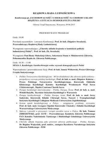 RZĄDOWA RADA LUDNOŚCIOWA Konferencja pt. ZACHOROWALNOŚĆ I UMIERALNOŚĆ NA CHOROBY UKŁADU KRĄŻENIA A SYTUACJA DEMOGRAFICZNA POLSKI Główny Urząd Statystyczny, Warszawa, 09.06.2015 PRZEWIDYWANY PROGRAM Godz. 10.00 Powitanie uczestników i otwarcie Konferencji, Prof. dr hab. Zbigniew Strzelecki, Przewodniczący Rządowej Rady Ludnościowej Wystąpienie wprowadzające :„Choroby układu krążenia w kontekście polityki ludnościowej Polski”, Prof. dr hab. Zb. Strzelecki, Wystąpienie Pani Beaty Małeckiej-Libery, Sekretarza Stanu w Ministerstwie Zdrowia, Pełnomocnika Rządu ds. Zdrowia Publicznego. Godz. 10.30 – 13.00 SESJA I. Kardiologia i kardiochirurgia wobec wyzwań demograficznych Polski Wprowadzenie i przewodniczenie Sesji: Prof. dr hab. Janusz Witkowski, Prezes Głównego Urzędu Statystycznego 1. Polskie Towarzystwo Kardiologiczne: 60 lat działalności dla zdrowia społeczeństwa perspektywy rozwoju polskiej kardiologii, Prof. dr hab. n. med. Zbigniew Kalarus – Prezes Polskiego Towarzystwa Kardiologicznego, Kierownik Oddziału Klinicznego Kardiologii Katedry Kardiologii Wrodzonych Wad Serca i Elektroterapii , Śląskie Centrum Chorób Serca 2. Postępy kardiologii interwencyjnej – Polska, Europa, Świat, Prof. dr hab. n. med. Witold Rużyłło, Dyrektor Instytutu Kardiologii w Warszawie 3. Postępy kardiochirurgii – Polska, Europa, świat, Prof. dr hab. n. med. Jerzy Sadowski, Kierownik Kliniki Chirurgii Serca, Naczyń i Transplantologii Instytutu Kardiologii Collegium Medicum Uniwersytetu Jagiellońskiego 4. System opieki kardiologicznej w Polsce – osiągnięcia, problemy, wyzwania, Prof. dr hab. med. Grzegorz Opolski Kierownik I Katedry i Kliniki Kardiologii Warszawskiego Uniwersytetu Medycznego 5. Sukcesy i porażki w prewencji i terapii zawałów serca w Polsce, Dr hab. Tomasz ZDROJEWSKI, prof. GUM – Przewodniczący Komitetu Zdrowia Publicznego PAN Katedra Nadciśnienia Tętniczego i Diabetologii Gdańskiego Uniwersytetu Medycznego 6. Choroby układu krążenia jako priorytet zdrowia publicznego - Polska, Europa, Dr Bogdan Wojtyniak, prof. nadzw., zastępca Dyrektora Narodowego Instytutu Zdrowia Publicznego - PZH Dyskusja 13.00 – 13.30 Przerwa - poczęstunek 13.30 – 16.00 SESJA II. Choroby naczyń; ChUK - zdrowie publiczne i polityka ludnościowa Wprowadzenie i przewodniczenie Sesji: Prof. dr hab. n. med. Janusz Szymborski, Rządowa Rada Ludnościowa 1. Choroby naczyń mózgowych w Polsce: diagnoza i rekomendacje, Prof. dr hab. n. med. Danuta Ryglewicz, Dyrektor Instytutu Psychiatrii i Neurologii 2. Nadciśnienie tętnicze – jak się zaczyna i jak się może kończyć? Prof. dr hab. n. med. Zbigniew Gaciong, Kierownik Katedry i Kliniki Chorób Wewnętrznych, Nadciśnienia Tętniczego i Angiologii Warszawskiego Uniwersytetu Medycznego 3. Choroby zakrzepowo – zatorowe układu naczyniowego – jak przeżyć? Prof. dr hab. n. med. Adam Torbicki, Kierownik Kliniki Krążenia Płucnego i Chorób Zakrzepowo-Zatorowych, Ordynator Oddziału Kardioangiologii, Europejskie Centrum Zdrowia - Otwock 4. Prewencja chorób układu krążenia w Polsce – czy to się opłaca? Prof. dr hab. n. med. Wojciech Drygas, Kierownik Zakładu Epidemiologii, Prewencji Chorób Układu Krążenia i Promocji Zdrowia Instytutu Kardiologii w Warszawie 5. Wielkość i struktura świadczeń związanych z chorobami układu krążenia finansowanych ze środków publicznych oraz efekty prowadzonych przez Narodowy Fundusz Zdrowia programów rehabilitacji i profilaktyki ChUK, Prezes NFZ 6. Wielkość i struktura świadczeń związanych z chorobami układu krążenia oraz efekty rehabilitacji leczniczej pacjentów z ChUK w ramach prewencji rentowej Zakładu Ubezpieczeń Społecznych, Prezes ZUS 7. Projekt dokumentu: Stanowisko RRL w sprawie zachorowalności i umieralności na choroby układu krążenia w kontekście sytuacji demograficznej Polski Dyskusja