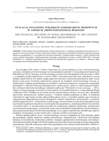 STOWARZYSZENIE EKONOMISTÓW ROLNICTWA I AGROBIZNESU Sytuacja finansowa wiejskich gospodarstw domowych w aspekcie zrównoważonego rozwoju Roczniki Naukowe ● tom XVI ● zeszyt 1 147 Anna Murawska Uniwersytet Technologiczno-Przyrodniczy w Bydgoszczy SYTUACJA FINANSOWA WIEJSKICH GOSPODARSTW DOMOWYCH W ASPEKCIE ZRÓWNOWAŻONEGO ROZWOJU THE FINANCIAL SITUATION OF RURAL HOUSEHOLDS IN THE CONTEXT OF SUSTAINABLE DEVELOPMENT Słowa kluczowe: dochody, obszary wiejskie, gospodarstwo domowe, współczynnik Giniego, zrównoważony rozwój Key words: income, rural areas, household, Gini coefficient, sustainable development Abstrakt. Celem badań było przedstawienie sytuacji finansowej w wiejskich gospodarstwach domowych w aspekcie zrównoważonego rozwoju. Dokonano analizy wybranych wskaźników charakteryzujących sytuację finansową gospodarstw, w szczególności poziomu dochodów, współczynnika Giniego, a także subiektywnej oceny sytuacji materialnej. Zaprezentowano dynamikę zachodzących zmian w latach 2003-2012. Sytuacja dochodowa w wiejskich gospodarstwach domowych dynamicznie poprawia się, jednak w dalszym ciągu występują znaczne dysproporcje regionalne. Wstęp Od początku XXI wieku w Polsce obserwuje się rozwój działań na rzecz zrównoważonego rozwoju, a tematyka zrównoważonego rozwoju podejmowana była w licznych pracach naukowych [Michaliszyn 2012]. Strategia zrównoważonego rozwoju Unii Europejskiej (UE) powstała w 2001 r., a następnie została odnowiona w czerwcu 2006 r. Naczelnym jej celem jest „określenie i rozwój działań, dzięki którym UE będzie mogła zapewnić obecnym i przyszłym pokoleniom stały wzrost jakości życia przez tworzenie społeczności opartych na zasadach zrównoważonego rozwoju, tj. społeczności wydajnie gospodarujących zasobami i z nich korzystających, czerpiących z potencjału gospodarki w zakresie innowacji ekologicznych i społecznych, a przez to zapewniających dobrobyt, ochronę środowiska naturalnego i spójność społeczną” [Wskaźniki zrównoważonego…. 2011]. Wpływ zrównoważonego rozwoju na wzrost jakości życia podkreślali już w swojej definicji Bergh i Nijkamp [1991]. Według ich rozważań rozwój zrównoważony istnieje wówczas, gdy „dynamika aktywności ekonomicznej, ludzkie postawy i wielkość ludzkiej populacji są takie, że każdemu człowiekowi zapewniona zostaje odpowiednia jakość życia, a wszystkie aspekty tego rozwoju są zabezpieczone długookresowo przez dostępność zasobów naturalnych, ekosystemów i systemów podtrzymujących życie”. Zatem biorąc to pod uwagę, zrównoważony rozwój utrzymuje jakość życia na poziomie na jaki pozwala obecny rozwój społeczno-gospodarczy, zaspokaja podstawowe potrzeby wszystkich ludzi i w konsekwencji prowadzi do zwiększenia spójności społecznej, zmniejszenia rozwarstwienia społecznego, wyrównania szans, przeciwdziałania marginalizacji i dyskryminacji, a także podnoszenia jakości środowiska naturalnego, m.in. poprzez ograniczenie szkodliwego wpływu produkcji i konsumpcji na stan środowiska i ochronę zasobów przyrodniczych. Podczas badania jakości życia i zrównoważonego rozwoju uwzględnia się wiele dziedzin, takich jak demografia, aspekty społeczne, aspekty ekonomiczne, zaangażowanie i aktywność obywatelską, edukację i wykształcenie, środowisko, podróże i transport, społeczeństwo informacyjne oraz kulturę i rekreację [Kronenberg, Bergier 2010]. Szczególne znaczenie dla zrównoważonego rozwoju mają aspekty ekonomiczne, takie jak rynek pracy, aktywność gospodarcza oraz zróżnicowanie dochodów i ubóstwo1. 1 Polska przyjęła w 2000 r. Deklarację Milenijną, co oznacza zobowiązanie naszego kraju do podjęcia wysiłku, aby wyznaczone cele deklaracji zostały zrealizowane do 2015 r., a jednym z nich jest zmniejszenie liczby osób żyjących w ubóstwie. Na podstawie [Milenijne cele rozwoju, www.unic.un.org.pl]. 148 Anna Murawska Rozwarstwienie dochodów w miejskich i wiejskich gospodarstwach domowych jest jednym z kluczowych problemów zrównoważonego rozwoju. Określa bowiem zakres w jakim z istniejącego zasobu dóbr korzystają poszczególni członkowie społeczeństwa i ich rodziny oraz stopień, w jakim wzrost tego zasobu wpływa na społeczny dobrobyt [Szopa, Leszczyńska 2004]. Według Sena [1973, 2000] analiza poziomu dochodów i wydatków, a zatem sytuacji finansowej gospodarstw domowych jest dobrym miernikiem efektywności gospodarczej, lecz nie uwzględnia społecznego wymiaru badanego zjawiska. Sen założył, że ta sama kwota pieniędzy jest spożytkowana bardziej efektywnie, jeżeli rozdzielona jest bardziej równomiernie między członków zbiorowości i zaproponował, aby miarą dobrobytu społecznego była funkcja rosnąca ze względu na średni poziom dochodów i malejąca ze względu na wartość miernika nierówności. Materiał i metodyka badań Celem badań było ukazanie sytuacji finansowej wiejskich gospodarstw domowych na tle gospodarstw domowych ogółem i zlokalizowanych w miastach. Na podstawie analizy sytuacji finansowej starano się sprawdzić, czy w ostatnich latach były realizowane główne cele i wyzwania strategii zrównoważonego rozwoju, zwłaszcza w zakresie dobrobytu gospodarczego i spójności społecznej. Dokonano analizy sytuacji finansowej według grup społeczno-ekonomicznych, klasy miejscowości zamieszkania oraz województw. Uwzględniając założenia Sena, sytuacja finansowa ludności zamieszkałej na obszarach wiejskich w Polsce została przedstawiona przez analizę uzyskiwanych dochodów, a zakres przestrzennego zróżnicowania za pomocą współczynnika Giniego2. Dodatkowo przedstawiono subiektywną ocenę sytuacji materialnej w opinii mieszkańców wsi. Zakres czasowy badań obejmował lata 2003-2012. Podzielono go na trzy okresy: 2004-2006 – pierwsze lata transformacji po wejściu Polski do UE, lata 2007-2009 – pierwsze lata światowego kryzysu 