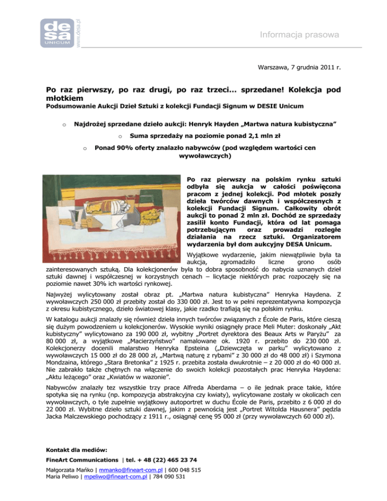 Informacja prasowa Warszawa, 7 grudnia 2011 r. Po raz pierwszy, po raz drugi, po raz trzeci… sprzedane! Kolekcja pod młotkiem Podsumowanie Aukcji Dzieł Sztuki z kolekcji Fundacji Signum w DESIE Unicum o Najdrożej sprzedane dzieło aukcji: Henryk Hayden „Martwa natura kubistyczna” o o Suma sprzedaży na poziomie ponad 2,1 mln zł Ponad 90% oferty znalazło nabywców (pod względem wartości cen wywoławczych) Po raz pierwszy na polskim rynku sztuki odbyła się aukcja w całości poświęcona pracom z jednej kolekcji. Pod młotek poszły dzieła twórców dawnych i współczesnych z kolekcji Fundacji Signum. Całkowity obrót aukcji to ponad 2 mln zł. Dochód ze sprzedaży zasilił konto Fundacji, która od lat pomaga potrzebującym oraz prowadzi rozległe działania na rzecz sztuki. Organizatorem wydarzenia był dom aukcyjny DESA Unicum. Wyjątkowe wydarzenie, jakim niewątpliwie była ta aukcja, zgromadziło liczne grono osób zainteresowanych sztuką. Dla kolekcjonerów była to dobra sposobność do nabycia uznanych dzieł sztuki dawnej i współczesnej w korzystnych cenach – licytacje niektórych prac rozpoczęły się na poziomie nawet 30% ich wartości rynkowej. Najwyżej wylicytowany został obraz pt. „Martwa natura kubistyczna” Henryka Haydena. Z wywoławczych 250 000 zł przebity został do 330 000 zł. Jest to w pełni reprezentatywna kompozycja z okresu kubistycznego, dzieło światowej klasy, jakie rzadko trafiają się na polskim rynku. W katalogu aukcji znalazły się również dzieła innych twórców związanych z École de Paris, które cieszą się dużym powodzeniem u kolekcjonerów. Wysokie wyniki osiągnęły prace Meli Muter: doskonały „Akt kubistyczny” wylicytowano za 190 000 zł, wybitny „Portret dyrektora des Beaux Arts w Paryżu” za 80 000 zł, a wyjątkowe „Macierzyństwo” namalowane ok. 1920 r. przebito do 230 000 zł. Kolekcjonerzy docenili malarstwo Henryka Epsteina („Dziewczęta w parku” wylicytowano z wywoławczych 15 000 zł do 28 000 zł, „Martwą naturę z rybami” z 30 000 zł do 48 000 zł) i Szymona Mondzaina, którego „Stara Bretonka” z 1925 r. przebita została dwukrotnie – z 20 000 zł do 40 000 zł. Nie zabrakło także chętnych na włączenie do swoich kolekcji pozostałych prac Henryka Haydena: „Aktu leżącego” oraz „Kwiatów w wazonie”. Nabywców znalazły tez wszystkie trzy prace Alfreda Aberdama – o ile jednak prace takie, które spotyka się na rynku (np. kompozycja abstrakcyjna czy kwiaty), wylicytowane zostały w okolicach cen wywoławczych, o tyle zupełnie wyjątkowy autoportret w duchu École de Paris, przebito z 6 000 zł do 22 000 zł. Wybitne dzieło sztuki dawnej, jakim z pewnością jest „Portret Witolda Hausnera” pędzla Jacka Malczewskiego pochodzący z 1911 r., osiągnął cenę 95 000 zł (przy wywoławczych 60 000 zł). Kontakt dla mediów: FineArt Communications | tel. + 48 (22) 465 23 74 Małgorzata Mańko | [email protected] | 600 048 515 Maria Peliwo | [email protected] | 784 090 531 Informacja prasowa Dużym powodzeniem cieszyły się dzieła klasyków polskiej awangardy, czego przykładem są prace Zbigniewa Dłubaka („Antropolity-11”, cena wylicytowana: 36 000 zł), Henryka Stażewskiego („Relief nr 12”, cena wylicytowana: 40 000 zł) oraz Jana Tarasina, którego „Próba animacji” osiągnęła cenę 105 000 zł pod młotkiem. Uznanie kupujących zdobyły także dzieła artystów, których życie związane jest z Poznaniem. Wśród nich znalazły się m.in. prace Andrzeja Matuszewskiego, jak dwie unikatowe rzeźby ceramiczne z lat 70. XX wieku, które z wywoławczych 900 zł przebite zostały do 2 200 i do 2 800 zł. Na aukcji znalazły się także prace profesorów krakowskiej ASP. Do nowych zbiorów trafiły obrazy Stanisława Rodzińskiego oraz Zbigniewa Sprychy. Jeśli chodzi o klasykę środowiska łódzkiego, wysoko wylicytowana została studencka praca Stanisława Fijałkowskiego z 1948 r., którą przebito z wywoławczych 30 000 do 46 000 zł. Za 2 200 zł zakupiona została praca Pawła Jarodzkiego, twórcy legendarnej wrocławskiej grupy „Luksus”, co należy uznać za cenę szalenie atrakcyjną. Wziąwszy pod uwagę, że praca była wystawiana w Narodowej Galerii Sztuki „Zachęta”, można stwierdzić, że kupujący dobrze zainwestował środki. Aby zapewnić licznym zgromadzonym komfortowe warunki, dom aukcyjny zastosował nowoczesną metodę transmisji, dzięki której można było dokonywać licytacji z różnych poziomów budynku DESY Unicum. Kolejne aukcje w DESIE Unicum: o 8 grudnia, g. 19: I Aukcja Biżuterii o 15 grudnia, g. 19: Aukcja Sztuki Współczesnej oraz Aukcja Dzieł Sztuki o 20 grudnia, g. 19: Aukcja Młodej Sztuki Ilustracje w tekście: Henryk Hayden „Martwa natura kubistyczna”, 1921 r. Juliusz Windorbski, prezes zarządu DESY Unicum prowadzi licytację dzieł sztuki z kolekcji Fundacji Signum Kontakt dla mediów: FineArt Communications | tel. + 48 (22) 465 23 74 Małgorzata Mańko | [email protected] | 600 048 515 Maria Peliwo | [email protected] | 784 090 531 Informacja prasowa Wyniki Aukcji Dzieł Sztuki z kolekcji Fundacji Signum, 1 grudnia 2011 r. Autor Natan Spiegiel Wojciech Weiss Tytuł Cena wywoławcza Cena wylicytowana Cena wylicytowana (z opłatą aukcyjną) Pozycja w katalogu Kazimierz w Krakowie 10 000 22 000 25 300 1 16 000 18 400 2 Pejzaż, ok. 1920 - 30 15 000 Jankiel Adler Martwa natura z homarami, ok. 1930 r. 50 000 68 000 78 200 3 Zygmunt Landau Śpiąca 7 000 26 000 29 900 4 8 000 8 000 9 200 5 100 000 230 000 264 500 6 3 000 3 400 3 910 7 60 000 95 000 109 250 9 Dawid Jecheskiel Kirszenbaum Mela Muter Martwa natura z owocami Macierzyństwo, ok. 1920 r. Aleksander Gryglewski "Kościół oo Bernardynów w Przeworsku" Jacek Malczewski Portret Witolda Hausnera, 1911 r. Kazimierz Stabrowski Drzewa 5 000 5 500 6 325 10 6 500 7 475 11 Kazimierz Stabrowski Capri - Lazurowa Grota 6 000 Autor nierozpo