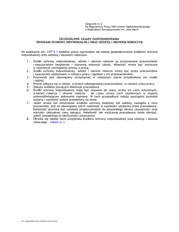 Załącznik nr 2 do Regulaminu Pracy XXII Liceum Ogólnokształcącego z Oddziałami Dwujęzycznymi im. José Martí SZCZEGÓŁOWE ZASADY GOSPODAROWANIA ŚRODKAMI OCHRONY INDYWIDUALNEJ ORAZ ODZIEŻĄ I OBUWIEM ROBOCZYM Na podstawie art. 2378 § 1 kodeksu pracy wprowadza się zasady gospodarowania środkami ochrony indywidualnej oraz odzieżą i obuwiem roboczym. 1. 2. 3. 4. 5. 6. 7. 8. Środki ochrony indywidualnej, odzież i obuwie robocze są przyznawane pracownikom i nauczycielom bezpłatnie i stanowią własność szkoły. Własność winna być zwrócona w momencie rozwiązania umowy o pracę. Środki ochrony indywidualnej, odzież i obuwie robocze winny być przez pracowników i nauczycieli użytkowane w miejscu pracy i zgodnie z ich przeznaczeniem. Pracownik jest obowiązany utrzymywać w należytym stanie przydzielone mu środki i odzież. Pranie odbywa się w szkole, w pralce udostępnionej pracownikom, w ramach czasu pracy. Zakupu środków piorących dokonuje pracodawca. Środki ochrony indywidualnej mają być używane do czasu utraty ich cech ochronnych, a odzież robocza i obuwie robocze – do czasu utraty cech użytkowych w stopniu uniemożliwiającym dokonanie naprawy. W tych przypadkach należy sporządzić protokół zużycia i wymienić zużyte przedmioty na nowe. Jeżeli utrata lub zniszczenie środków ochrony osobistej lub odzieży nastąpiło z winy pracownika, jest on obowiązany uiścić należność w wysokości ustalonej przez pracodawcę. Należność powinna być ustalona proporcjonalnie do pozostałego okresu używalności oraz wartości (aktualnej ceny zakupu). Należność tak wyliczoną pracodawca może obniżyć, jeżeli uzasadniają to okoliczności zniszczenia. Określa się tabelę norm przydziału środków ochrony indywidualnej oraz odzieży i obuwia roboczego – tabela nr 1. zał. 2 gospodarowanie środkami ochrony.doc TABELA NR 1 PRZYDZIAŁ ŚRODKÓW OCHRONY INDYWIDUALNEJ ORAZ ODZIEŻY I OBUWIA ROBOCZEGO Stanowisko pracy Rodzaj środka ochrony indywidualnej (O) oraz odzieży i obuwia roboczego (R) Okres używalności w miesiącach, okresach zimowych (o.z) i do zużycia(d.z.) Bibliotekarz R - fartuch kretonowy lub tkaniny syntetycznej Nauczyciel fizyki R - fartuch roboczy 12 R - fartuch roboczy, 12 O - fartuch gumowy, dyżurny Nauczyciel chemii Nauczyciel biologii Nauczyciel wychowania fizycznego Dozorca O - rękawice ochronne gumowe, dyżurne R - fartuch roboczy, 12 O - rękawice ochronne gumowe, d.z. R - dres 36 R - obuwie sportowe 24 O - kurtka ocieplana 4 o.z. R - ubranie drelichowe lub fartuch drelichowy 18 R - trzewiki skórzane 24 R - gumofilce O - kurtka ocieplana zał. 2 gospodarowanie środkami ochrony.doc d.z. O - okulary ochronne O - rękawice ochronne drelichowe, Woźna d.z. min. 18 3 o.z. d.z 4 o.z. R - bluzki bawełniane - 2 szt. 12 R - spodnie bawełniane - 1 szt. 12 R- trzewiki profilaktyczne - tekstylne 12