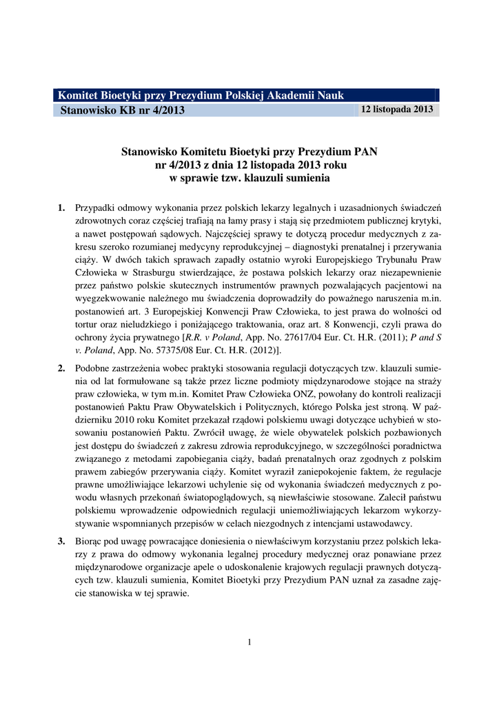 Komitet Bioetyki przy Prezydium Polskiej Akademii Nauk Stanowisko KB nr 4/2013 12 listopada 2013 Stanowisko Komitetu Bioetyki przy Prezydium PAN nr 4/2013 z dnia 12 listopada 2013 roku w sprawie tzw. klauzuli sumienia 1. Przypadki odmowy wykonania przez polskich lekarzy legalnych i uzasadnionych świadczeń zdrowotnych coraz częściej trafiają na łamy prasy i stają się przedmiotem publicznej krytyki, a nawet postępowań sądowych. Najczęściej sprawy te dotyczą procedur medycznych z zakresu szeroko rozumianej medycyny reprodukcyjnej – diagnostyki prenatalnej i przerywania ciąży. W dwóch takich sprawach zapadły ostatnio wyroki Europejskiego Trybunału Praw Człowieka w Strasburgu stwierdzające, że postawa polskich lekarzy oraz niezapewnienie przez państwo polskie skutecznych instrumentów prawnych pozwalających pacjentowi na wyegzekwowanie należnego mu świadczenia doprowadziły do poważnego naruszenia m.in. postanowień art. 3 Europejskiej Konwencji Praw Człowieka, to jest prawa do wolności od tortur oraz nieludzkiego i poniżającego traktowania, oraz art. 8 Konwencji, czyli prawa do ochrony życia prywatnego [R.R. v Poland, App. No. 27617/04 Eur. Ct. H.R. (2011); P and S v. Poland, App. No. 57375/08 Eur. Ct. H.R. (2012)]. 2. Podobne zastrzeżenia wobec praktyki stosowania regulacji dotyczących tzw. klauzuli sumienia od lat formułowane są także przez liczne podmioty międzynarodowe stojące na straży praw człowieka, w tym m.in. Komitet Praw Człowieka ONZ, powołany do kontroli realizacji postanowień Paktu Praw Obywatelskich i Politycznych, którego Polska jest stroną. W październiku 2010 roku Komitet przekazał rządowi polskiemu uwagi dotyczące uchybień w stosowaniu postanowień Paktu. Zwrócił uwagę, że wiele obywatelek polskich pozbawionych jest dostępu do świadczeń z zakresu zdrowia reprodukcyjnego, w szczególności poradnictwa związanego z metodami zapobiegania ciąży, badań prenatalnych oraz zgodnych z polskim prawem zabiegów przerywania ciąży. Komitet wyraził zaniepokojenie faktem, że regulacje prawne umożliwiające lekarzowi uchylenie się od wykonania świadczeń medycznych z powodu własnych przekonań światopoglądowych, są niewłaściwie stosowane. Zalecił państwu polskiemu wprowadzenie odpowiednich regulacji uniemożliwiających lekarzom wykorzystywanie wspomnianych przepisów w celach niezgodnych z intencjami ustawodawcy. 3. Biorąc pod uwagę powracające doniesienia o niewłaściwym korzystaniu przez polskich lekarzy z prawa do odmowy wykonania legalnej procedury medycznej oraz ponawiane przez międzynarodowe organizacje apele o udoskonalenie krajowych regulacji prawnych dotyczących tzw. klauzuli sumienia, Komitet Bioetyki przy Prezydium PAN uznał za zasadne zajęcie stanowiska w tej sprawie. 1 I. Klauzula sumienia w społeczeństwie demokratycznym 4. Ludzie różnią się swoich w ocenach moralnych dotyczących określonych zachowań. To, co dla jednych jest moralnie dopuszczalne, a nawet konieczne w danych okolicznościach, inni uważają za moralnie niegodziwe. 5. Współczesne społeczeństwa demokratyczne uznają, że nie istnieje jeden powszechnie ważny głos sumienia; że nie ma jednego, „właściwego” systemu przekonań moralnych czy religijnych. Każdy ma prawo żyć według własnej wizji tego, co jest dobre i słuszne, o ile nie narusza to bezpieczeństwa publicznego, porządku, zdrowia lub moralności publicznej albo podstawowych praw i wolności innych osób. Ład demokratyczny opiera się zatem na zasadzie szacunku dla pluralizmu wartości i światopoglądów, i gwarantuje każdemu prawo do wolności sumienia i wyznania. Prawo to zapisane jest we wszystkich międzynarodowych i europejskich dokumentach ochrony prawa człowieka. Na jego straży stoi także art. 53 Konstytucji Rzeczpospolitej Polskiej z dnia 7 kwietnia 1997 r. (Dz. U. Nr 78, poz. 483 z późn. zm.) 6. Z prawem do wolności sumienia i wyznania skorelowany jest obowiązek państwa do zapewnienia każdemu obywatelowi swobody wyboru religii lub przekonań oraz wyrażania ich indywidualnie i zbiorowo, prywatnie i publicznie. Państwo nie może wprowadzać rozwiązań prawnych faworyzujących tylko jeden wybrany system wartości, a tym samym zmuszać części obywateli do działań niezgodnych z ich sumieniem. Obowiązkiem państwa jest ponadto zapewnienie każdemu człowiekowi ochrony przed zakusami ze strony innych jednostek i grup, pragnących narzucić mu swoje przekonania światopoglądowe. 7. Dynamiczny rozwój wiedzy i techniki medycznej, jaki nastąpił w czasie ostatniego półwiecza, doprowadził do pojawienia się szeregu procedur medycznych, które – choć legalne – wywołują moralny sprzeciw części obywateli, w tym także przedstawicieli zawodów medycznych. Przykładem takiej procedury jest zabieg przerwania ciąży. Prawo polskie dopuszcza możliwość przerwania ciąży w trzech przypadkach określonych w art. 4a ustawy z dnia 3 stycznia 1993 r. o planowaniu rodziny, ochronie płodu ludzkiego i warunkach dopuszczalności przerywania ciąży (Dz. U. z 1993 r. Nr 17, poz. 78 z późn. zm). Jeśli okoliczności te zachodzą, kobieta ma prawo do legalnej aborcji wykonywanej bezpłatnie, w ramach systemu powszechnych ubezpieczeń zdrowotnych. Wielu lekarzy nie chce jednak wykonywać tych zabiegów ze względów światopoglądowych. W tej sytuacji pojawia się potrzeba zapewnienia równowagi między szacunkiem dla przekonań moralnych żywionych przez przedstawicieli zawodów medycznych a koniecznością zagwarantowania pacjentom dostępu do zgodnych z prawem i należnych im świadczeń zdrowotnych. Państwa demokratyczne realizują ten cel poprzez wprowadzenie do krajowych porządków prawnych tzw. klauzuli sumienia. 8. Regulacja klauzuli sumienia chroni integralność moralną profesjonalisty medycznego w sposób, który da się pogodzić z szczególnym statusem i powołaniem wykonywanego przez niego zawodu. Zawody medyc