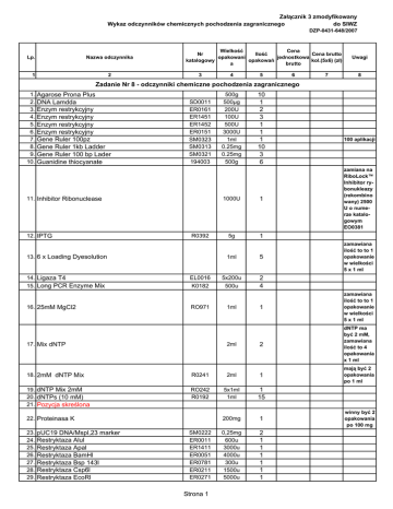 Załącznik 3 zmodyfikowany Wykaz odczynników chemicznych pochodzenia zagranicznego do SIWZ DZP-0431-648/2007 Lp. Nazwa odczynnika 1 2 Wielkość Cena Nr Ilość Cena brutto jednostkowa opakowani katalogowy opakowań kol.(5x6) (zł) brutto a 3 4 5 6 7 Uwagi 8 Zadanie Nr 8 - odczynniki chemiczne pochodzenia zagranicznego 1. 2. 3. 4. 5. 6. 7. 8. 9. 10. Agarose Prona Plus DNA Lamdda Enzym restrykcyjny Enzym restrykcyjny Enzym restrykcyjny Enzym restrykcyjny Gene Ruler 100pz Gene Ruler 1kb Ladder Gene Ruler 100 bp Lader Guanidine thiocyanate SD0011 ER0161 ER1451 ER1452 ER0151 SM0323 SM0313 SM0321 194003 11. Inhibitor Ribonuclease 12. IPTG R0392 13. 6 x Loading Dyesolution 14. Ligaza T4 15. Long PCR Enzyme Mix 16. 25mM MgCl2 EL0016 K0182 RO971 17. Mix dNTP 500g 500µg 200U 100U 500U 3000U 1ml 0.25mg 0.25mg 500g 10 1 2 3 1 1 1 10 3 6 1000U 1 5g 1 1ml 5 5x200u 500u 2 4 2ml 2 dNTP ma być 2 mM, zamawiana ilość to 4 opakowania x 1 ml mają być 2 opakowania po 1 ml 2ml 1 19. dNTP Mix 2mM 20. dNTPs (10 mM) 21. Pozycja skreślona RO242 R0192 5x1ml 1ml 1 15 200mg 1 0,25mg 600u 3000u 4000u 300u 1500u 5000u 2 1 1 1 1 1 1 pUC19 DNA/Mspl,23 marker Restryktaza Alul Restryktaza Apal Restryktaza BamHl Restryktaza Bsp 143l Restryktaza Csp6l Restryktaza EcoRl SM0222 ER0011 ER1411 ER0051 ER0781 ER0211 ER0271 Strona 1 zamawiana ilość to to 1 opakowanie w wielkości 5 x 1 ml 1 1ml R0241 23. 24. 25. 26. 27. 28. 29. zamiana na RiboLock™ Inhibitor rybonukleazy (rekombino wany) 2500 U o numerze katalogowym EO0381 zamawiana ilość to to 1 opakowanie w wielkości 5 x 1 ml 18. 2mM dNTP Mix 22. Proteinasa K 100 aplikacji winny być 2 opakowania po 100 mg Załącznik 3 zmodyfikowany Wykaz odczynników chemicznych pochodzenia zagranicznego do SIWZ DZP-0431-648/2007 Lp. Nazwa odczynnika 1 30. 31. 32. 33. 34. 35. 36. 37. 38. 39. 40. 41. 42. 43. 44. 45. 2 Restryktaza FspBl Restryktaza Hin1ll Restryktaza Hindlll Restryktaza Hpall Restryktaza Mbol Restryktaza Mspl Restryktaza Ndel Restryktaza Pstl Restryktaza Rsal Restryktaza Sacl Restryktaza Tail Restryktaza Taql Restryktaza Tasl Restryktaza Tru1l Restryktaza Vspl Reverse transcriptase Wielkość Cena Nr Ilość Cena brutto jednostkowa opakowani katalogowy opakowań kol.(5x6) (zł) brutto a 3 4 5 ER1761 ER1831 ER0501 ER0511 ER0811 ER0541 ER0581 ER0611 ER1121 ER1311 ER1141 ER0671 ER1351 ER0982 ER0911 500u 300u 5000u 1000u 300u 3000u 500u 3000u 1000u 1200u 400u 3000u 1000u 1500u 1000u 10000u 10 nukleotyd owe 500u 1 1 1 1 1 1 1 1 1 1 1 1 1 5 1 5 46. Startery -PCR 47. Taq DNA Polimerase 48. Taq polymerase (recombinat) 49. 50. 51. 52. 53. 54. 55. Tiocyjanian rtęci X-gal Agarose Plus Enzym restrykcyjny firmy Biolabs Kit do odwrotnej transkrypcji Revert AidTM Enzym restrykcyjny firmy Biolabs Razem zadanie Nr 8 EP0402 EP0402 R0404 RO623S K1632 RO623L x 7 8 winny być 2 opakowania 2od 1 500u 100 g 1g 500g 25U 25 1 1 4 2 1 x 125U x 6 Uwagi korekta numeru katalogowego x x Zadanie Nr 9 - odczynniki chemiczne pochodzenia zagranicznego 1. Kit do izolacji DNA z krwi (Epicentre) 2. Razem zadanie Nr 9 MG71100 szt 8 x x x x x Zadanie Nr 10 - odczynniki chemiczne pochodzenia zagranicznego 1. Owcza rekombinowana leptyna 5mg 1 2. Przeciwciała prolaktyna op 1 3. Przeciwciała melatonina op 1 4. Przeciwciała hormon wzrostu op 1 5. Chloroform l 1 6. Izopropanol l 1 7. TRI-Reagent 100ml 1 8. Polimeraza Taq 500u 6 op 1 x x 9. Rozrzedzalnik do mnoŜenia nasienia 10. Razem zadanie Nr 10 x x Zadanie Nr 11 - odczynniki chemiczne pochodzenia zagranicznego Strona 2 x Załącznik 3 zmodyfikowany Wykaz odczynników chemicznych pochodzenia zagranicznego do SIWZ DZP-0431-648/2007 Lp. Nazwa odczynnika 1 2 Wielkość Cena Nr Ilość Cena brutto jednostkowa opakowani katalogowy opakowań kol.(5x6) (zł) brutto a 3 4 5 1. Araldite 2020 A/B 500ml 6 2. Standard Fe 100ml 1 3. Formazan 1 4. TTC 1 5. Tecator katalizator tabletki 1000szt 1 6. Klej polimerowy DRAGON l 20 x x 7. Razem zadanie Nr 11 x 6 x 7 Uwagi 8 x Zadanie Nr 12 - odczynniki chemiczne pochodzenia zagranicznego 608120 100 reactions 5 2. CEQ Separation Gel LPA-1 608010 11,5 ml (12 loads) 10 strzykawe k 5 3. CEQ Separation Buffer 608012 4bottles 5 4. CEQ DNA Size Standard Kit-600 608095 1. CEQ DTCS Quick Start Kit 5. Razem zadanie Nr 12 x 4 x x x x Zadanie Nr 13 - odczynniki chemiczne pochodzenia zagranicznego 1. Surowica płodowa cielęca 2. Razem zadanie Nr 13 x 500ml 1 x x x x Zadanie Nr 14 - odczynniki chemiczne pochodzenia zagranicznego 1. BSA 100152 100g 1 2. LPO-CC Kit Lipid Peroxides 165 ml CC-004 zestaw 2 3. Maleic acid 102233 1000g 1 4. Zestaw do ozn. Camp op 2 5. Zestawy do ozn. Camp (BT-300) op 2 x x 6. Razem zadanie Nr 14 x x Zadanie Nr 15 - odczynniki chemiczne pochodzenia zagranicznego 1. 1-Methyl-2-pyrrolidinone 2.5l 4 2. Aluminum oxide 1kg 1 3. Congo Red g 25 4. Cyanuric chloride g 100 5. m-cresol 1l 3 6. Silica gel g 250 Strona 3 x Załącznik 3 zmodyfikowany Wykaz odczynników chemicznych pochodzenia zagranicznego do SIWZ DZP-0431-648/2007 Lp. Nazwa odczynnika 1 2 Wielkość Cena Nr Ilość Cena brutto jednostkowa opakowani katalogowy opakowań kol.(5x6) (zł) brutto a 3 4 5 kg 1 8. Tetraethyl orthosilicate 250ml 1 9. Aniline hydrochloride 500g 1 x x 7. Silica gel do chromatografii kolumnowej 10. Razem zadanie Nr 15 x 6 x 7 Uwagi 8 x Zadanie Nr 16 - odczynniki chemiczne pochodzenia zagranicznego 1. Laemmeli Sample buffer 161-0731 30ml 1 2. Protein assay 500-0006 450ml 1 3. Tween 20 170-6531 100ml 1 162-0175 szt x x 4. Membrana PDVF:Immun-Blot PVDF Membrane (for protein) 5. Razem zadanie Nr 16 x x x Zadanie Nr 17 - odczynniki chemiczne pochodzenia zagranicznego 1. Sea Plaque Agarose 2. Razem zadanie Nr 17 50101 25g 2 x x x x x Zadanie Nr 18 - odczynniki chemiczne pochodzenia zagranicznego 1. Cormay Chol Standard 400 5-119 1fiol 1 2. Cormay TG-30 wzorce 2-262 op 1 3. Cormay HDL wzorce 2-053 op 2 4. Cormay Chol -60 LTS 2-126 op 2 5. Total cholesterol-kit op 2 6. Trójglicerydy-kit op 2 x x 7. Razem zadanie Nr 18 x x x Zadanie Nr 1
