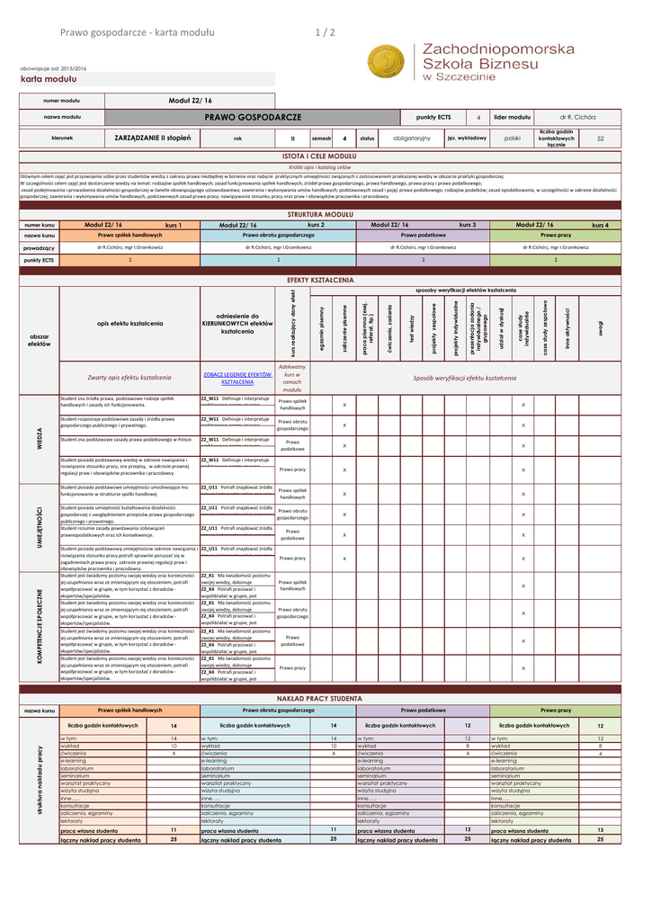Prawo gospodarcze - karta modułu 1/2 obowiązuje od: 2015/2016 karta modułu Moduł Z2/ 16 numer modułu PRAWO GOSPODARCZE nazwa modułu ZARZĄDZANIE II stopień kierunek punkty ECTS II rok semestr 4 obligatoryjny status 4 lider modułu polski jęz. wykładowy dr R. Cichórz liczba godzin kontaktowych łącznie 52 ISTOTA I CELE MODUŁU Krótki opis i katalog celów Głównym celem zajęć jest przyswojenie sobie przez studentów wiedzy z zakresu prawa niezbędnej w biznesie oraz nabycie praktycznych umiejętności związanych z zastosowaniem przekazanej wiedzy w obszarze praktyki gospodarczej. W szczególności celem zajęć jest dostarczenie wiedzy na temat: rodzajów spółek handlowych; zasad funkcjonowania spółek handlowych; żródeł prawa gospodarczego, prawa handlowego, prawa pracy i prawa podatkowego; zasad podejmowania i prowadzenia działalności gospodarczej w świetle obowiązującego ustawodawstwa; zawierania i wykonywania umów handlowych; podstawowych zasad i pojęć prawa podatkowego; rodzajów podatków; zasad opodatkowania, w szczególności w zakresie działalności gospodarczej; zawierania i wykonywania umów handlowych, podstawowych zasad prawa pracy; nawiązywania stosunku pracy oraz praw i obowiązków pracownika i pracodawcy. STRUKTURA MODUŁU Moduł Z2/ 16 numer kursu kurs 1 kurs 2 Moduł Z2/ 16 Moduł Z2/ 16 kurs 3 Moduł Z2/ 16 kurs 4 nazwa kursu Prawo spółek handlowych Prawo obrotu gospodarczego Prawo podatkowe Prawo pracy prowadzący dr R.Cichórz, mgr I.Grzenkowicz dr R.Cichórz, mgr I.Grzenkowicz dr R.Cichórz, mgr I.Grzenkowicz dr R.Cichórz, mgr I.Grzenkowicz punkty ECTS 1 1 1 1 WIEDZA UMIEJĘTNOŚCI KOMPETENCJE SPOŁECZNE Student zna źródła prawa, podstawowe rodzaje spółek handlowych i zasady ich funkcjonowania. Z2_W11 Definiuje i interpretuje podstawowe normy prawne, Student rozpoznaje podstawowe zasady i źródła prawa gospodarczego publicznego i prywatnego. Z2_W11 Definiuje i interpretuje podstawowe normy prawne, Student zna podstawowe zasady prawa podatkowego w Polsce. Z2_W11 Definiuje i interpretuje podstawowe normy prawne, Student posiada podstawową wiedzę w zakresie nawiązania i rozwiązania stosunku pracy, zna przepisy, w zakresie prawnej regulacji praw i obowiązków pracownika i pracodawcy. Z2_W11 Definiuje i interpretuje podstawowe normy prawne, Student posiada podstawowe umiejętności umożliwiające mu funkcjonowanie w strukturze spółki handlowej Z2_U11 Potrafi znajdować źródła prawa i interpretować je, rozumie Student posiada umiejetność kształtowania działalności gospodarczej z uwzględnieniem przepisów prawa gospodarczego publicznego i prywatnego. Student rozumie zasady powstawania zobowiązań prawnopodatkowych oraz ich konsekwencje. Z2_U11 Potrafi znajdować źródła prawa i interpretować je, rozumie Student posiada podstawową umiejętnościw zakresie nawiązania i rozwiązania stosunku pracy,potrafi sprawnie poruszać się w zagadnieniach prawa pracy. zakresie prawnej regulacji praw i obowiązków pracownika i pracodawcy. Student jest świadomy poziomu swojej wiedzy oraz konieczności jej uzupełniania wraz ze zmieniającym się otoczeniem; potrafi współpracować w grupie, w tym korzystać z doradców ekspertów/specjalistów. Student jest świadomy poziomu swojej wiedzy oraz konieczności jej uzupełniania wraz ze zmieniającym się otoczeniem; potrafi współpracować w grupie, w tym korzystać z doradców ekspertów/specjalistów. Z2_U11 Potrafi znajdować źródła prawa i interpretować je, rozumie Student jest świadomy poziomu swojej wiedzy oraz konieczności jej uzupełniania wraz ze zmieniającym się otoczeniem; potrafi współpracować w grupie, w tym korzystać z doradców ekspertów/specjalistów. Student jest świadomy poziomu swojej wiedzy oraz konieczności jej uzupełniania wraz ze zmieniającym się otoczeniem; potrafi współpracować w grupie, w tym korzystać z doradców ekspertów/specjalistów. Z2_U11 Potrafi znajdować źródła prawa i interpretować je, rozumie uwagi inne aktywności case study zespołowo Sposób weryfikacji efektu kształcenia Prawo spółek handlowych x x Prawo obrotu gospodarczego x x Prawo podatkowe x x Prawo pracy x x Prawo spółek handlowych x x Prawo obrotu gospodarczego x x Prawo podatkowe x x Prawo pracy x x Z2_K1 Ma świadomość poziomu Prawo spółek swojej wiedzy, dokonuje handlowych samooceny własnych kompetencji, Z2_K4 Potrafi pracować i współdziałać w grupie, jest otwartyMa na współpracę Z2_K1 świadomośći poziomu swojej wiedzy, dokonuje Prawo obrotu Z2_K4 Potrafi pracować i gospodarczego współdziałać w grupie, jest otwartyMa na współpracę Z2_K1 świadomośći poziomu swojej wiedzy, dokonuje samooceny własnych kompetencji, Z2_K4 Potrafi pracować i współdziałać w grupie, jest otwartyMa na współpracę Z2_K1 świadomośći poziomu swojej wiedzy, dokonuje samooceny własnych kompetencji, Z2_K4 Potrafi pracować i współdziałać w grupie, jest case study indywidualnie udział w dyskusji prezentacja zadania indywidualnego / grupowego projekty indywidualne projekty zespołowe test wiedzy Adekwatny kurs w ramach modułu ćwiczenia, zadania ZOBACZ LEGENDĘ EFEKTÓW KSZTAŁCENIA praca pisemna (esej, referat, itp.) Zwarty opis efektu kształcenia obszar efektów zaliczenie pisemne odniesienie do KIERUNKOWYCH efektów kształcenia sposoby weryfikacji efektów kształcenia egzamin pisemny opis efektu kształcenia kurs realizujący dany efekt EFEKTY KSZTAŁCENIA x x Prawo podatkowe x Prawo pracy x NAKŁAD PRACY STUDENTA nazwa kursu Prawo spółek handlowych struktura nakładu pracy liczba godzin kontaktowych w tym: wykład ćwiczenia e-learning laboratorium seminarium warsztat praktyczny wizyta studyjna inne….. konsultacje zaliczenia, egzaminy Prawo obrotu gospodarczego 14 14 10 4 lektoraty liczba godzin kontaktowych w tym: wykład ćwiczenia e-learning laboratorium seminarium warsztat praktyczny wizyta studyjna inne….. konsu