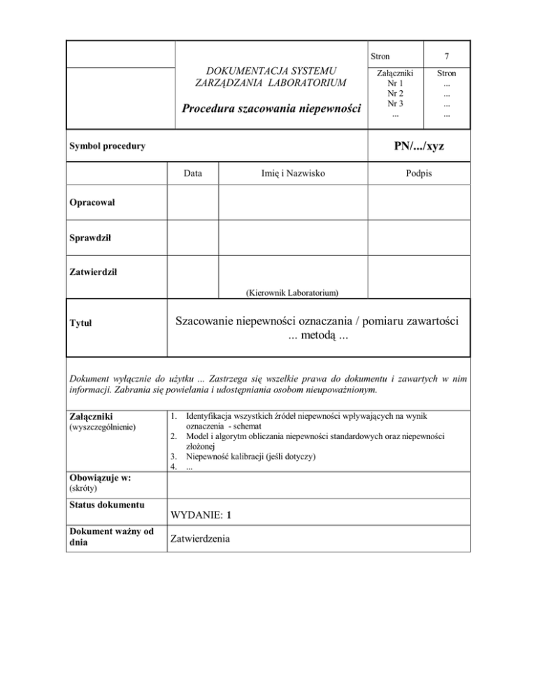 Stron DOKUMENTACJA SYSTEMU ZARZĄDZANIA LABORATORIUM Procedura szacowania niepewności 7 Załączniki Nr 1 Nr 2 Nr 3 ... Stron ... ... ... ... Symbol procedury PN/.../xyz Data Imię i Nazwisko Podpis Opracował Sprawdził Zatwierdził (Kierownik Laboratorium) Tytuł Szacowanie niepewności oznaczania / pomiaru zawartości ... metodą ... Dokument wyłącznie do użytku ... Zastrzega się wszelkie prawa do dokumentu i zawartych w nim informacji. Zabrania się powielania i udostępniania osobom nieupoważnionym. 1. Załączniki (wyszczególnienie) 2. 3. 4. Identyfikacja wszystkich źródeł niepewności wpływających na wynik oznaczenia - schemat Model i algorytm obliczania niepewności standardowych oraz niepewności złożonej Niepewność kalibracji (jeśli dotyczy) ... Obowiązuje w: (skróty) Status dokumentu WYDANIE: 1 Dokument ważny od dnia Zatwierdzenia Strona: 2 PN/.../xyz Procedura szacowania niepewności przy oznaczaniu / pomiarze ............... metodą .................................. Procedurę szacowania niepewności opracowano na podstawie wymagań:  PO/...,  PB/...,  ............, oraz przy uwzględnieniu zaleceń przewodnika Wyrażanie niepewności pomiaru. Przewodnik., tłumaczenie, wydanie GUM Warszawa 1999 oraz zaleceń zawartych w Biuletynie Informacyjnym POLLAB nr 1/39/2003. Oszacowanie niepewności podzielono na 7 kroków tj.: Krok 1 Określenie wielkości mierzonej, wyrażenie równaniem matematycznym związku wielkości mierzonej (wyjściowej) z wielkościami wejściowymi. Zidentyfikowanie wszystkich źródeł niepewności. Krok 2 Obliczenie niepewności standardowych pojedynczych składników. Krok 3 Zidentyfikowanie kowariancji (skorelowanie wielkości wejściowych). Krok 4 Obliczenie wyniku pomiaru na podstawie danych wejściowych. Krok 5 Obliczenie niepewności złożonej. Krok 6 Obliczenie niepewności rozszerzonej. Krok 7 Podanie wyniku wraz z oszacowaną niepewnością. Krok 1 Identyfikacja źródeł niepewności Wielkością wyjściową jest ........... (c) obliczana wg wzoru: C = .... (1) gdzie wielkościami wejściowymi (źródłami niepewności) są: c – ...................... ........................... Strona: 3 PN/.../xyz Na całkowity model procesu badań / pomiarów składają się następujące etapy: Etap A Pobór próbki Etap B Przechowywanie próbki do badań Etap C Przygotowanie próbki do badań Etap E Przygotowanie krzywej kalibracyjnej Etap D Oznaczenie (badanie) Etap F Kalibracja Etap G Pomiar wielkości wejściowych WYNIK Zidentyfikowanie wszystkich źródeł niepewności. Etap A Pobór próbki nie jest uwzględniany w procedurze – zleceniodawca). (jeśli materiał do badań dostarcza Etap B Nie dotyczy – jeśli przechowywanie próbki do badań nie wpływa na wynik oznaczenia / pomiaru. Etap C Np. odważyć odpowiednie proporcje komponentów, zmierzyć wymiary geometryczne, itp.  niepewność przyrządu pomiarowego (np. ze świadectwa wzorcowania) Etap D Oznaczenie / pomiar polega na : 1. Zarejestrowaniu ............................. 2. Zmierzeniu ........................................... 3. Obliczeniu .................................. Strona: 4 PN/.../xyz ........................................................... Źródła niepewności:  precyzja oznaczenia,  powtarzalność oznaczenia,  czynnik ludzki (analityk). Etap E Przygotowanie krzywej kalibracyjnej polega na .................................... Źródła niepewności:  czystość wzorca,  .................... Sporządzanie próbek wzorcowych Opis sporządzania próbek wzorcowych: ............................................................................. Technika sporządzenia wzorców. np.:  przy pomocy wagi analitycznej odważyć odpowiednią ilość substancji.  Dokładnie wymieszać ..........................  Przesypać mieszaninę do ......................  Sprasować próbkę .......................... Etap F Kalibracja ...................... polega na ................................... a następnie wyznaczeniu krzywej kalibracyjnej opisanej zależnością: h = f(x) gdzie: h – ............................., x – ..............................., Źródła niepewności:  niepewność wzorcowania,  współczynnik zmienności metody (precyzja), Etap G Pomiar lub rejestracja wielkości wejściowych , np.: temperatura, ciśnienie, masa, siła. Krok 2 Obliczenie niepewności standardowych pojedynczych składników. W tym kroku określa się niepewności standardowe pojedynczych składników analizując wpływ poszczególnych etapów badań na każdą z pojedynczych niepewności. Dane do otrzymania wartości niepewności dla każdego źródła niepewności uzyskiwane są na podstawie szacowania niepewności:  typu A (statystyczna analiza wyników na bazie powtarzalnych pomiarów)  typu B (doświadczenie, dane producenta, certyfikaty, świadectwa wzorcowania) Niepewność standardowa u(xj) dla oszacowań typu B obliczana jest następująco:  Rozkład normalny (podane przedziały ufności) u(xj) = niepewność rozszerz. / k (k=2÷3), Strona: 5 PN/.../xyz  Rozkład prostokątny u(xj) = a (a - dolne i górne granice odczytu), 3 a  Rozkład trójkątny u(xj) = (gdy wartość środkowa jest bardziej prawdopodobna niż 6 graniczne ), Etap A Nie uwzględnia się - jeśli materiał do badań dostarcza zleceniodawca. Etap B - Przechowywanie próbki do badań Nie uwzględnia się - jeśli przechowywanie próbki do badań nie wpływa na wynik oznaczenia / pomiaru. Etap C - Przygotowanie próbki Jeśli uwzględniamy niepewność rozszerzoną ze świadectwa wzorcowania (U) u(xC) = U/2 = ..... Etap D – Oznaczenie / badanie 1. Niepewność powtarzalności wyniku (niepewność pomiaru) określona na etapie walidacji metody z serii pomiarów, u(x D_1) s = ............ sx = ............. u(x D_1) = sx / xśr xśr = ............ (sx – odchylenie standardowe średniej) 2. Czynnik ludzki – jeżeli pomijalny, u(x D_2)=0 3. Precyzja metody, u(x D_3) u(x D_3) = s /xśr (s – odc