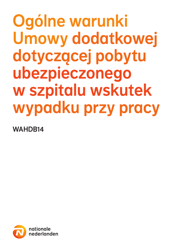 Ogólne warunki Umowy dodatkowej dotyczącej pobytu ubezpieczonego w szpitalu wskutek wypadku przy pracy WAHDB14 Spis treści Ogólne warunki Umowy dodatkowej dotyczącej pobytu ubezpieczonego w szpitalu wskutek wypadku przy pracy WAHDB14................................................................................................ 4 Art. 1 Definicje................................................................................... 4 Art. 2 Jaki jest zakres ochrony ubezpieczenia?.................... 5 Art. 3 Jakie jest dzienne świadczenie szpitalne?................. 5 Art. 4 Kto jest uprawiony do otrzymania świadczenia i w jakiej wysokości?........................................................... 5 Art. 5 Jakie są warunki wypłaty świadczenia?..................... 5 Art. 6 Wyłączenia odpowiedzialności Nationale‑Nederlanden..................................................... 5 Art. 7 Kiedy wygasa ochrona ubezpieczeniowa?............... 6 Art. 8 Pozostałe postanowienia.................................................. 6 Art. 9 Wejście w życie Warunków............................................. 6 2| Informacje dotyczące: Ogólnych warunków Umowy dodatkowej dotyczącej pobytu ubezpieczonego w szpitalu wskutek wypadku przy pracy WAHDB14 (OWU) Informacje zawarte w OWU Nr Artykułu 1. Przesłanki wypłaty odszkodowania i innych świadczeń lub wartości wykupu Ubezpieczenia. Art. 1, Art. 2, Art. 4, Art. 5 2. Ograniczenia oraz wyłączenia odpowiedzialności zakładu ubezpieczeń uprawniające do odmowy wypłaty odszkodowania i innych świadczeń lub ich obniżenia. Art. 6, Art. 7 3. Koszty oraz inne obciążenia potrącane ze składek ubezpieczeniowych, z aktywów ubezpieczeniowych funduszy kapitałowych lub poprzez umorzenie jednostek uczestnictwa ubezpieczeniowych funduszy kapitałowych. Nie dotyczy 4. Wartość wykupu ubezpieczenia w poszczególnych okresach trwania ochrony ubezpieczeniowej oraz okres, w którym roszczenie o wypłatę wartości wykupu nie przysługuje. Nie dotyczy Ogólne warunki Umowy dodatkowej | 3 Ogólne warunki Umowy dodatkowej dotyczącej pobytu ubezpieczonego w szpitalu wskutek wypadku przy pracy WAHDB14 Ogólne warunki Umowy dodatkowej dotyczącej pobytu Ubezpieczonego w szpitalu wskutek wypadku przy pracy mają zastosowanie do Umowy dodatkowej oznaczonej w polisie i innych dokumentach wystawionych przez Nationale‑Nederlanden kodem WAHDB14. Art. 1 Definicje Wszelkie określenia niezdefiniowane w niniejszych Warunkach, ale zdefiniowane w Ogólnych warunkach grupowego ubezpieczenia na życie TRM14, są stosowane w takim samym znaczeniu w niniejszych Warunkach. W Ogólnych warunkach Umowy dodatkowej dotyczącej pobytu Ubezpieczonego w szpitalu wskutek wypadku przy pracy (dalej: Warunki) oraz wszelkich innych dokumentach dotyczących Umowy dodatkowej oznaczonych kodem WAHDB14 podanym niżej terminom nadano następujące znaczenia: 1) „Szpital” – publiczny lub niepubliczny zamknięty zakład opieki zdrowotnej, którego zadaniem jest całodobowa opieka nad chorymi i ich leczenie, dysponujący odpowiednim zapleczem diagnostycznym i leczniczym, zatrudniający personel medyczny, tj. wykwalifikowaną obsługę pielęgniarską i przynajmniej jednego Lekarza w trybie ciągłym, oraz gromadzący pełną dokumentację medyczną każdego pacjenta. W rozumieniu Warunków Umowy dodatkowej Szpitalem nie jest dom opieki, ośrodek dla psychicznie chorych, hospicjum, placówka, której zadaniem jest leczenie alkoholizmu i innych uzależnień, szpital rehabilitacyjny, szpitalny oddział rehabilitacyjny, ośrodek rekonwalescencyjny, rehabilitacyjny, sanatoryjny, szpital sanatoryjny, ośrodek wypoczynkowy, zakład lecznictwa uzdrowiskowego. 2) „Pobyt w szpitalu” – udokumentowany w sposób określony w niniejszych Warunkach stały i nieprzerwany pobyt Ubezpieczonego w Szpitalu służący zachowaniu, przywróceniu lub poprawie zdrowia Ubezpieczonego. Pobyt w Szpitalu traktowany będzie jako nieprzerwany również w przypadku, gdy Ubezpieczony zostanie przeniesiony do innego Szpitala. Za pobyt w Szpitalu nie uważa się pobytu w celu rehabilitacji lub rekonwalescencji Ubezpieczonego. 3) „Dzień pobytu w szpitalu” – każdy ukończony dzień kalendarzowy pobytu Ubezpieczonego w szpitalu. Za 4 | Ogólne warunki Umowy dodatkowej 4) 5) 6) 7) 8) 9) pierwszy dzień Pobytu w szpitalu uważa się okres od przyjęcia do szpitala do końca dnia (do godz. 24.00). „Lekarz” – osoba posiadająca wymagane kwalifikacje, potwierdzone odpowiednimi dokumentami, do udzielania świadczeń zdrowotnych, w szczególności do: badania stanu zdrowia, rozpoznania chorób i zapobiegania im, leczenia i rehabilitacji chorych, udzielania porad lekarskich, a także wydawania opinii i orzeczeń lekarskich w zakresie swojej specjalizacji. „Choroba” – zdiagnozowana przez lekarza reakcja organizmu na działanie czynnika chorobotwórczego, wewnętrznego lub zewnętrznego, prowadząca do zaburzeń czynnościowych, zmian organicznych w tkankach, narządach, układach lub całym ustroju; w rozumieniu Warunków za Chorobę nie uważa się ciąży, porodu, połogu. „Choroba psychiczna” – choroba zakwalifikowana w Międzynarodowej Statystycznej Kwalifikacji Chorób i Problemów Zdrowotnych jako zaburzenia psychiczne i/lub zaburzenia zachowania. „Wady wrodzone” – odchylenia od prawidłowej budowy tkanek, narządów lub całego ciała, powstałe w okresie życia płodowego, a uwidaczniające się po porodzie. „Nieszczęśliwy wypadek” – nagłe, wywołane przyczyną zewnętrzną, niezależne od woli Ubezpieczonego zdarzenie, będące bezpośrednią i wyłączną przyczyną pobytu w szpitalu, które miało miejsce w czasie, w którym Nationale‑Nederlanden udzielało ochrony ubezpieczeniowej. „Wypadek przy pracy” – Nieszczęśliwy wypadek, w którym uczestniczył Ubezpieczony w ramach łączącego go z Pracodawcą stosunku pracy albo stosunku cywilnoprawnego, kt