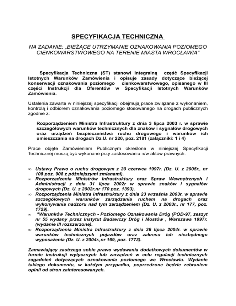 SPECYFIKACJA TECHNICZNA NA ZADANIE: „BIEŻĄCE UTRZYMANIE OZNAKOWANIA POZIOMEGO CIENKOWARSTWOWEGO NA TERENIE MIASTA WROCŁAWIA” Specyfikacja Techniczna (ST) stanowi integralną część Specyfikacji Istotnych Warunków Zamówienia i opisuje zasady dotyczące bieżącej konserwacji oznakowania poziomego cienkowarstwowego, opisanego w III części Instrukcji dla Oferentów w Specyfikacji Istotnych Warunków Zamówienia. Ustalenia zawarte w niniejszej specyfikacji obejmują prace związane z wykonaniem, kontrolą i odbiorem oznakowania poziomego stosowanego na drogach publicznych zgodnie z: Rozporządzeniem Ministra Infrastruktury z dnia 3 lipca 2003 r. w sprawie szczegółowych warunków technicznych dla znaków i sygnałów drogowych oraz urządzeń bezpieczeństwa ruchu drogowego i warunków ich umieszczania na drogach Dz.U. nr 220, poz. 2181 (załączniki: 1 i 4) Prace objęte Zamówieniem Publicznym określone w niniejszej Specyfikacji Technicznej muszą być wykonane przy zastosowaniu n/w aktów prawnych: • • • • • Ustawy Prawo o ruchu drogowym z 20 czerwca 1997r. (Dz. U. z 2005r., nr 108 poz. 908 z późniejszymi zmianami). Rozporządzenia Ministrów Infrastruktury oraz Spraw Wewnętrznych i Administracji z dnia 31 lipca 2002r w sprawie znaków i sygnałów drogowych (Dz. U. z 2002r.nr 170 poz. 1393). Rozporządzenia Ministra Infrastruktury z dnia 23 września 2003r. w sprawie szczegółowych warunków zarządzania ruchem na drogach oraz wykonywania nadzoru nad tym zarządzeniem (Dz. U. z 2003r., nr 177, poz. 1729). "Warunków Technicznych - Poziomego Oznakowania Dróg (POD-97, zeszyt nr 55 wydany przez Instytut Badawczy Dróg i Mostów , Warszawa 1997r. (wydanie III rozszerzone). Rozporządzenia Ministra Infrastruktury z dnia 26 lipca 2004r. w sprawie warunków technicznych pojazdów oraz zakresu ich niezbędnego wyposażenia (Dz. U. z 2004r.,nr 169, poz. 1773). Zamawiający zastrzega sobie prawo wydawania dodatkowych dokumentów w formie instrukcji wytycznych lub zarządzeń w celu regulacji technicznych zagadnień dotyczących oznakowania poziomego we Wrocławiu. Wydanie takiego dokumentu, w każdym przypadku, poprzedzone będzie zebraniem opinii od stron zainteresowanych. CZĘŚĆ I WYMOGI TECHNICZNE OZNAKOWANIA POZIOMEGO CIENKOWARSTWOWEGO 1. W celu spełnienia zadań bezpieczeństwa i sprawności ruchu, oznakowanie poziome winno spełniać następujące wymagania techniczne : 1.1. dobrą widoczność w dzień i w nocy, także podczas opadów deszczu: • widoczność w dzień jest określona współczynnikiem luminancji β o wymaganej wartości min. 0,30 dla oznakowania białego w okresie eksploatacji oraz przez współrzędne chromatyczności x i y dla suchego oznakowania, powinny leżeć w obszarze zdefiniowanym przez punkty narożne wg. WT-W97 tab.6 (IBDiM). • widzialność w nocy określono współczynnikiem luminancji wstecznej (retroodbicie) R (mcd/m2 x lx) mierzonym według DIN 67520, cz. 3(3) lub wg NFP 98-606/1989(4). Dla zapewnienia wystarczającej widzialności w nocy podczas okresu eksploatacji współczynnik luminancji odbitej powinien wynosić 100 mcd/m2 x 1x. 1.2. dobrą i jednoznaczną czytelność oznakowania, • • zapewnienie pełnej jednorodności materiału nanoszonego na nawierzchnię drogi przez wymieszanie na krótko przed rozpoczęciem pracy, przestrzeganie ilości dozowanych materiałów (grubość ułożonego oznakowania), zachowanie prawidłowych wymiarów geometrycznych, 1.3. oznakowanie poziome powinno posiadać wymiary i kształt zgodne z Załącznikiem nr 2 R.M.I. z dnia 3 lipca 2003r. w sprawie „Szczegółowych warunków technicznych dla znaków drogowych poziomych i warunków ich umieszczania” i z dokumentacją projektową oznakowania poziomego • tolerancje w wykonaniu oznakowania poziomego: - szerokość linii nie może być mniejsza od wymaganej, może być nieco większa jednak nie więcej niż 5 mm, - długość linii może być większa lub mniejsza od wymaganej nie więcej niż 50mm, - dla linii przerywanych, długość cyklu składającego się z linii i przerwy nie może odbiegać od średniej liczonej z 10 kolejnych cykli o więcej niż 50 mm długości wymaganej, - dla strzałek, liter, cyfr rozstaw punktów narożnikowych nie może mieć większej odchyłki od wymaganego wielkości niż 50 mm dla wymiaru długości, • odpowiednią szorstkość i trwałość, 1.4. • miarą szorstkości oznakowania jest wartość wskaźnika szorstkości SRT 1 *, mierzona wahadłem angielskim – wymaga się aby wskaźnik szorstkości na świeżym znakowaniu był nie mniejszy niż 45 jednostek SRT, podczas okresu eksploatacji. 2 trwałość oceniana jest jako stopień zużycia w 10 stopniowej skali na zasadzie porównania z wzorcami fotograficznymi wg LCPC 2 * , powinna wynosić co najmniej 6. 1.5 odpowiednią grubość : • oznakowanie cienkowarstwowe powinno być nakładane warstwą grubości 0,3 – 0,8 mm w technologii natryskowej. • CZĘŚĆ II WYKONANIE ROBÓT 1. Przygotowanie podłoża do wykonania znakowania. Przed wykonaniem oznakowania poziomego należy oczyścić powierzchnię nawierzchni malowanej z pyłu, kurzu, smarów i innych zanieczyszczeń. Powierzchnia nawierzchni przygotowana do wykonania oznakowania poziomego musi być czysta i sucha. Wykonawca może rozpocząć roboty po stwierdzeniu, że warunki atmosferyczne w czasie wykonywania robót będą zgodne z warunkami określonymi dla odpowiedniego rodzaju materiału używanego do oznakowania poziomego, oraz w odpowiedniej temperaturze i wilgotności wskazanej przez producenta materiału. Przed przystąpieniem do wykonywania aplikacji należy wytyczyć (wytrasować) na nawierzchni wszystkie elementy tego oznakowania, takie jak: linie ciągłe, przerywane, pojedyncze lub podwójne, napisy, symbole, strzałki oraz inne elementy zgodnie z Załącznikiem nr 2 R.M.I. z dnia 3 lipca 2003r. w sprawie „Szczegółowych warunków technicznych dla znaków drogowych 